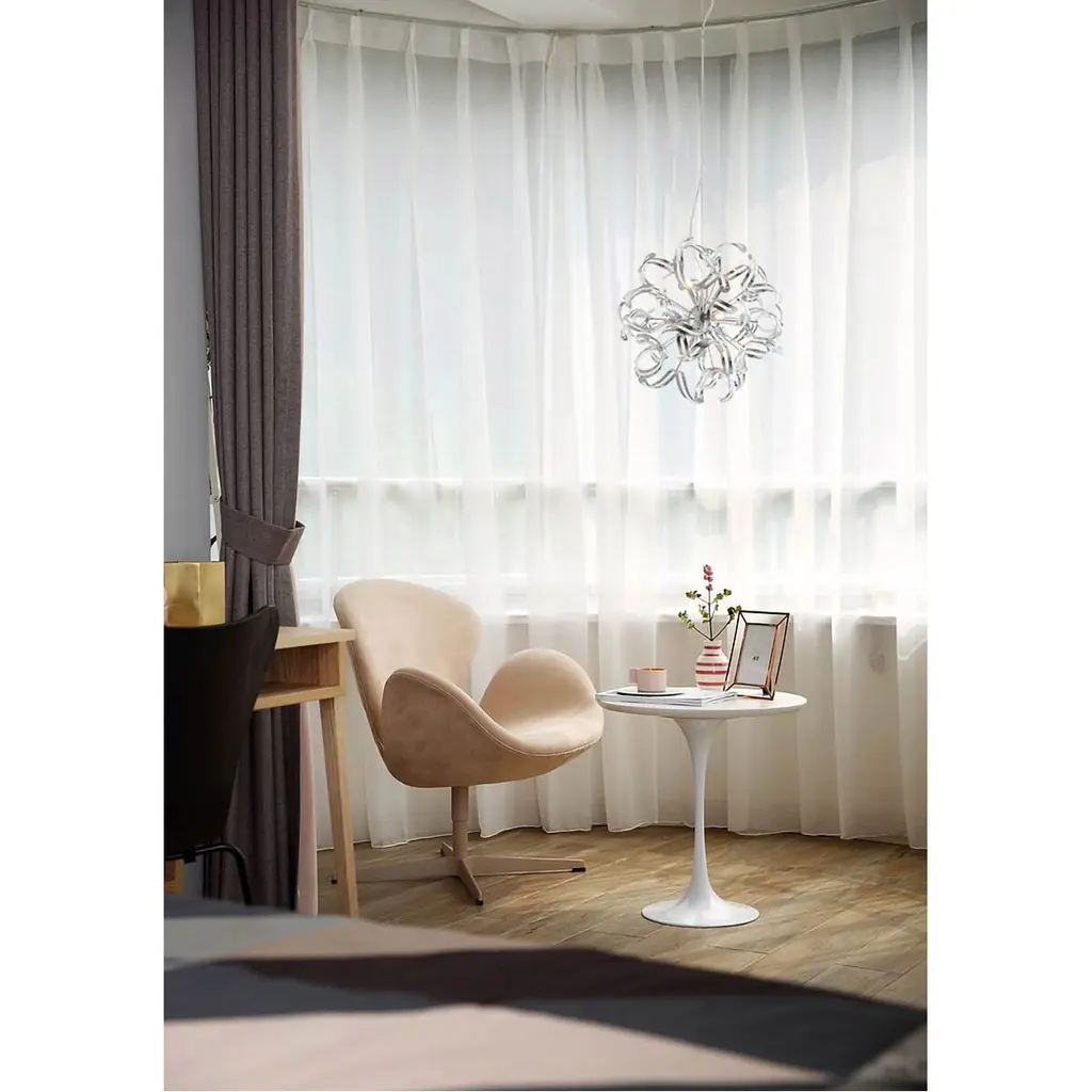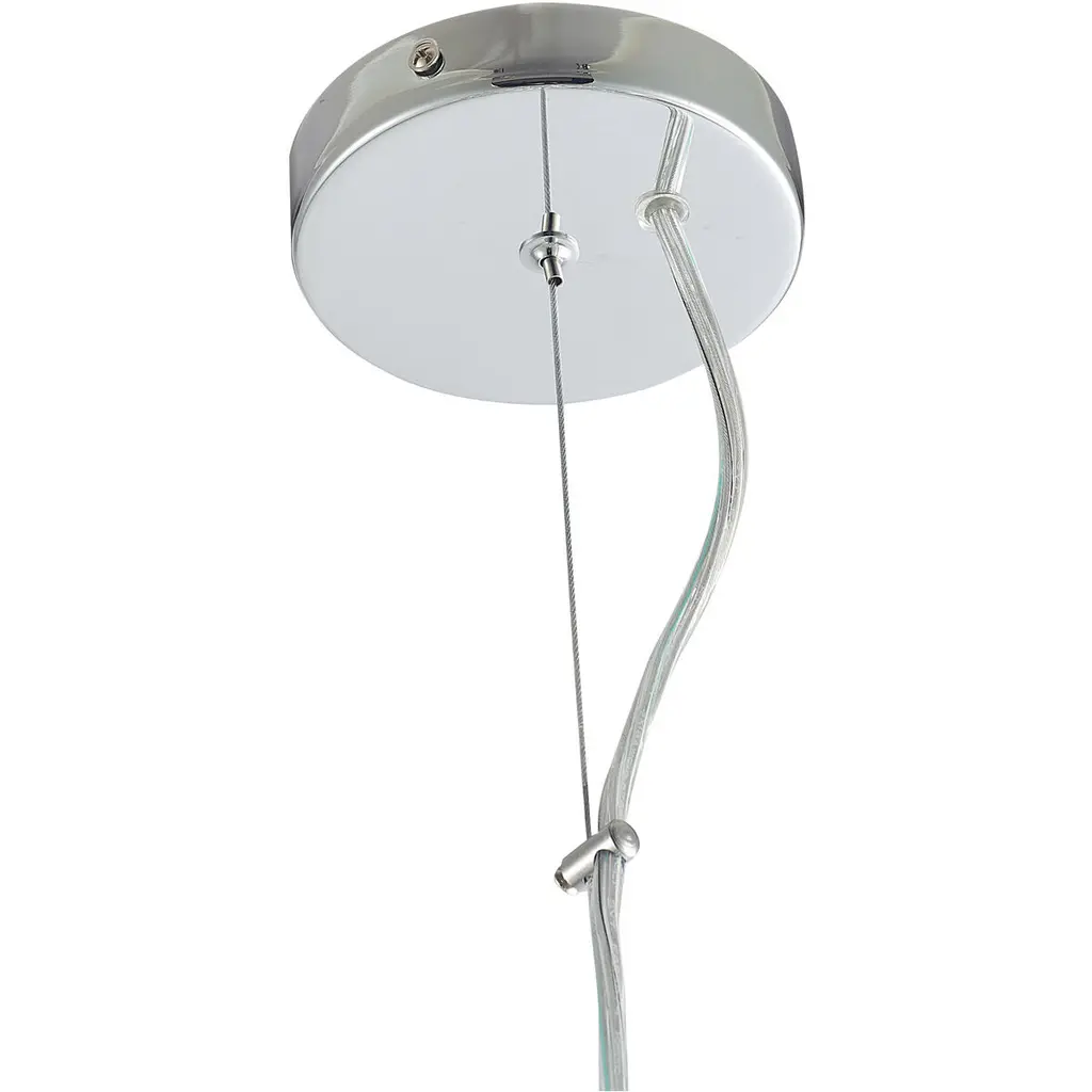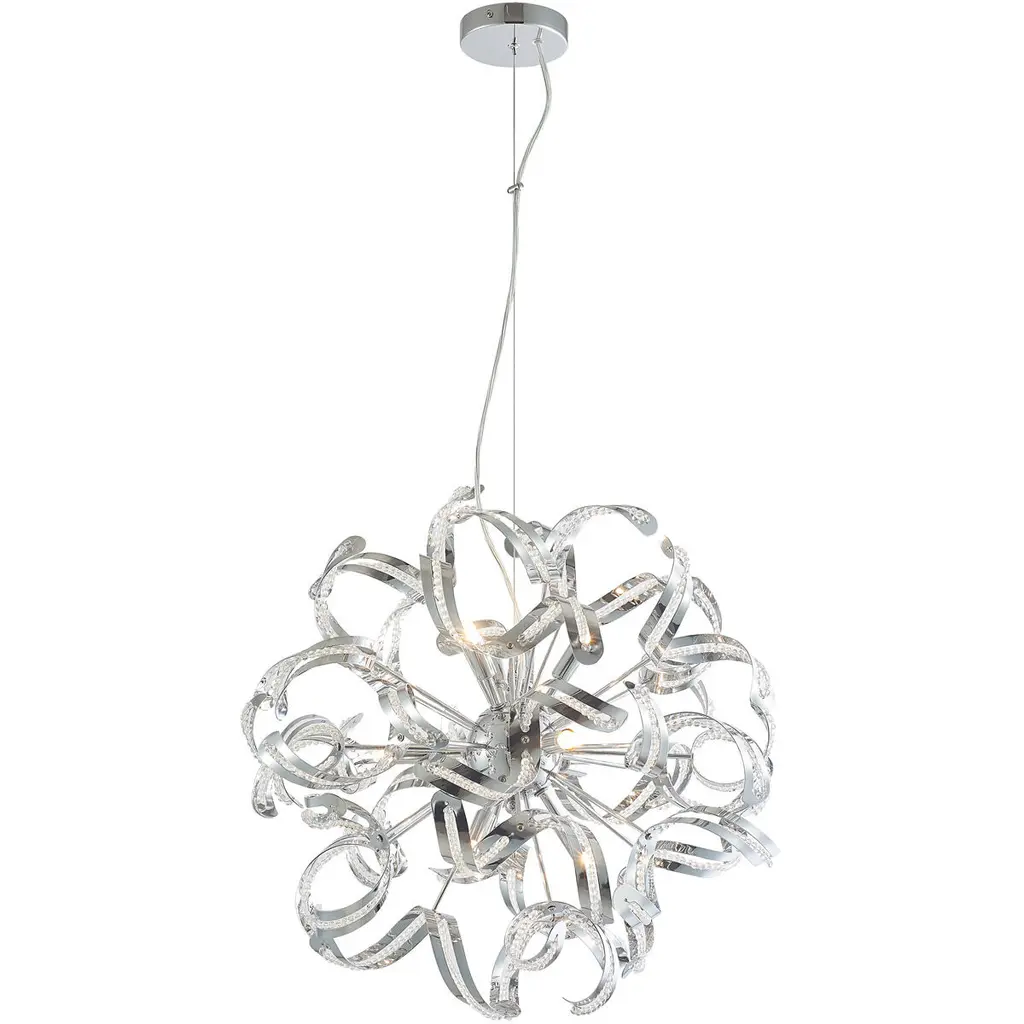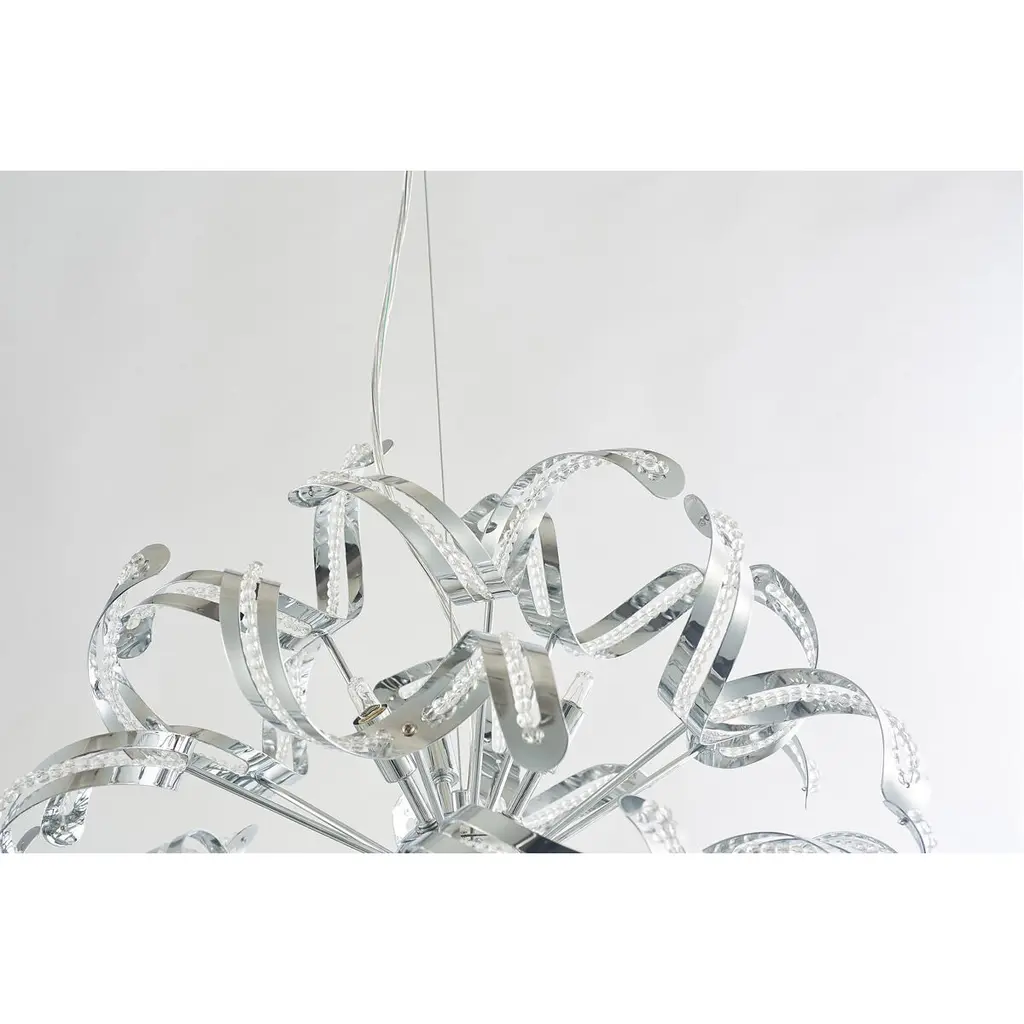 This exquisite chandelier is in a chrome finish. The frame is made out of metal, and it comes with clear crystal beaded swirls. The adjustable cord link makes fixture suitable for most ceiling heights.