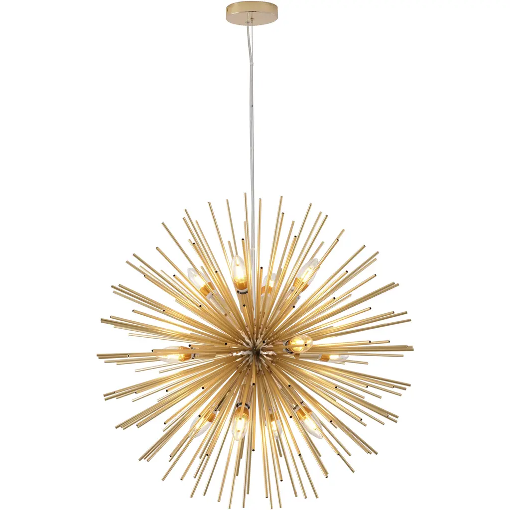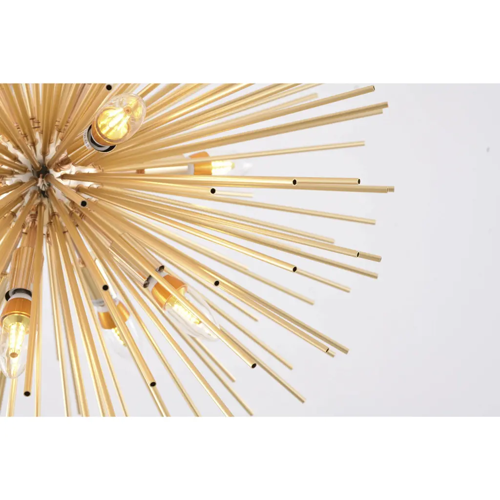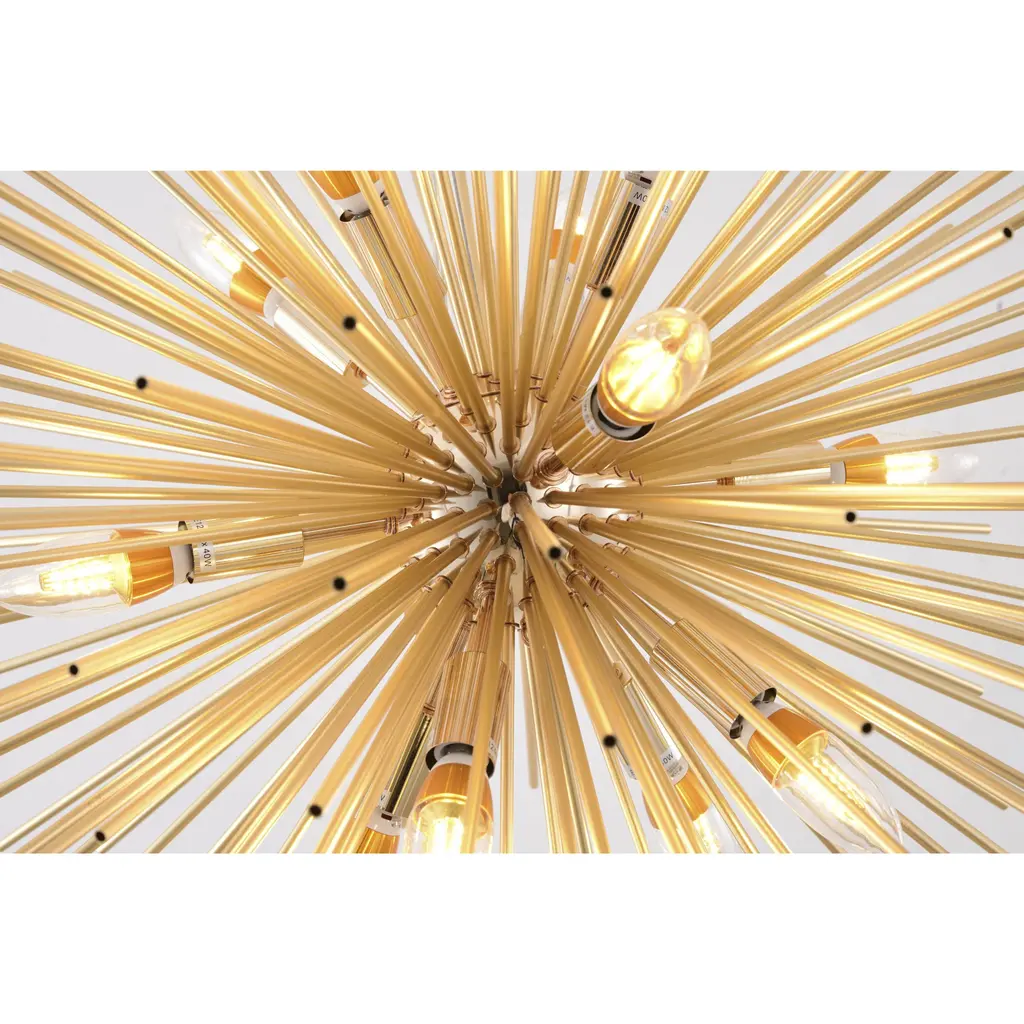 This transitional chandelier is a unique and stylish lighting fixture that adds a touch of sophistication to any room. Featuring a brass iron sputnik frame, this fixture measures 27.5 inches in diameter. The 9xE12 base and 40W bulbs (Bulbs Not Included) provide ample lighting, while the brass iron frame creates a modern and elegant ambiance. Perfect for living rooms, dinning rooms, hallways, or entryways, this chandelier is an excellent choice for anyone looking to add some glamour and sophistication to their space.