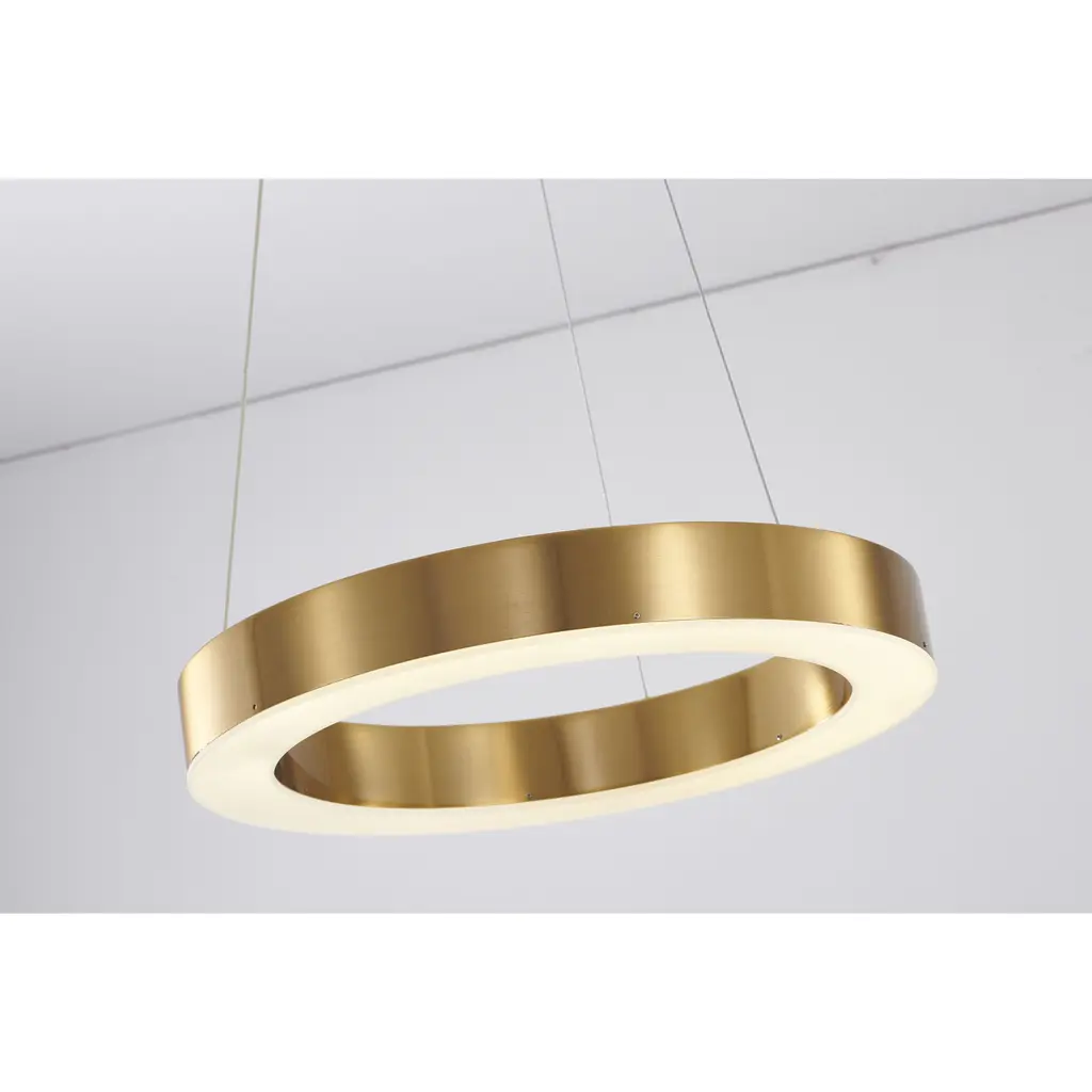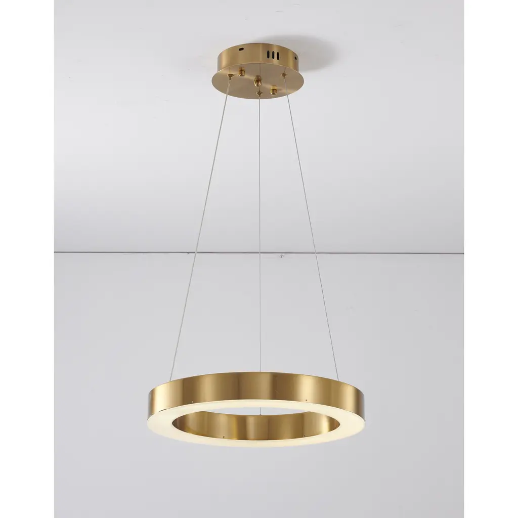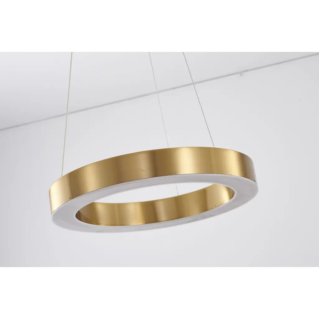 This exquisite LED chandelier is in a gold finish. The frame is made out of metal in a halo ring shape, and the LED bulb is integrated into the frame. The adjustable cord links make this fixture suitable for most ceiling heights.