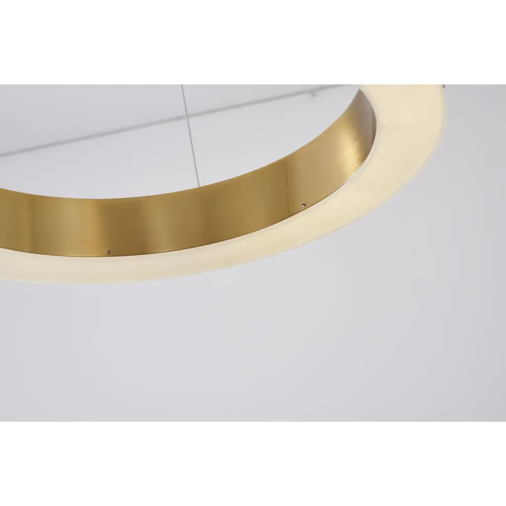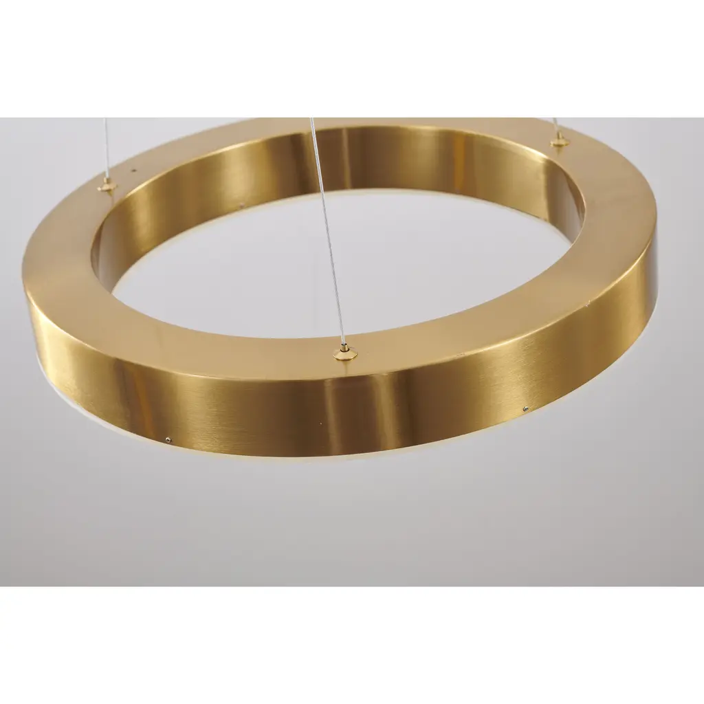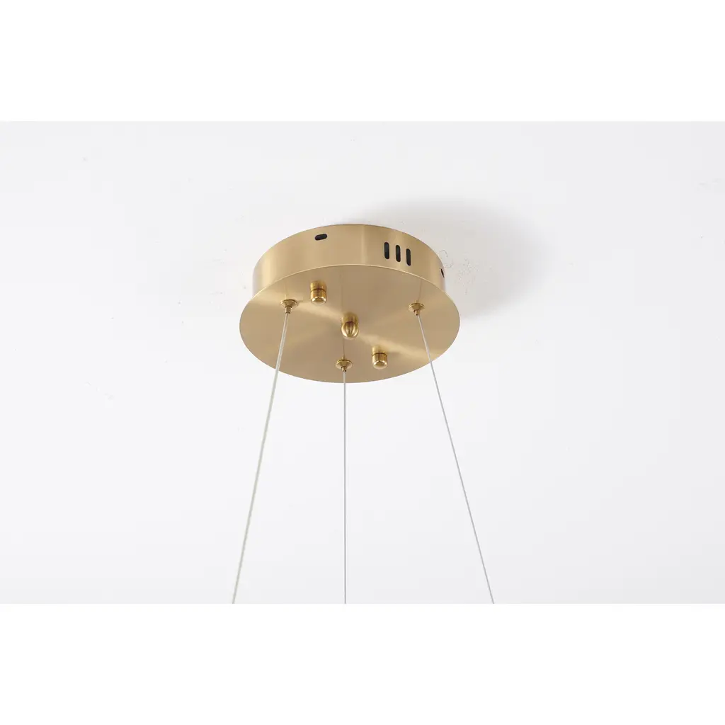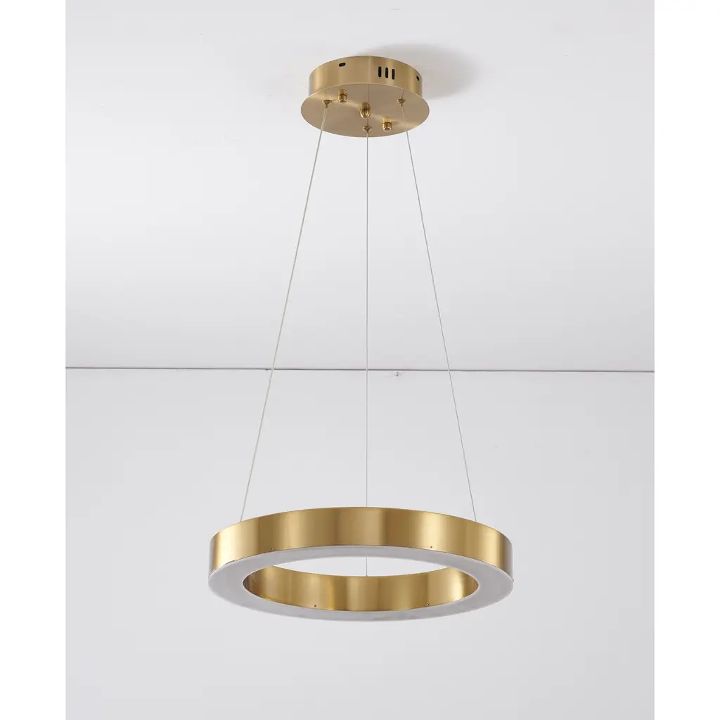 This exquisite LED chandelier is in a gold finish. The frame is made out of metal in a halo ring shape, and the LED bulb is integrated into the frame. The adjustable cord links make this fixture suitable for most ceiling heights.