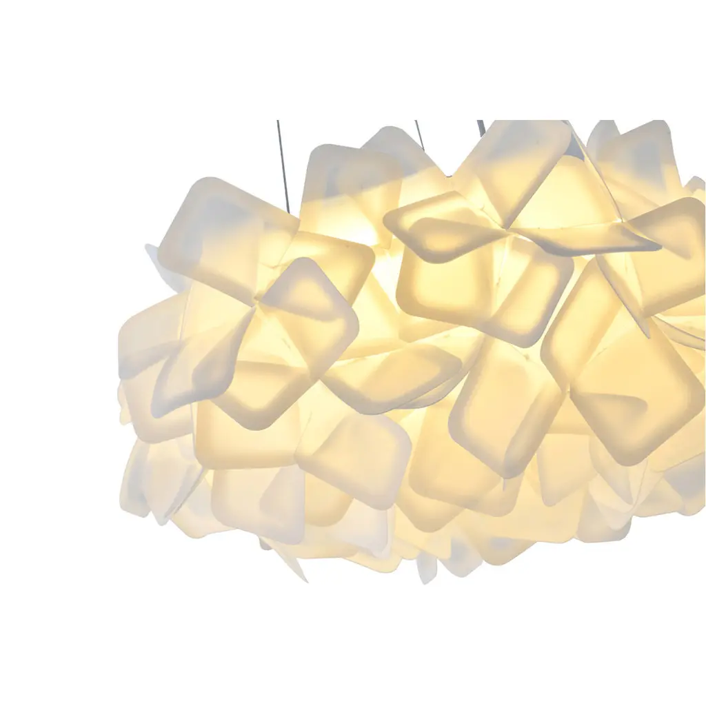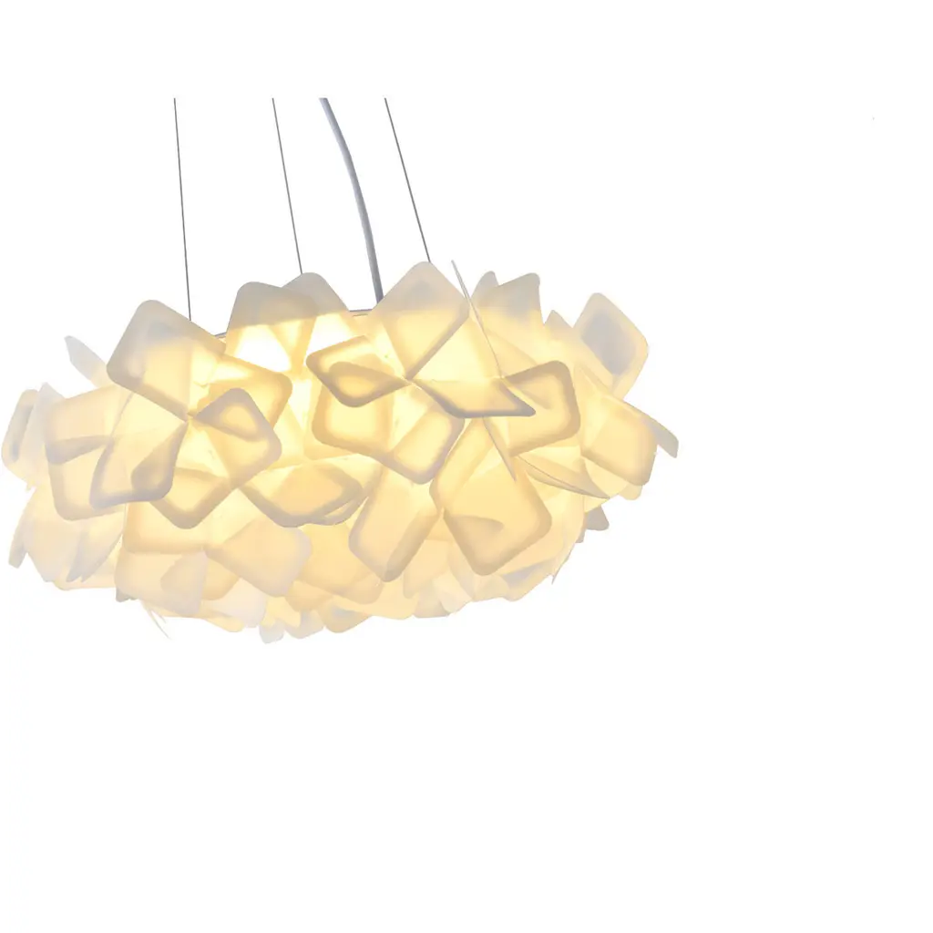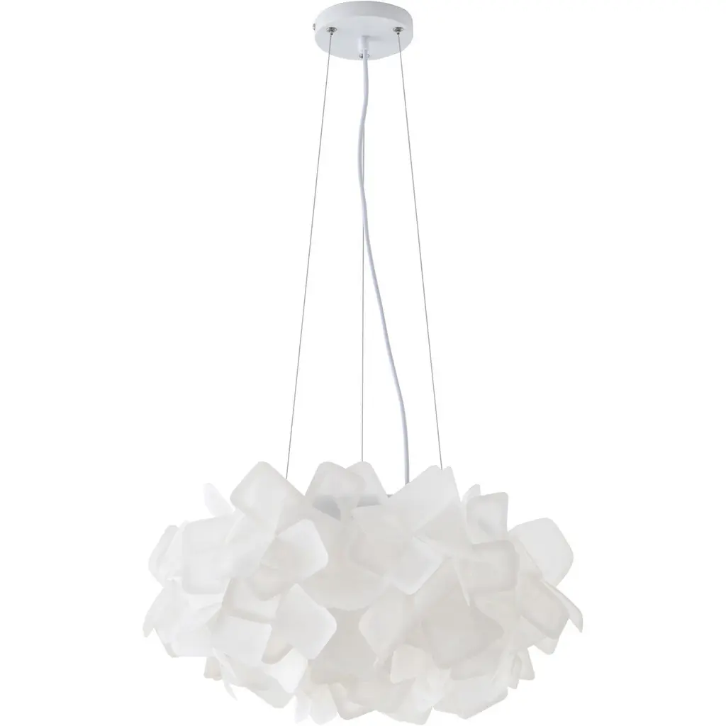 This unique LED chandelier is in a white finish. The frame is made out of metal, and the LED bulb is integrated into the frame. It comes with a clear acrylic shade in an abstract cloud shade. The adjustable cord links make this fixture suitable for most ceiling heights.
