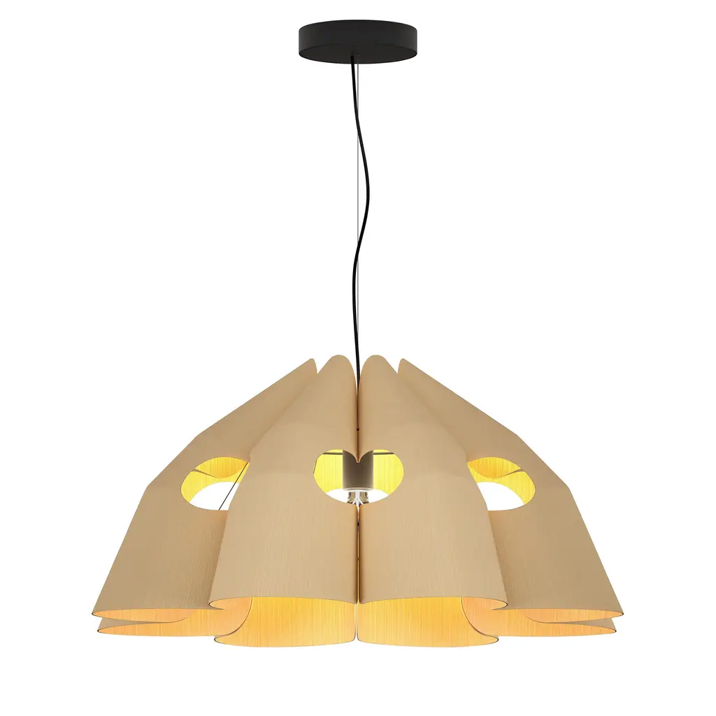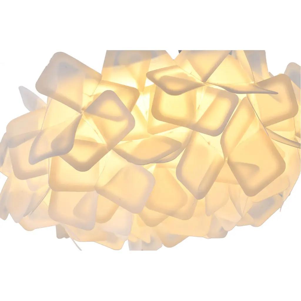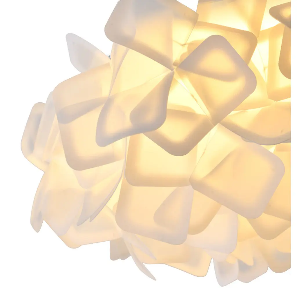 This unique LED chandelier is in a white finish. The frame is made out of metal, and the LED bulb is integrated into the frame. It comes with a clear acrylic shade in an abstract cloud shade. The adjustable cord links make this fixture suitable for most ceiling heights.