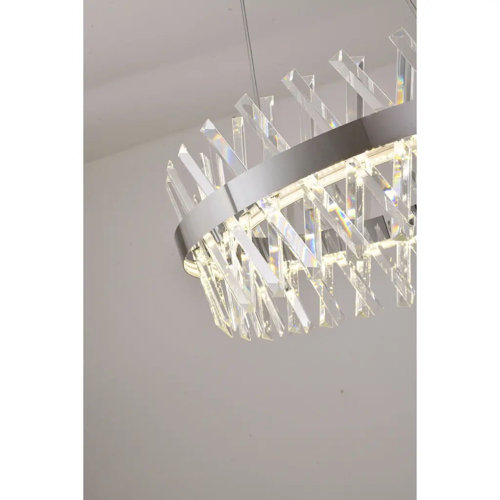 This 1-Light dimmable transitional LED chandelier presents a unique design that works beautifully in any living room, entryway, foyer, bedroom, or dinning room. Crafted with a chrome iron frame and clear crystal accents, the fixture blends function with style for a unique look that is sure to impress. The LED bulbs are integrated into the frame. The adjustable cord link makes this fixture suitable for most ceiling heights.