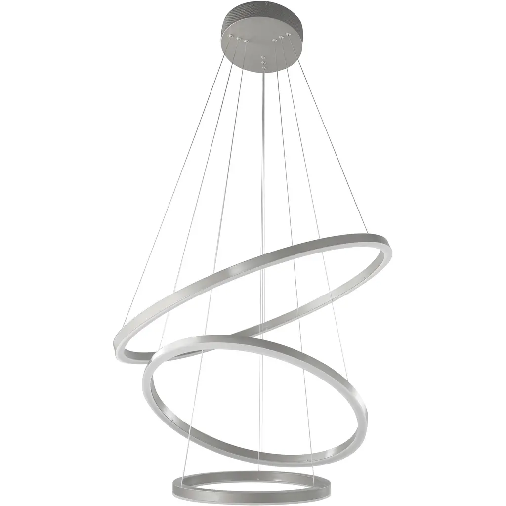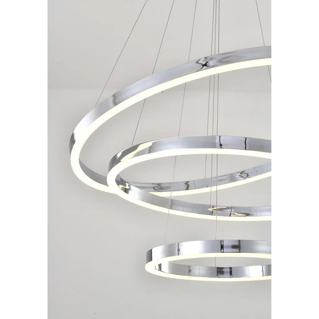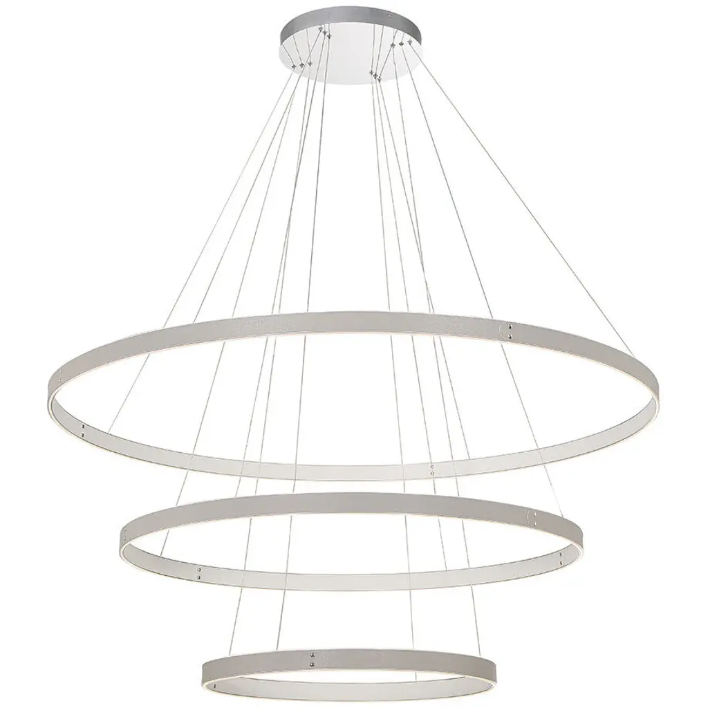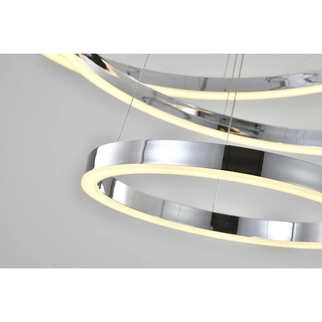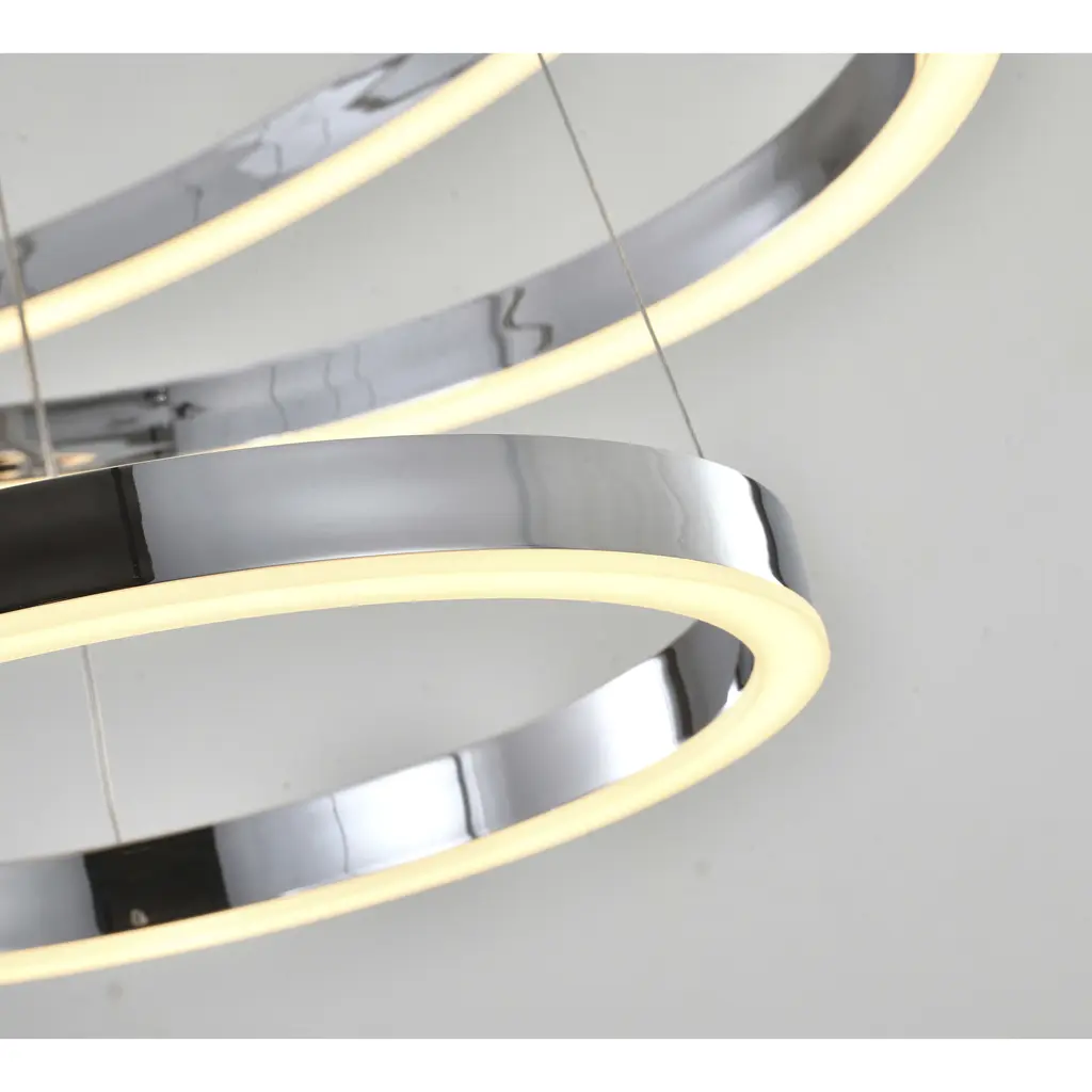 This dimmable LED chandelier is a transitional and sleek lighting fixture that features a chrome frame and a triple-ring design. With a large and imposing presence, it measures 31.5 inches, 23.6 inches, and 15.7 inches in diameter, and 38.2 inches in height, making it a statement piece for any room. This triple-ring light is powered by 135W of LED technology, which provides a warm and cozy glow with a color temperature of 3000K. The chrome frame gives it a sleek and modern look, while the triple-ring design adds a touch of sophistication. This fixture is perfect for use in living room, dinning room, or foyer