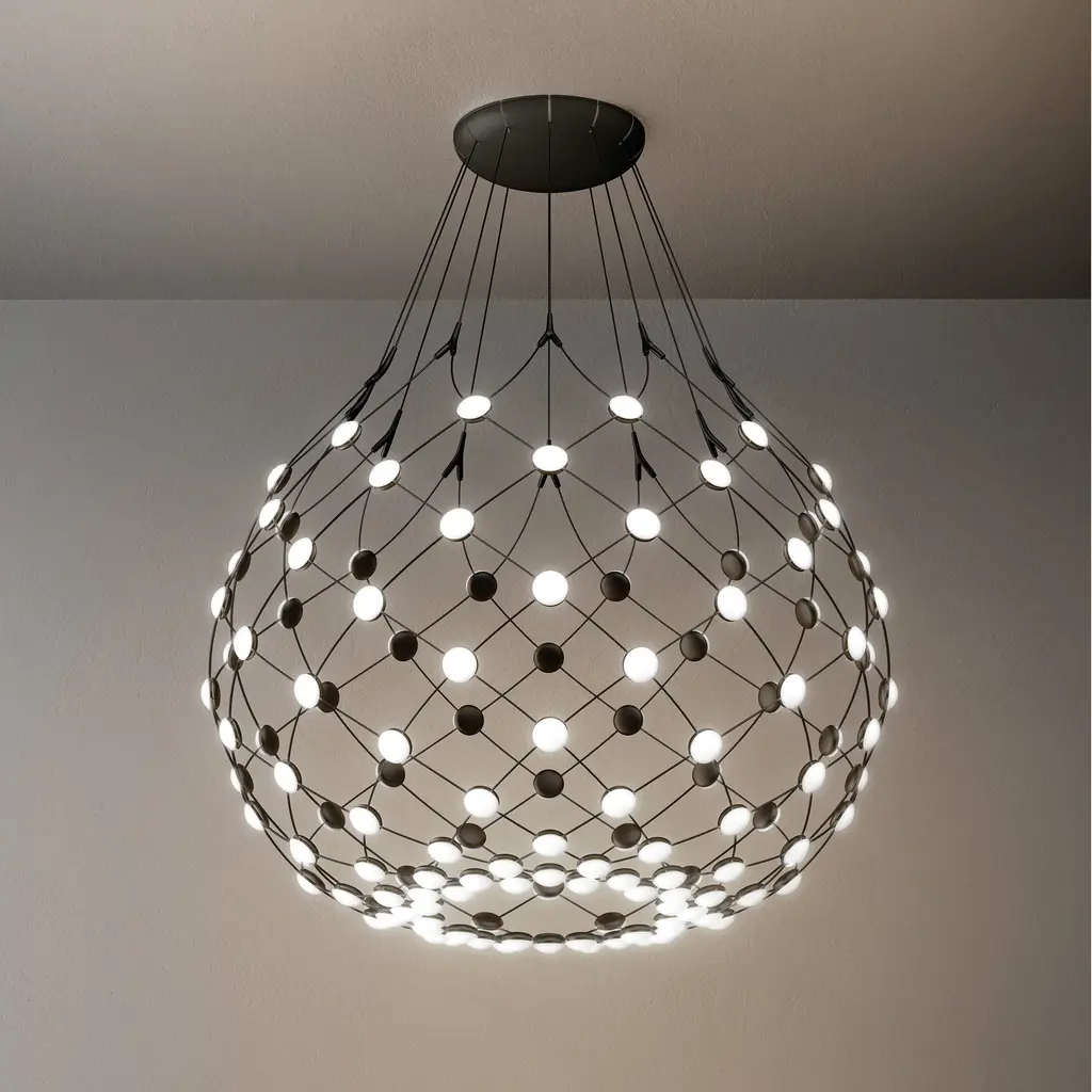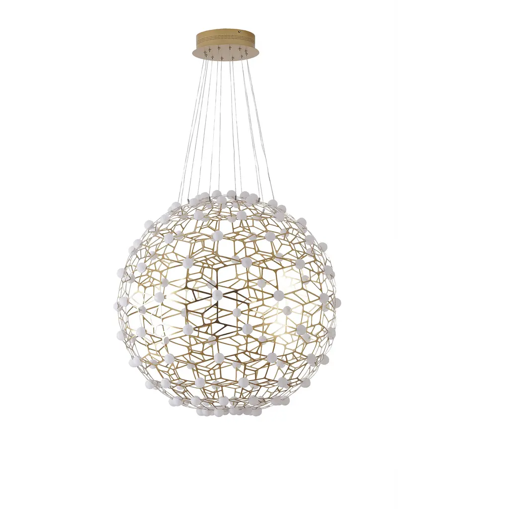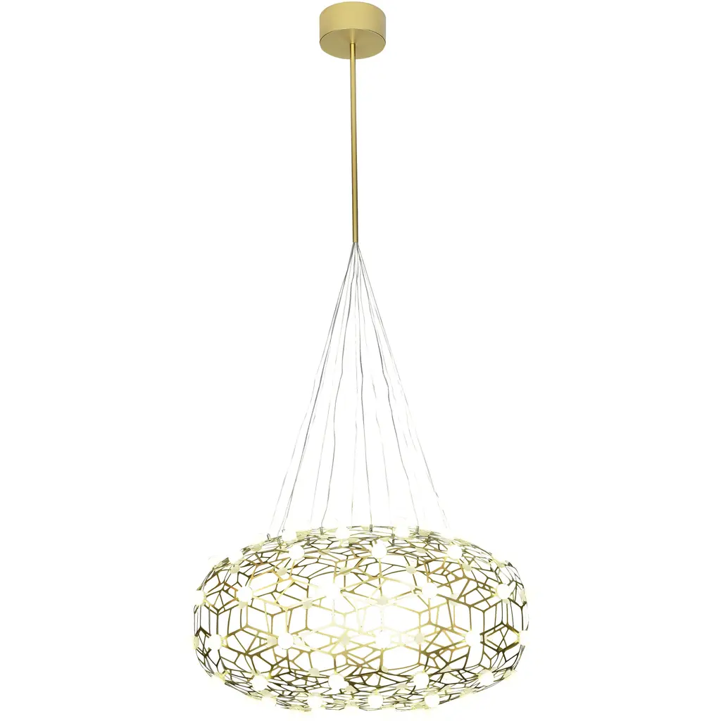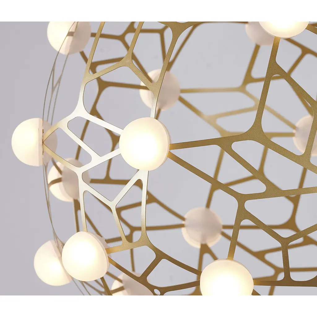 If you are looking for a light source for your living room, foyer, or dinning room, this dimmable contemporary LED chandelier can easily fit into your modern home décor. Crafted with a gold iron frame in honeycomb ORB shape and white acrylic diffusers. The LED bulbs are integrated into the frame. The adjustable cord links make this fixture suitable for most ceiling heights.