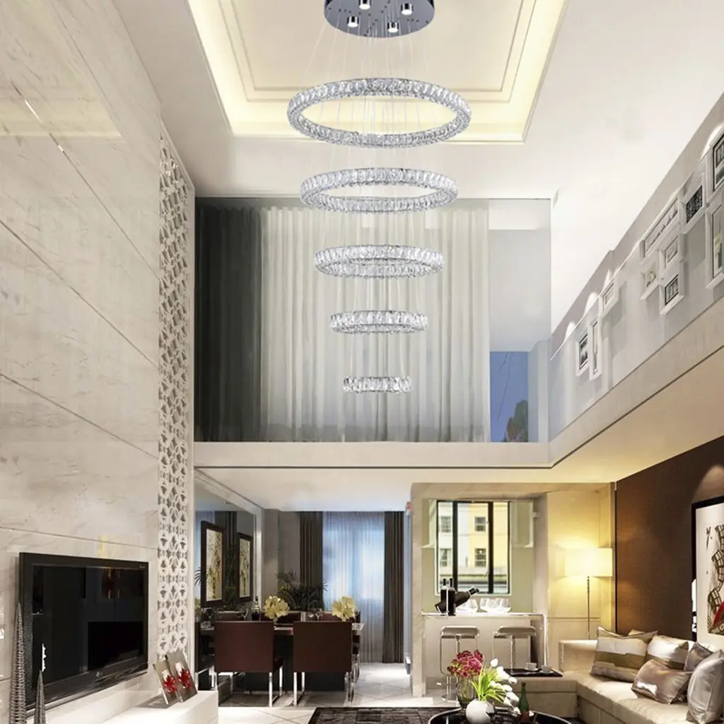 This transitional dimmable LED rings chandelier is a showstopping addition to any room. Measuring 31 inches in diameter and 98 inches in height, it's a substantial and impressive piece that provides a dramatic and eye-catching display of light. The triple sided design features five crystal rings, each with a unique LED lighting pattern, creating a mesmerizing visual effect. The LED lights are energy-efficient and have a 4000K color temperature, providing a bright and cool white light. This makes it perfect for illuminating a large space, such as a foyer, staircase, living room, or dinning room.