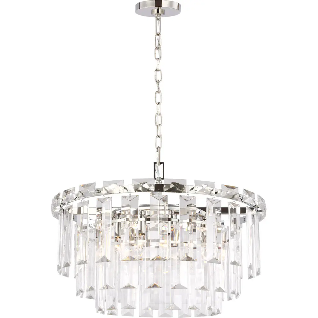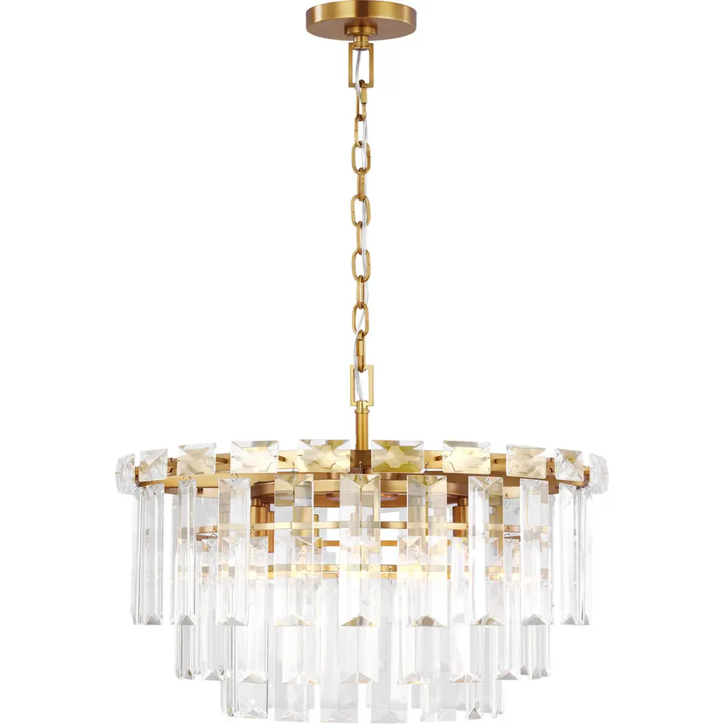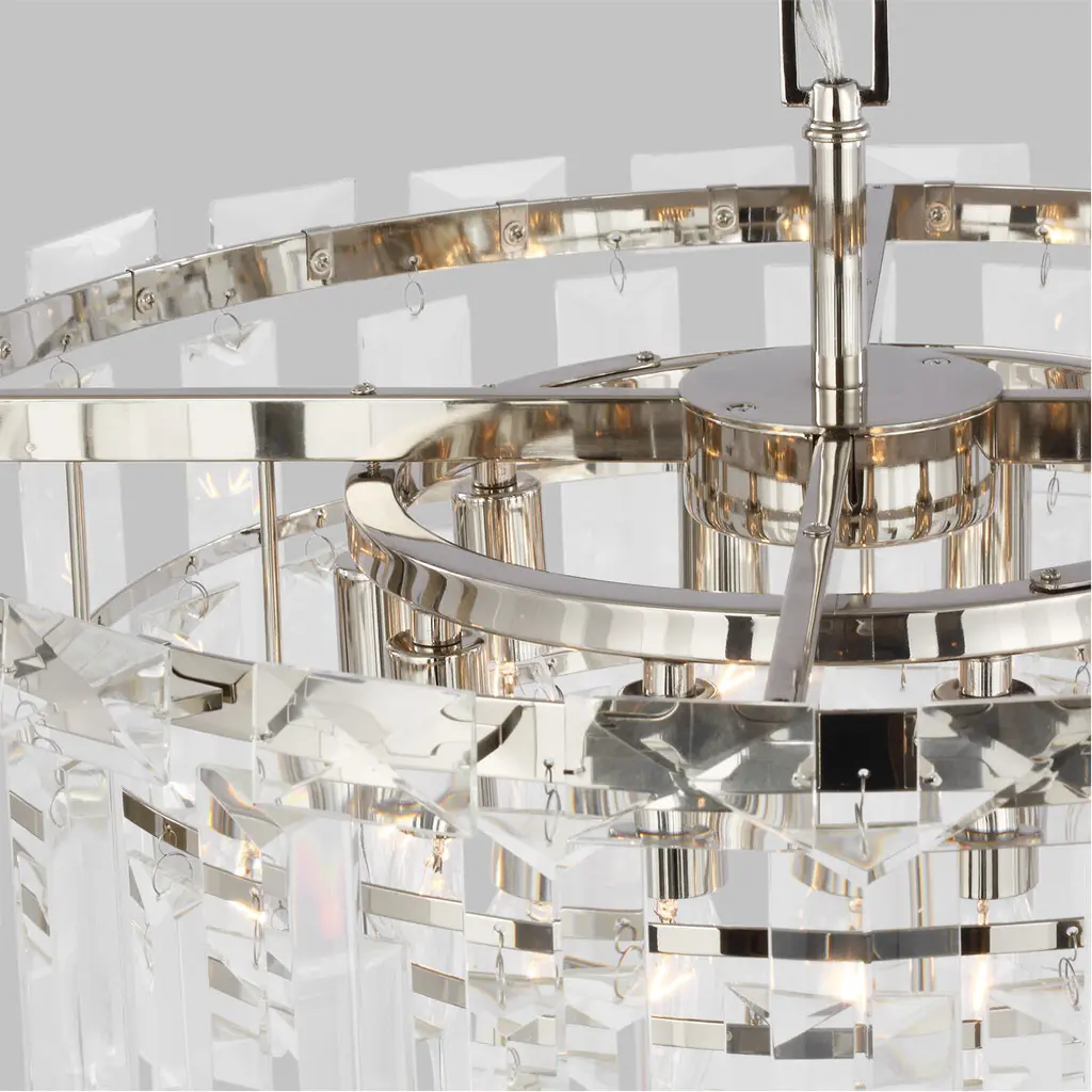 Inspired by the Art Deco style of 1920s Paris, the Arden series from C&M by Chapman and Myers captures the period's fascination with geometric forms. A stunning addition to an entryway, great room, or above a large dining table, the Arden tiered chandelier features panels of textured glass that hang in linear architectural tiers from a solid metal frame.