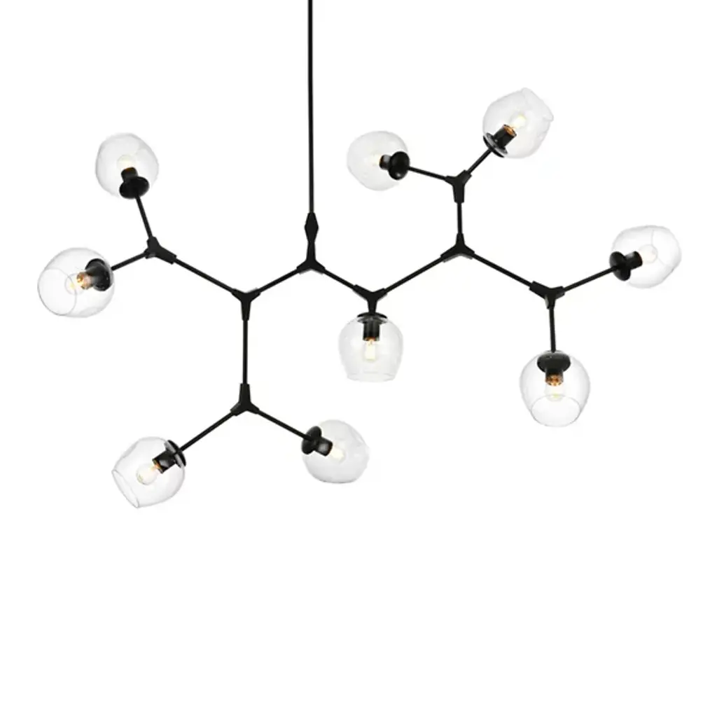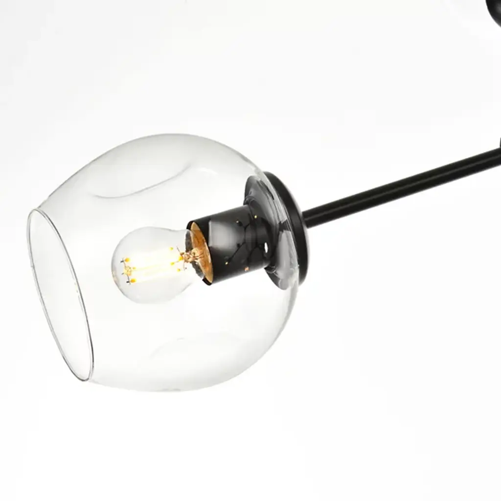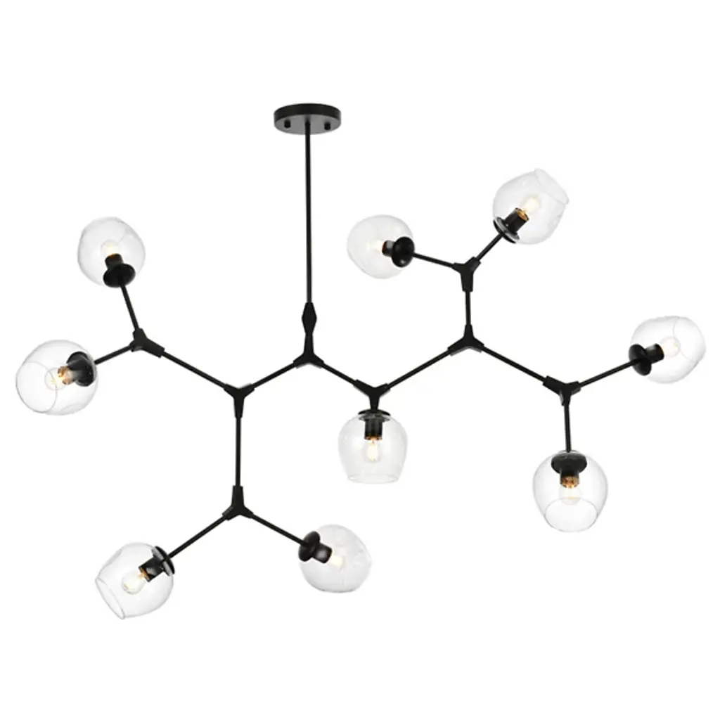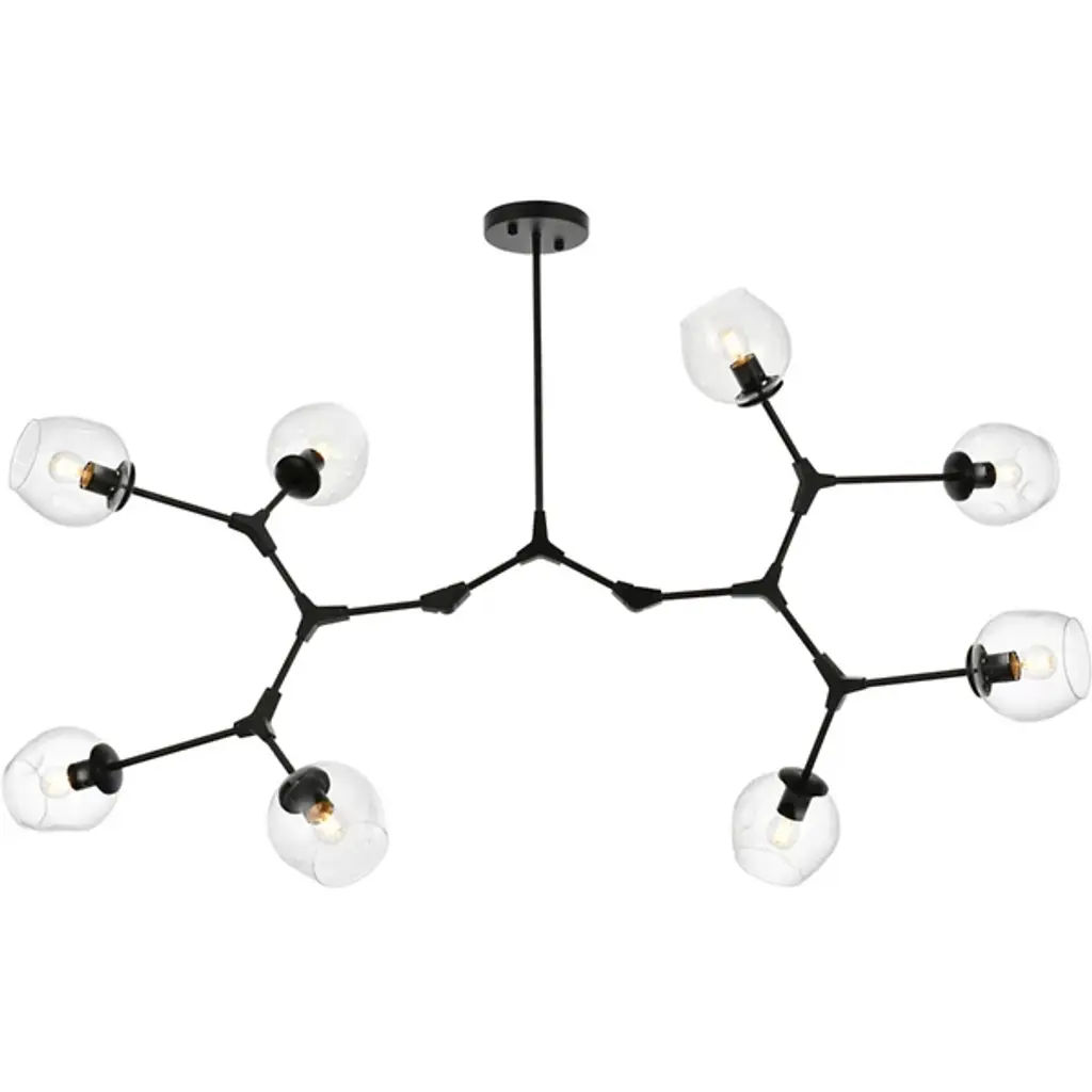 The Canilie Chandelier from Huxe perfectly fuses contemporary design with geometric allure. The fixture is fashioned from durable iron, creating a visually captivating centerpiece that adds a smooth modern aesthetic and creates a robust lighting design. The metal frame supports a series of lights placed inside clear glass cup shades, creating a stunning visual display. Its UL certification guarantees safety and performance, making it an ideal choice for spaces that embrace Mid-Century Modern and Transitional design styles.