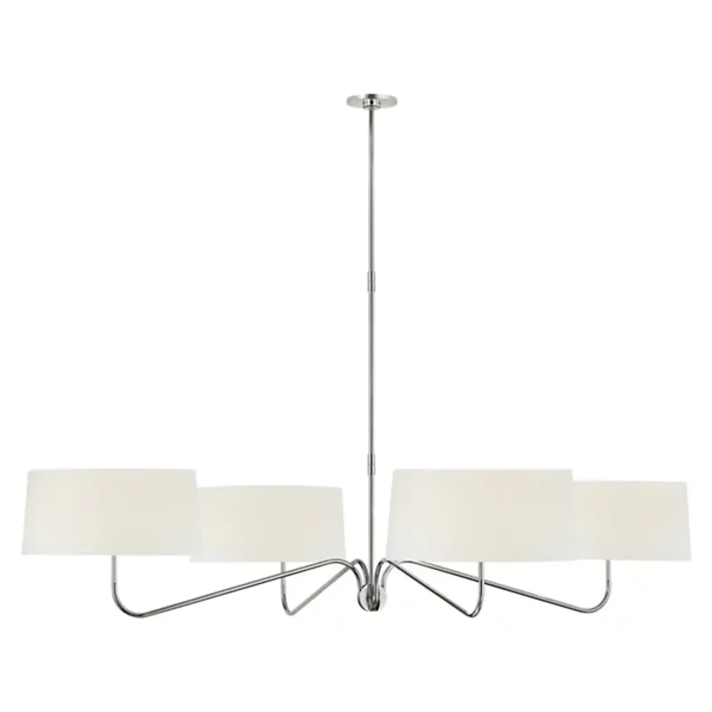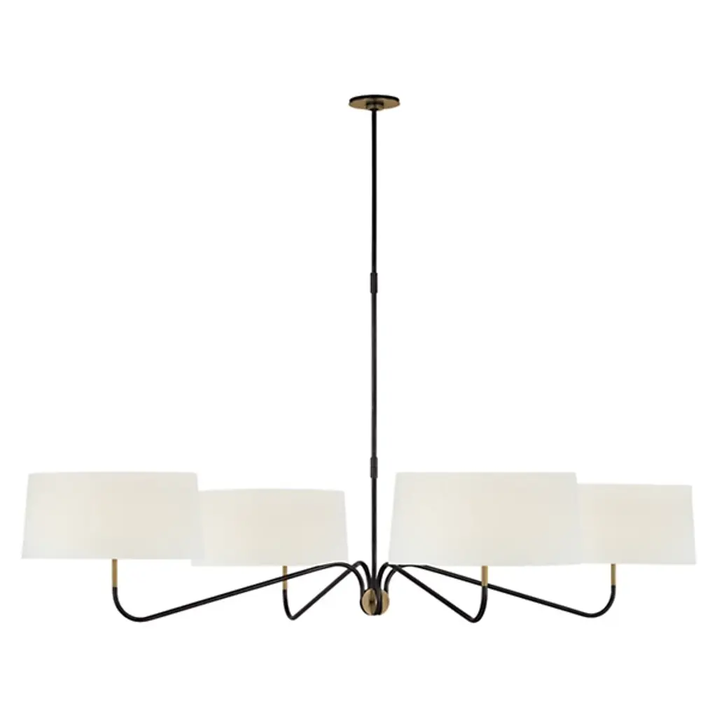 The Canto Grande Four Arm Chandelier from Visual Comfort Signature is designed by Thomas O'Brien. This chandelier is a statement piece. A round brass supporting addendum that forms a focal point, captivating the eye and serving as a foundation for the design. From this central element gracefully extends a collection of curved arms that lend an edge to the fixture. Adorning these sinuous arms are linen shades that take on drum shapes, reflecting an industrial aesthetic.