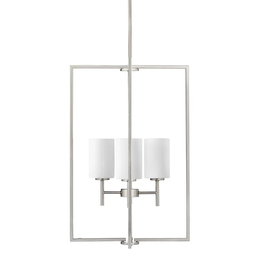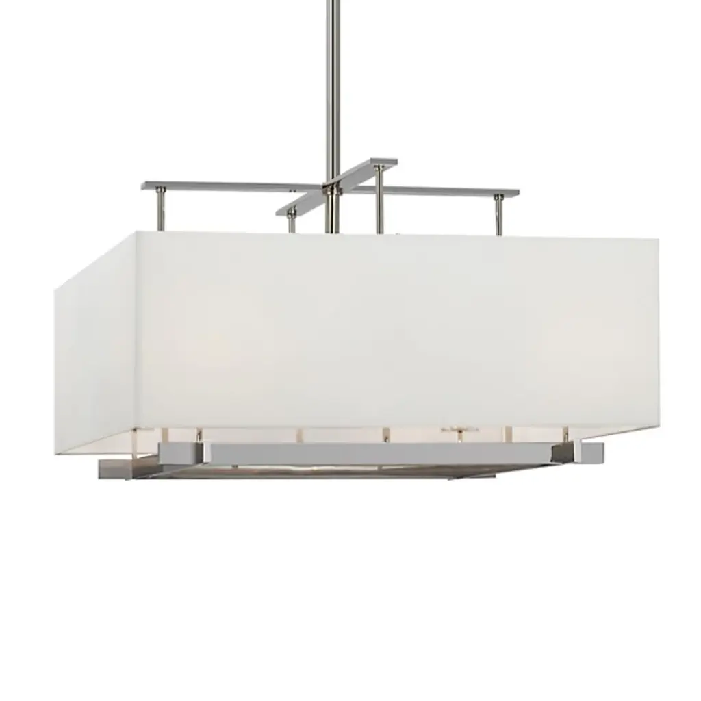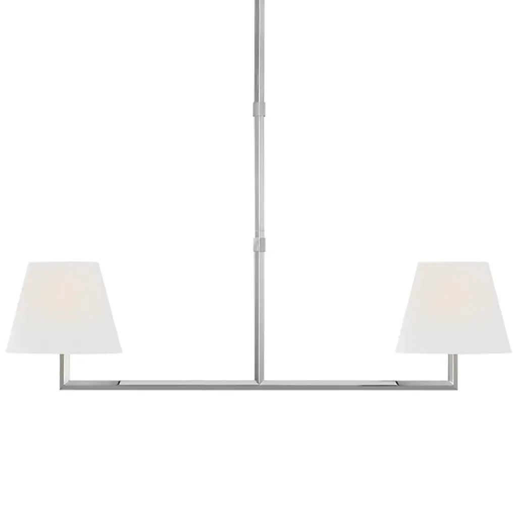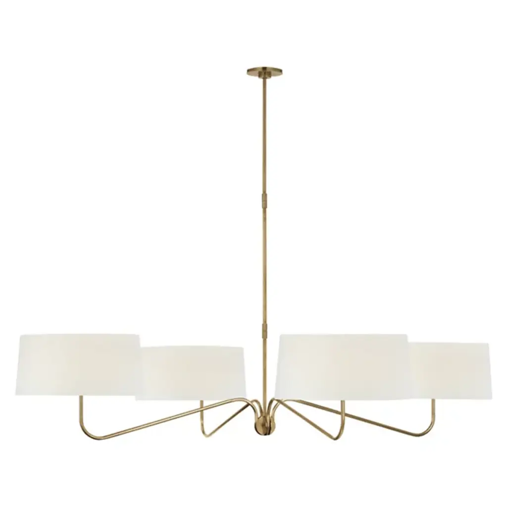 The Canto Grande Four Arm Chandelier from Visual Comfort Signature is designed by Thomas O'Brien. This chandelier is a statement piece. A round brass supporting addendum that forms a focal point, captivating the eye and serving as a foundation for the design. From this central element gracefully extends a collection of curved arms that lend an edge to the fixture. Adorning these sinuous arms are linen shades that take on drum shapes, reflecting an industrial aesthetic.