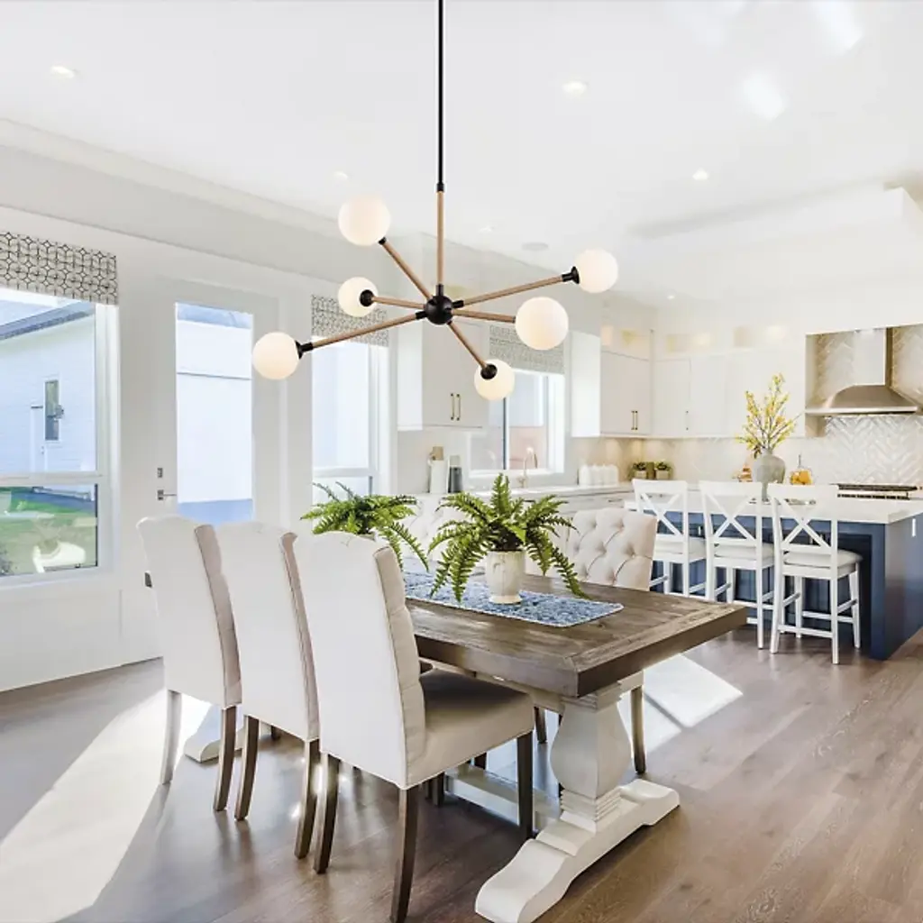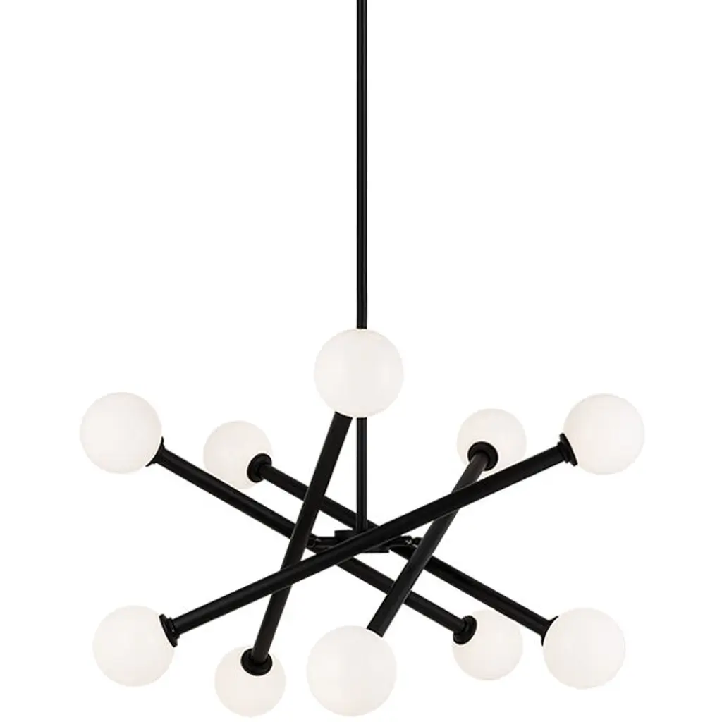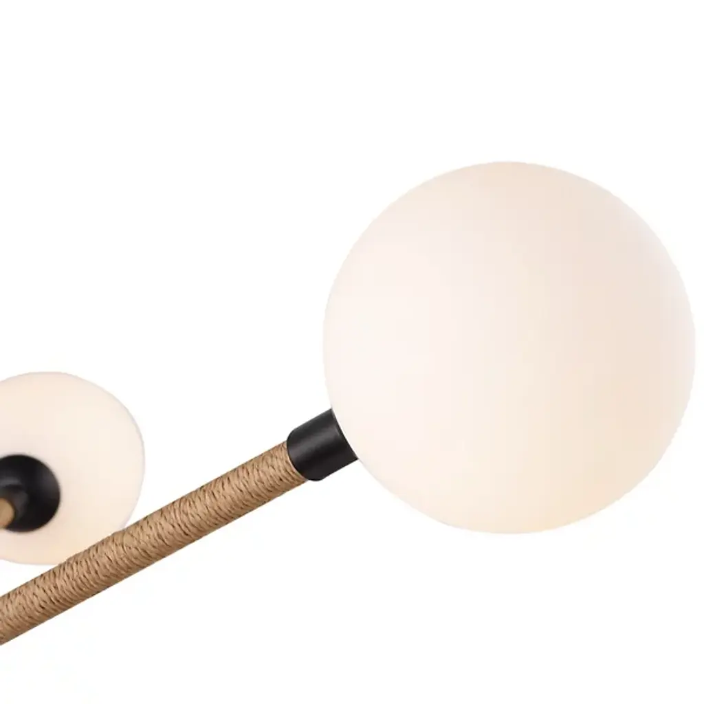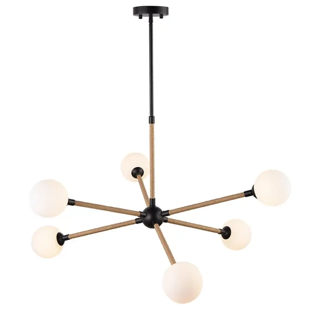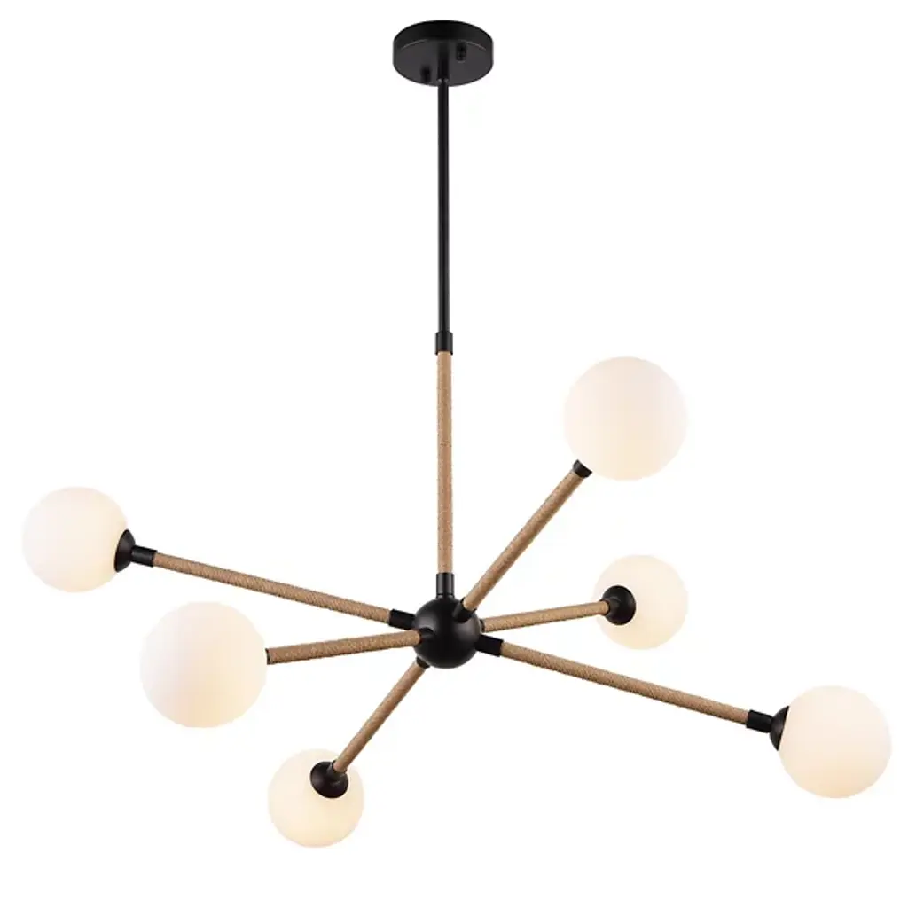 The Capilano 6 Light Chandelier from Artcraft presents an elegant design enveloped in stylish natural jute, beautifully complemented by a sleek black metal frame and circular white acid glassware. This fixture boasts clean lines that enhance its overall aesthetic appeal, making it a sophisticated addition to any space. The careful integration of these elements creates a visually appealing and attractive lighting solution, perfect for those seeking a blend of rustic charm and modern elegance in their decor.