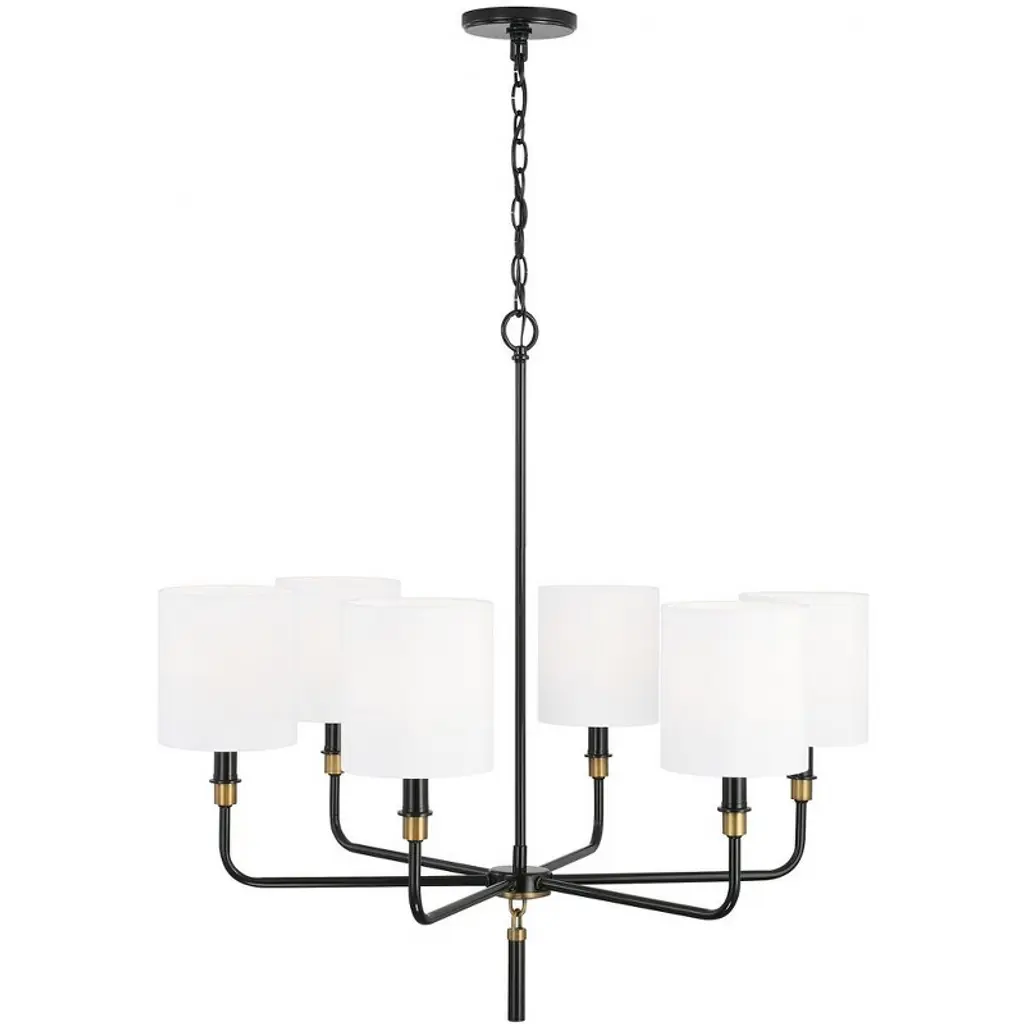 The striking contrast of Glossy Black with tailored fabric shades gives a perfectly polished look to the Beckham 6-Light Chandelier. The solid metal tassel detail is accented with Aged Brass loops for a sleek silhouette that is both bold and refined. APPLICATIONS: Perfect for use in kitchens and dining rooms. The refined use of aged brass accents over a glossy black frame, punctuated by wide conical white fabric shades creates a true statement piece EASY TO INSTALL: Replacing an existing fixture is easy with the included instructions and can be finished in as little as 15 minutes with a few simple hand tools. VERSATILE: Dimmable and LED/CFL/Incandescent compatible, uses six 60-Watt (max) E12 candelabra base bulbs (Not Included) DIMENSIONS: Adjustable Height (from 34.5 inch to 157.5 inch), 32 inchW x 31.5 inchH; includes 10' of chain and 15' of wire. RELIABLE: Includes 1-Year Limited Manufacturer's Warranty. Warranty: 1 Year Room Recommendation: Dining Room/Living Room/Bedroom/Home Of