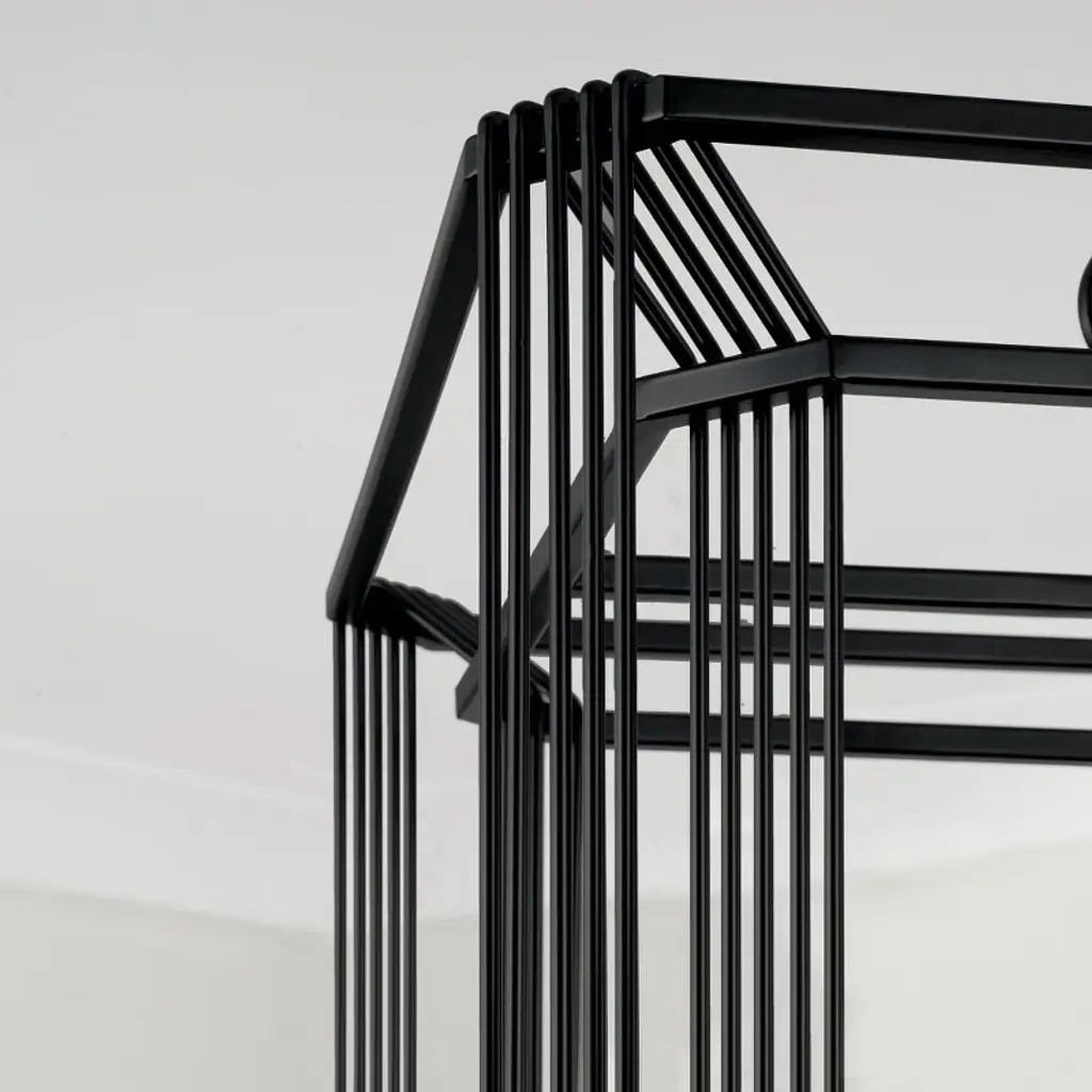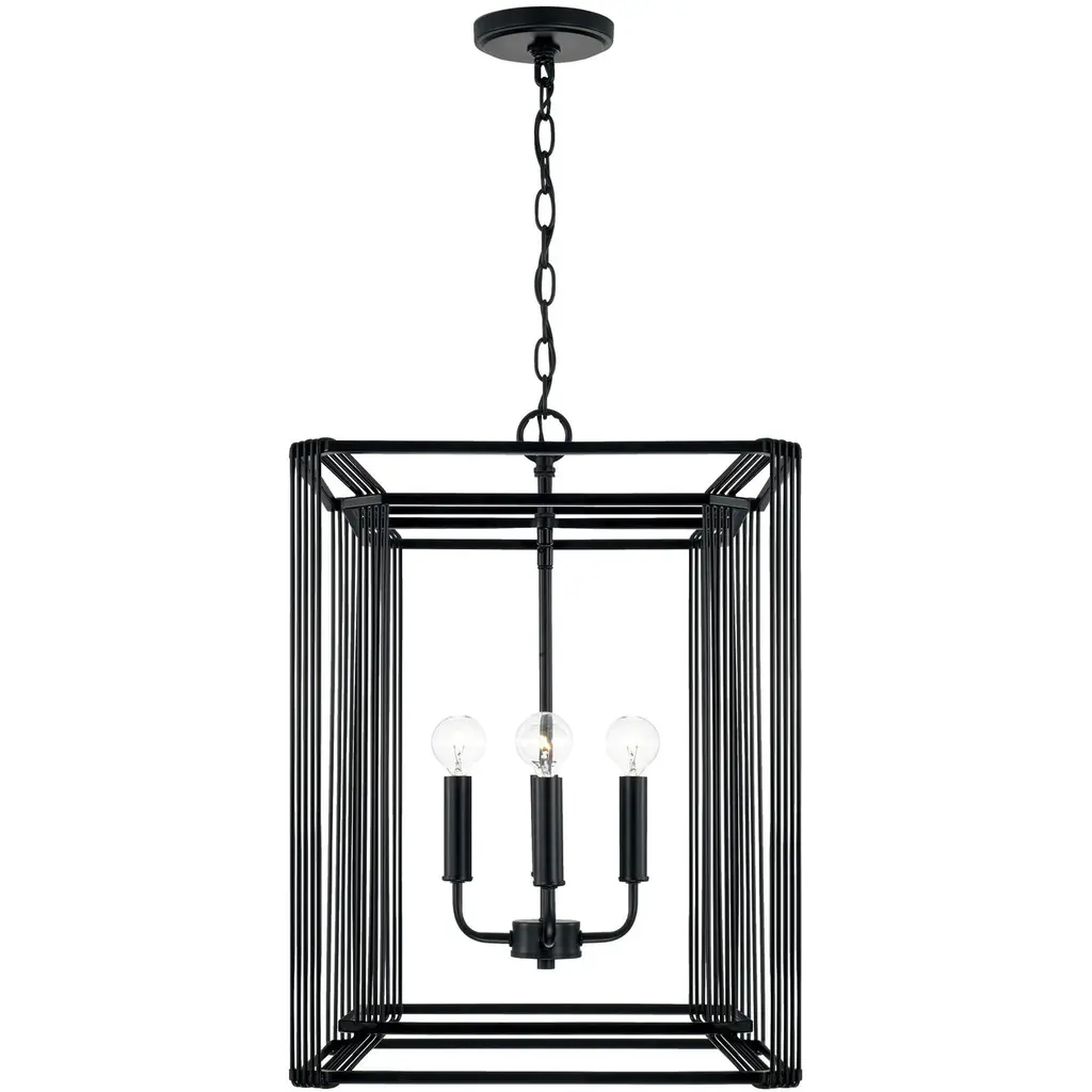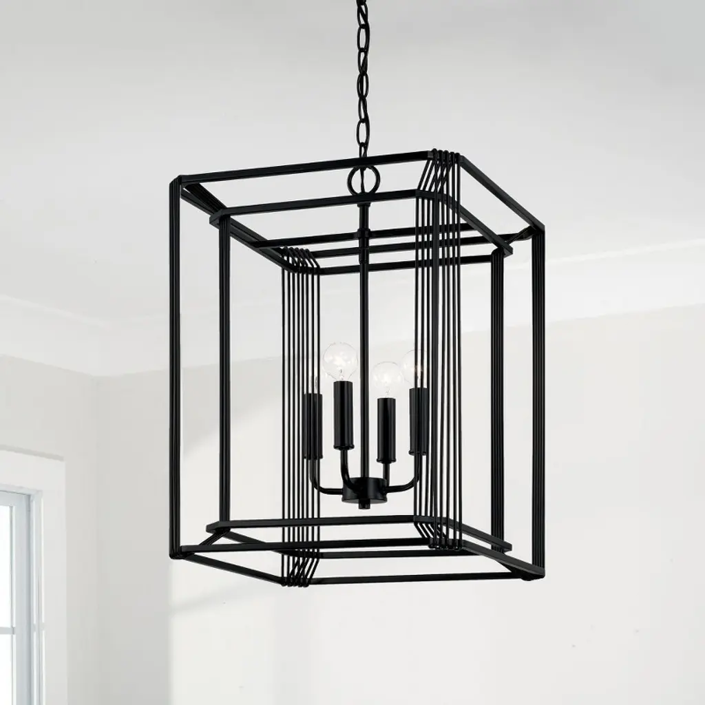 Intricately wrapped metaldetails create amesmerizing configuration with the Lennon Foyer.The Matte Black finish punctuates the open-air lantern design forstreamlined sophistication. DIMENSIONS: Overall: 16"W x 22.5"H; Adjustable Hanging Height: 26.5" - 148.5"; Includes 120" of chain and 180" of wire. DETAILS: Thin metal bands encompass the two layers that make up the cube shaped frame and add visual interest. FINISH: Matte Black is a powder coated, muted, neutral tone. BULBS: Designed to be dimmable and LED/CFL/Incandescent bulb compatible, this fixture uses 4 - 60 Watt (max) E12 Candelabra base bulbs (not included). It's shown here with a G16 lamp. FEATURES: Rated for dry locations; includes a 1-Year Manufacturer Warranty. Mounting Direction: Up Canopy Included: Yes Canopy Diameter: 5.00 Chain Length: 120.00