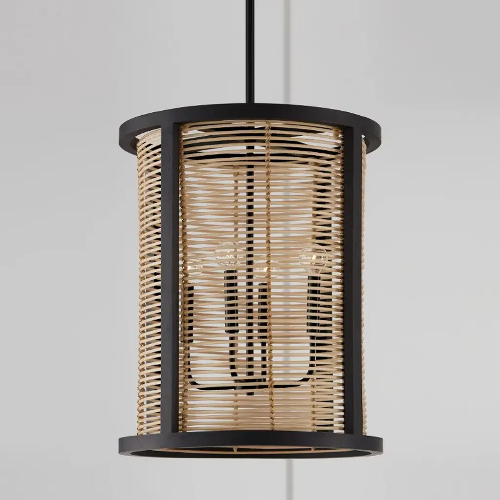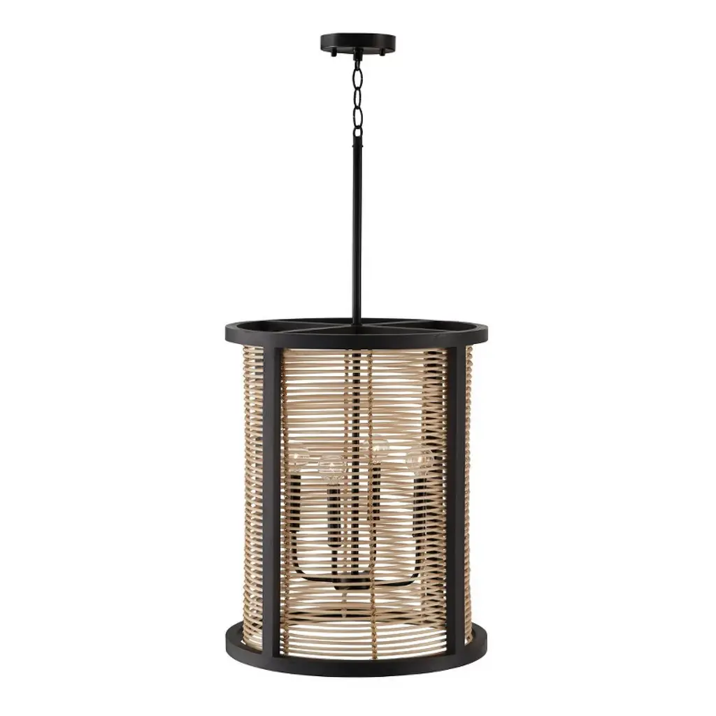 Modern flair meets timeless style with the Rico Foyer. The organic elements of mango wood in a Flat Black finish paired with hand-arranged rattan creates a look with classic charm with artisan appeal. DIMENSIONS: Overall: 18"W x 22"H; Adjustable Hanging Height: 29" - 74"; Includes 12" of chain and 120" of wire; Rods Included 6"(1), 12"(1) & 18"(1)L DETAILS: Artisan made of handcrafted, bent natural rattan shade and hand-painted mango wood frame; natural variation will occur. FINISH: A muted black painted mango wood that is smooth and soft to the touch. BULBS: Designed to be dimmable and LED/CFL/Incandescent bulb compatible, this fixture uses 4 - 60 Watt (max) E12 Candelabra base bulbs (not included). It's shown here with a G16 lamp. FEATURES: Rated for dry locations; includes a 1-Year Manufacturer Warranty. Mounting Direction: Up Canopy Included: Yes Canopy Diameter: 5.00 Chain Length: 12.00 Rod Length(s): 1-6, 1-12, 1-18