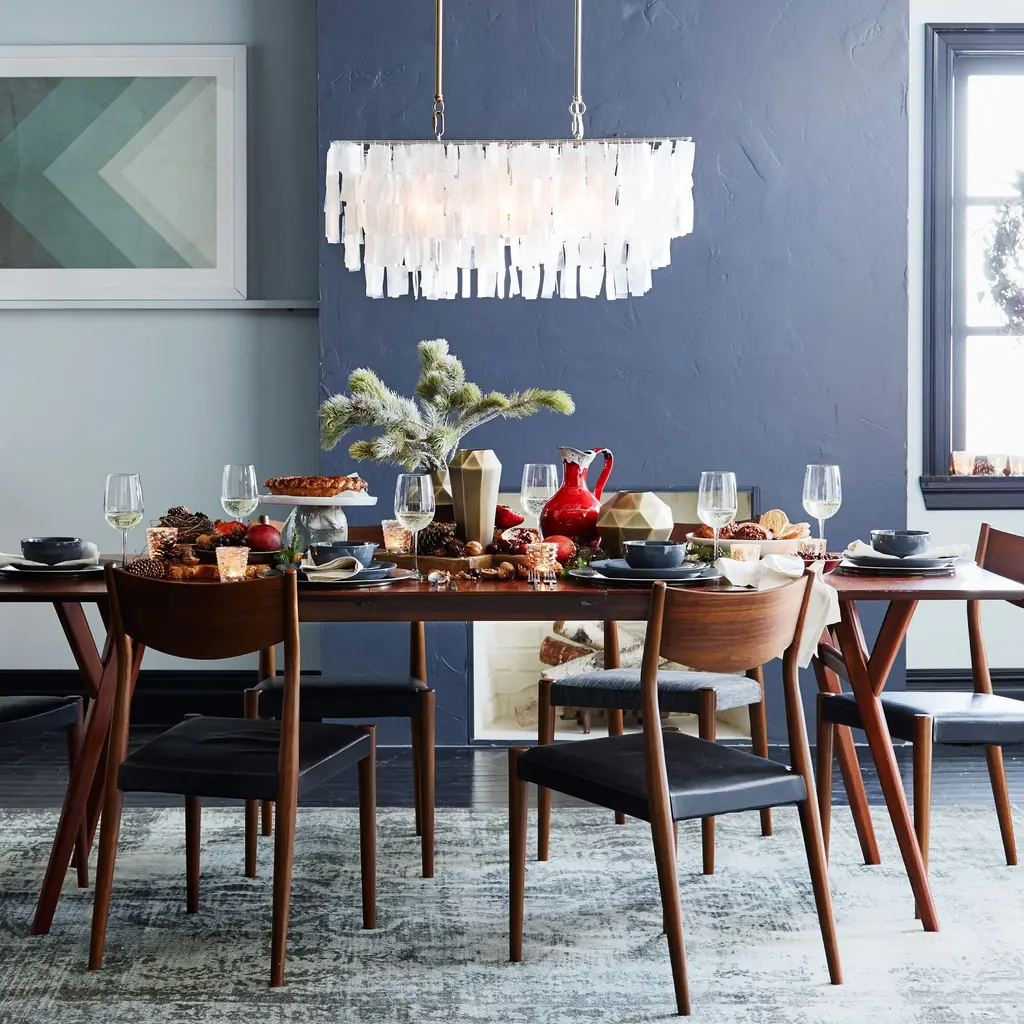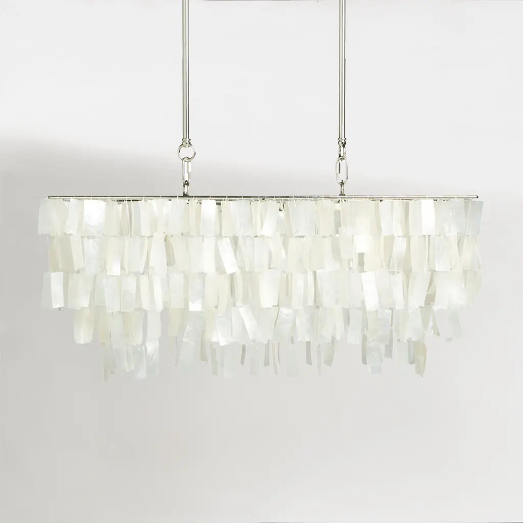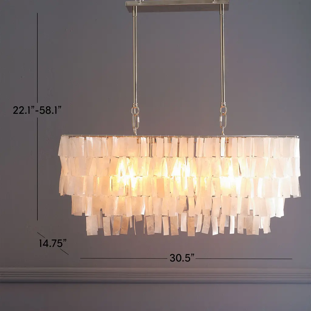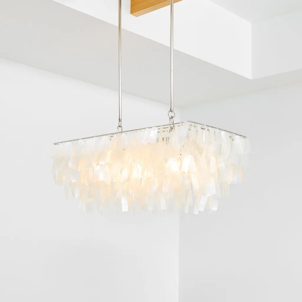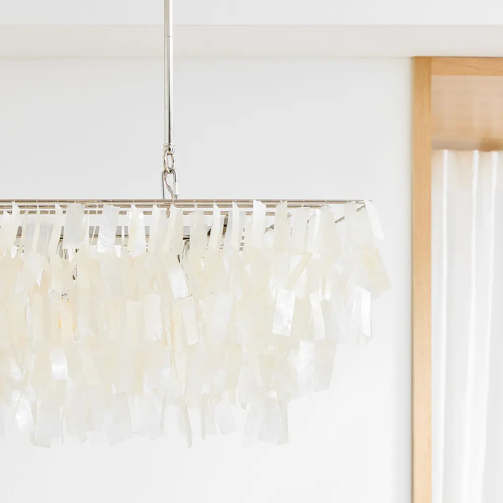 Natural capiz shells diffuse soft, warm light. Its grand shape is perfect for the dining room. Each is carefully handcrafted in the Philippines.
