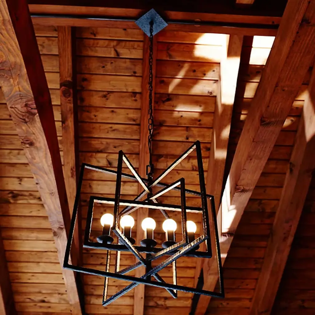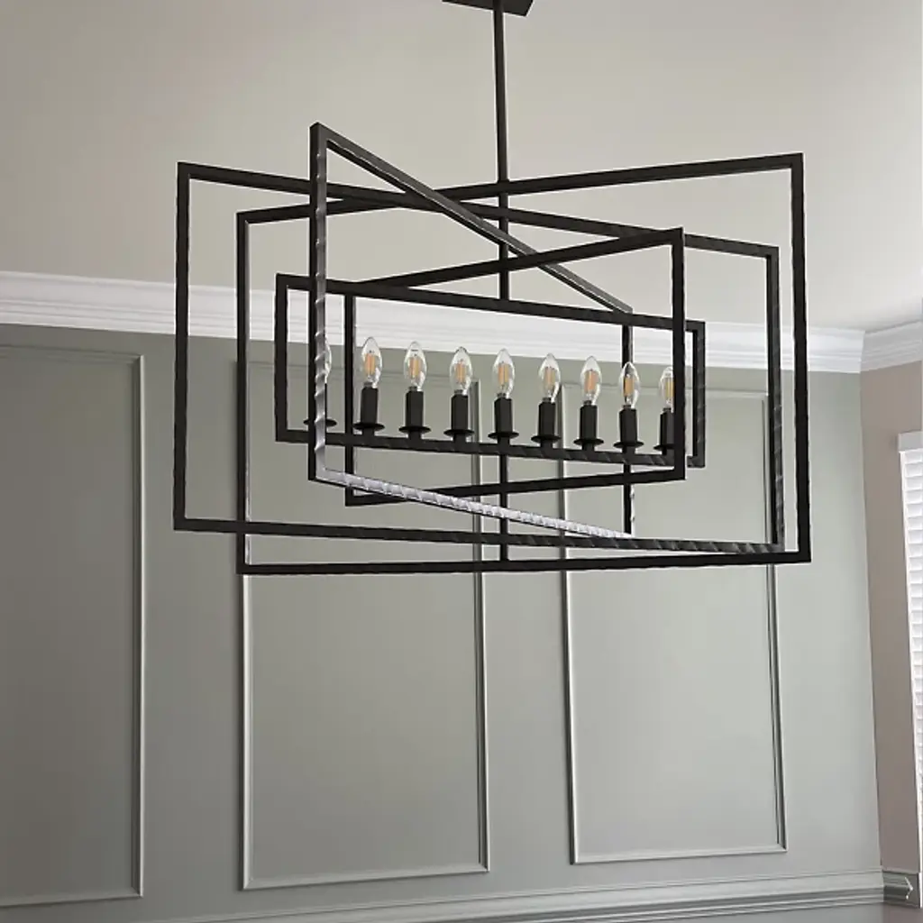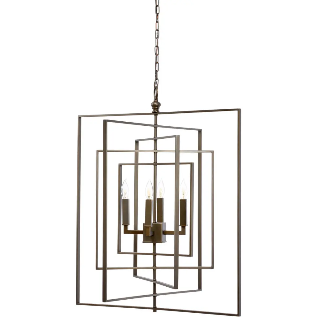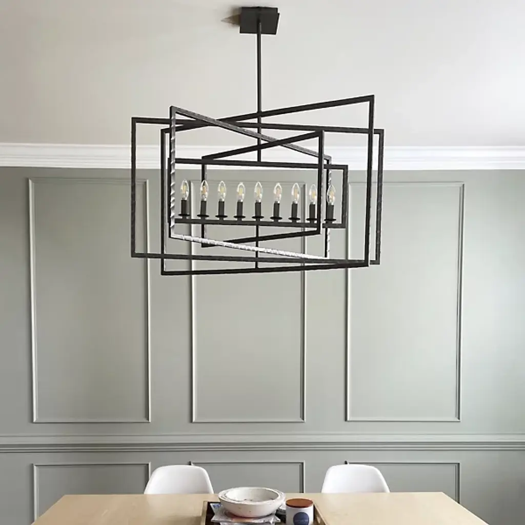 The Crystorama Capri Chandelier is an open and airy lighting fixture made of concentric rectangular rings. This piece also doubles as an interactive sculpture, the rings are adjustable to fit anyone's aesthetic needs. Due to the nature of the fixture, this piece looks different from every angle it is viewed at, always presenting a new and interesting look for the viewer.