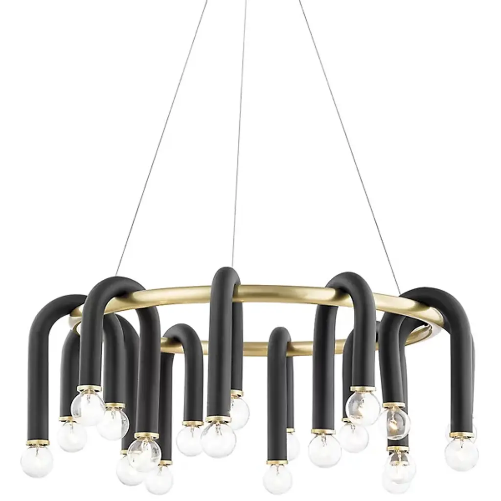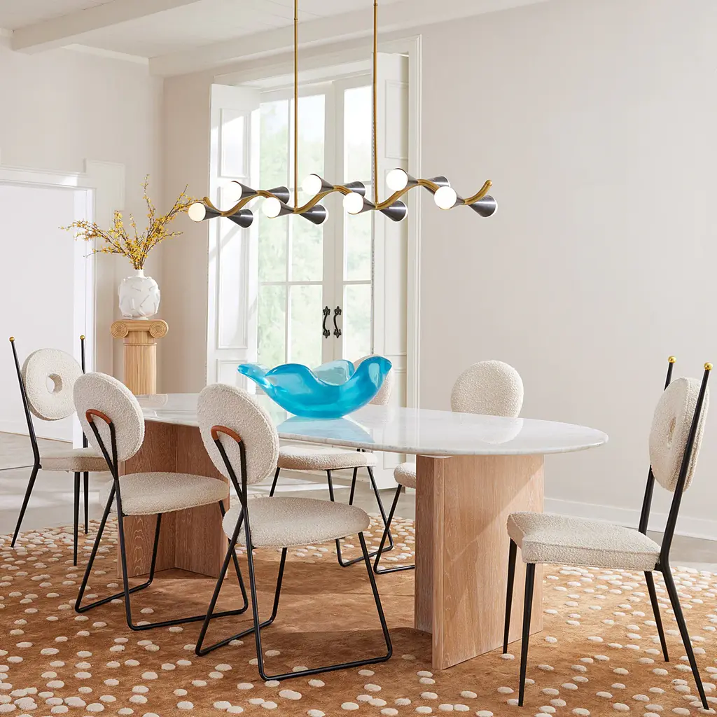 Make Waves. Simple yet striking, our Caracas Wave Chandelier features a single antiqued brass bar bent into a long wave and dotted with our chic and classique two-way black lacquer cones. Equally artful above a rectangular dining table or oversized kitchen island, it's also an eyeful in an airy entry hall. The perfect piece to update your abode with a touch of French 50s style. All lighting sales are final.