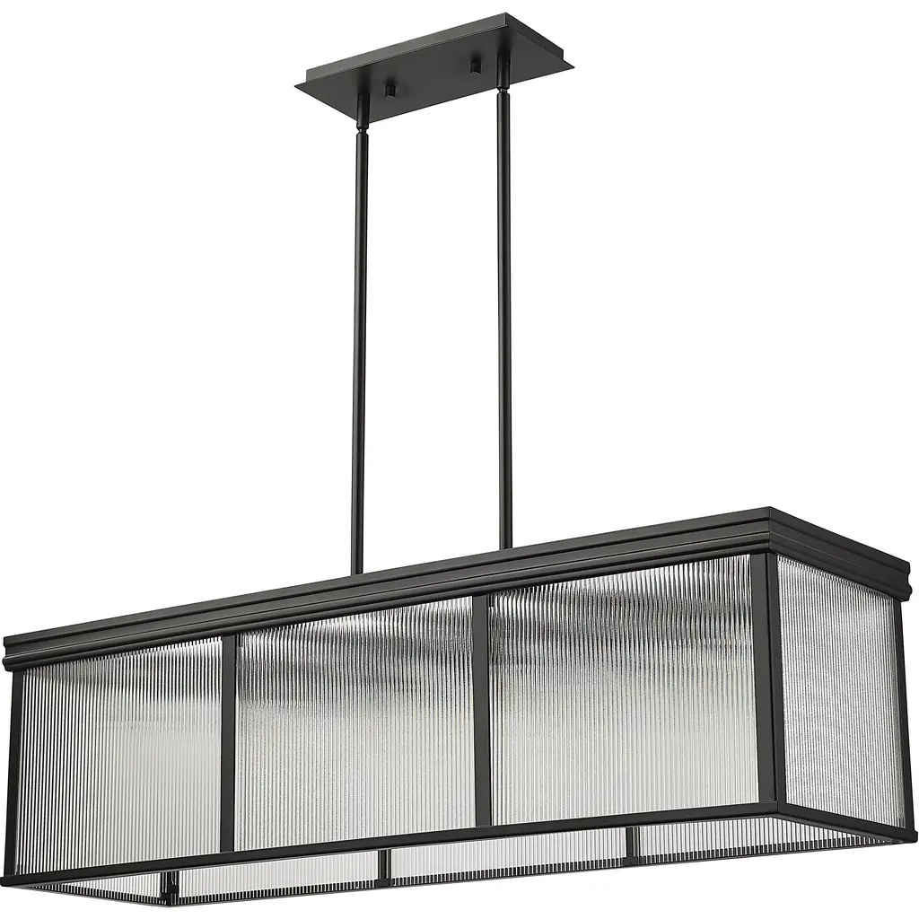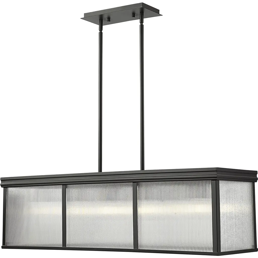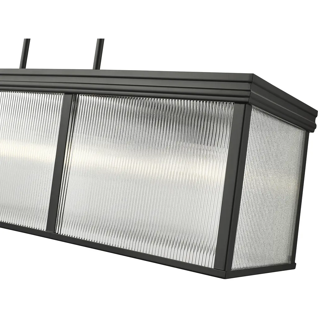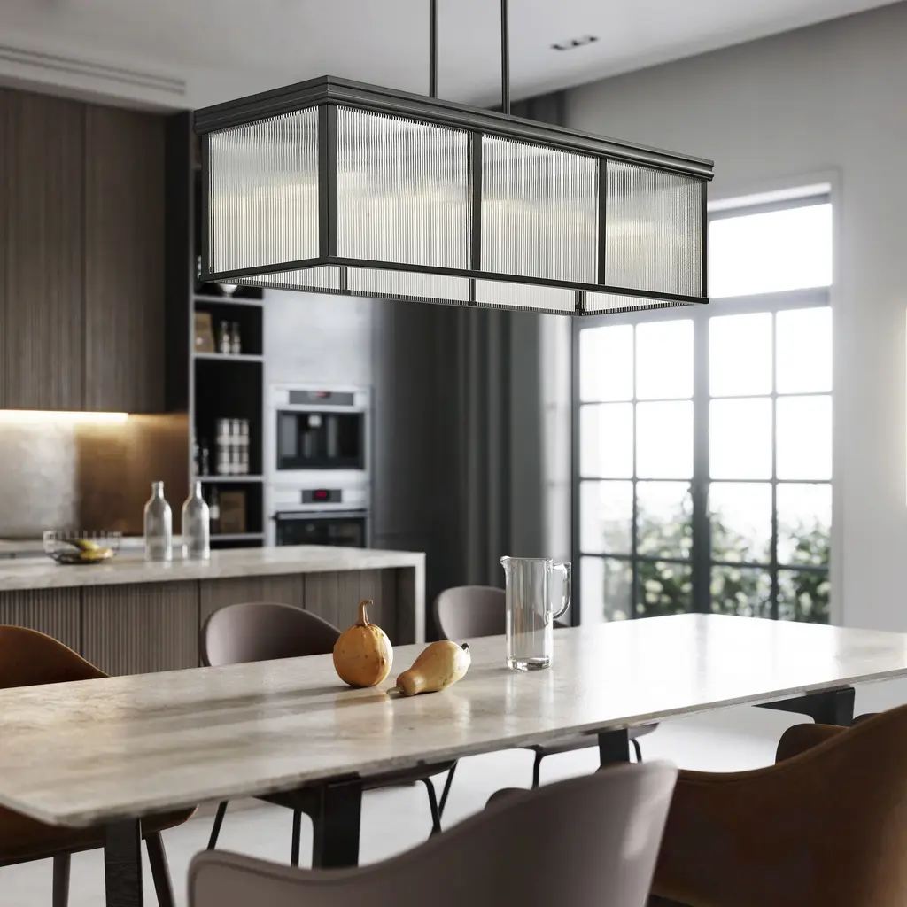 Clean lines and panes of architectural ribbed glass multiply the stylish character of a modern ten-light linear pendant. Striking over a kitchen island or gracing your foyer, it's a distinctive look defined with a matte black finish and vertical striations in the glass that create a hint of opacity while reflecting light to create a warm, welcoming ambiance.