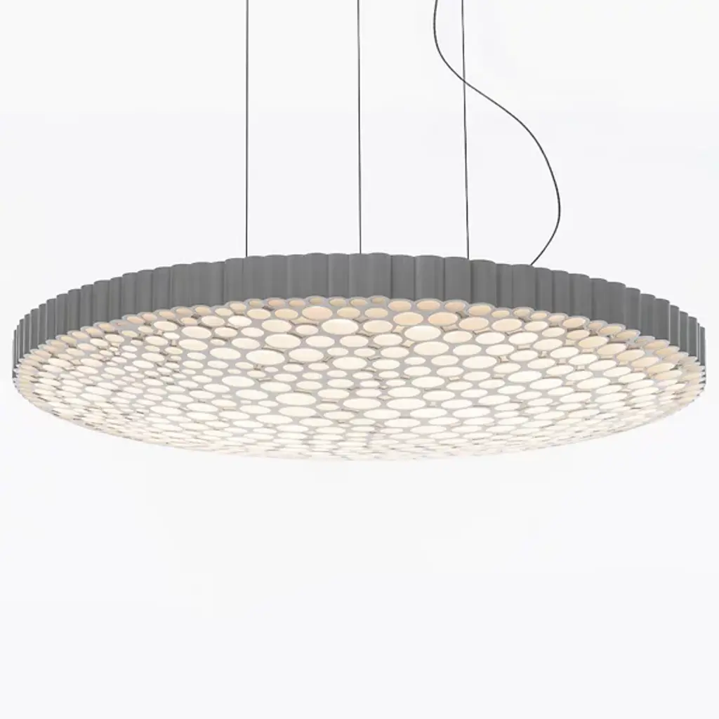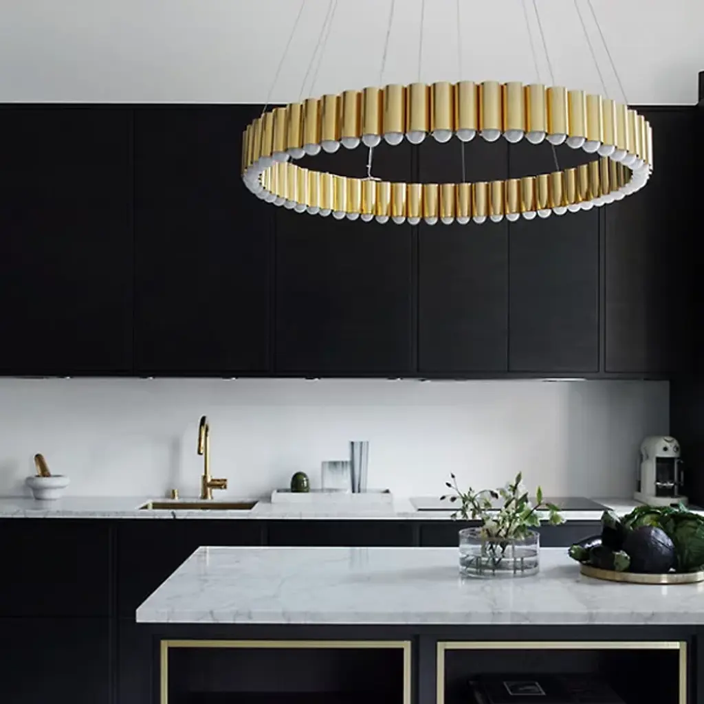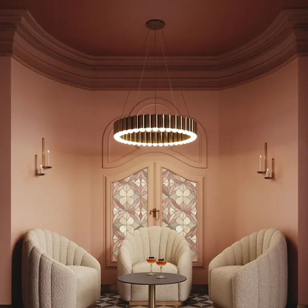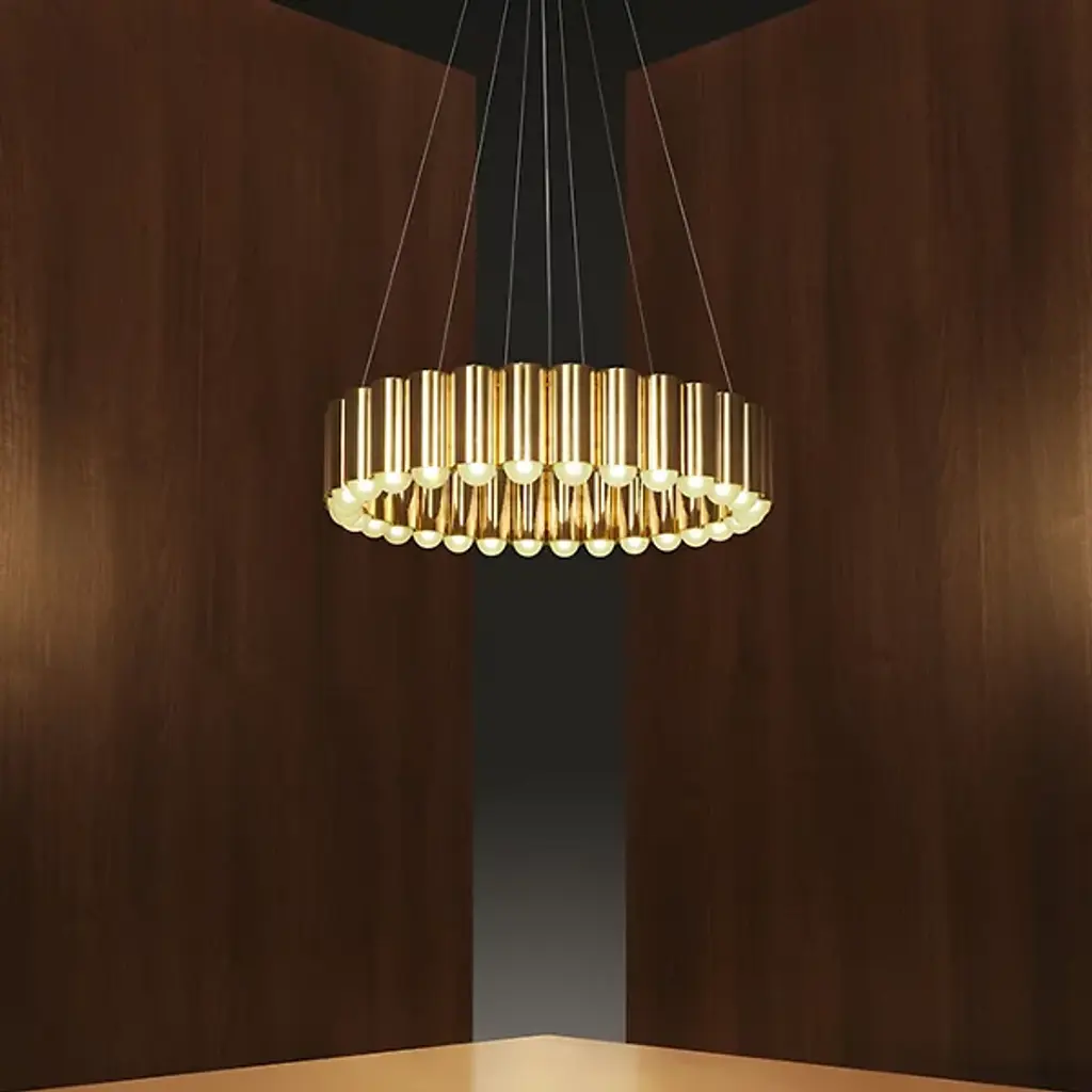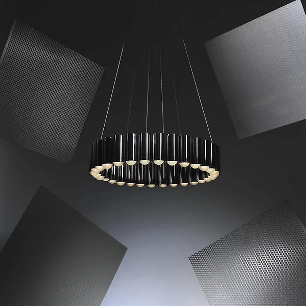 The Carousel Chandelier by Lee Broom is a bold and handsome composition inspired by traditional British merry-go-rounds. This conceptual reinterpretation of a fairground staple features an arrangement of Steel cylindrical tubes set against one another to form a halo, each housing a glass dome to diffuse a lovely ring of downlight. Every element of this contemporary chandelier has a glamorous touch, helping complete a confident and unique single tier silhouette with a lightweight and warm presence.