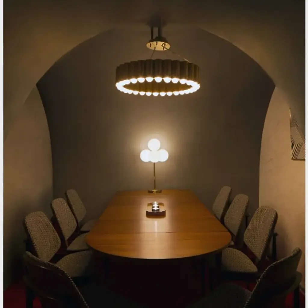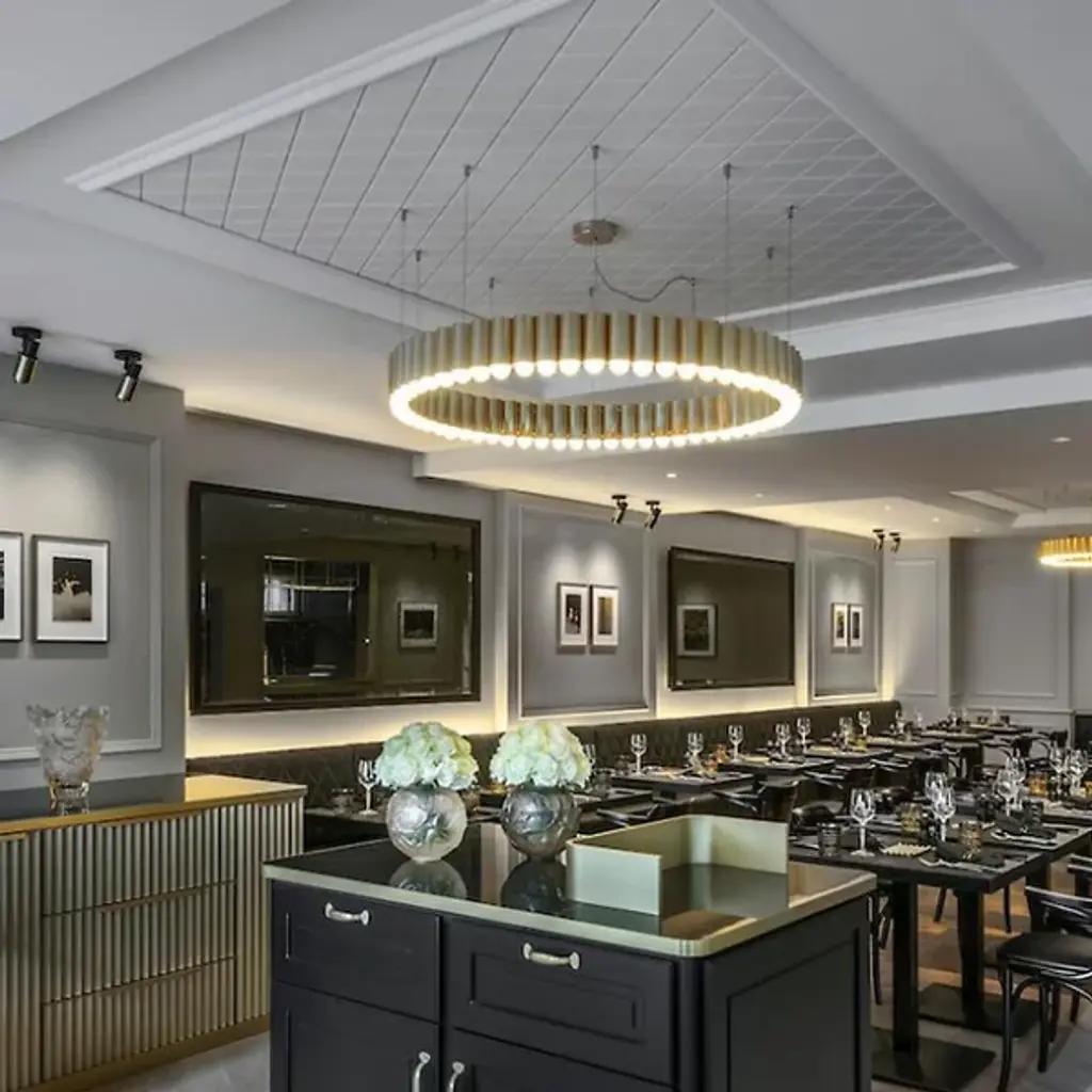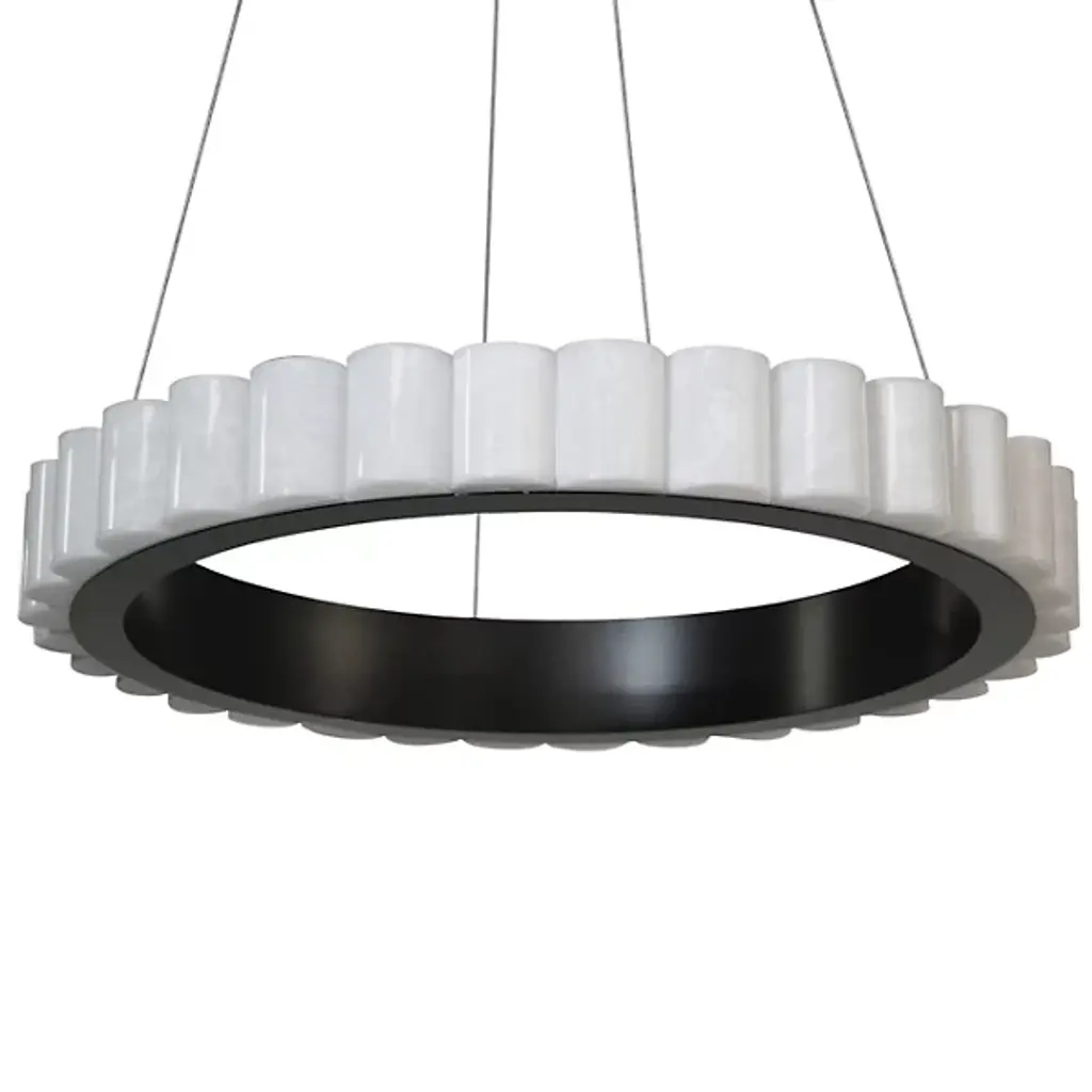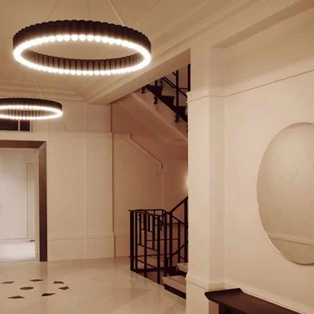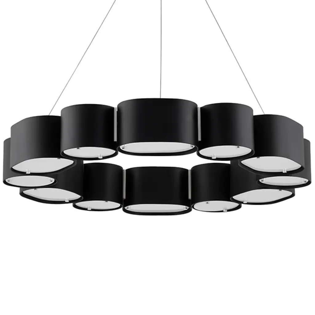 The Carousel Chandelier by Lee Broom is a bold and handsome composition inspired by traditional British merry-go-rounds. This conceptual reinterpretation of a fairground staple features an arrangement of Steel cylindrical tubes set against one another to form a halo, each housing a glass dome to diffuse a lovely ring of downlight. Every element of this contemporary chandelier has a glamorous touch, helping complete a confident and unique single tier silhouette with a lightweight and warm presence.