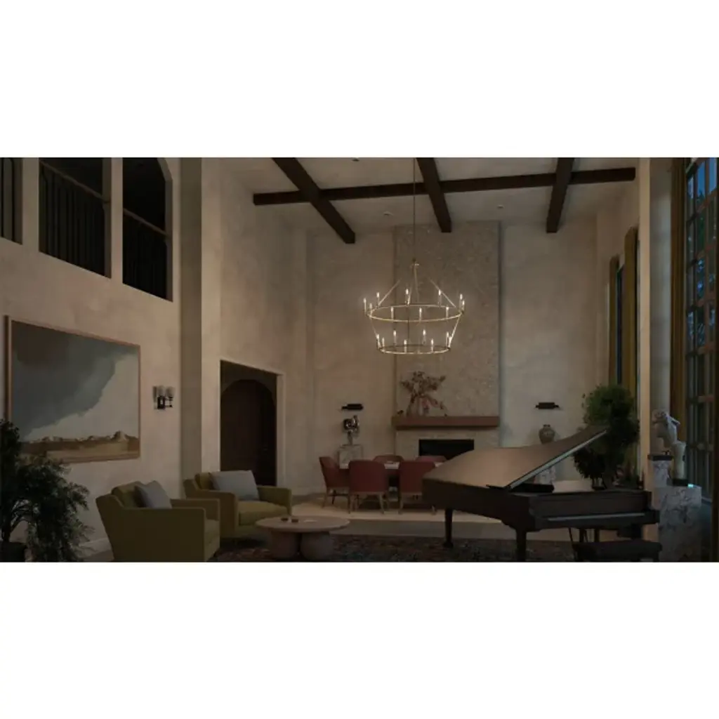 Experience the exquisite charm of the Carrick Two Tier Chandelier by Kichler, infusing a sense of airiness into traditional design. Inspired by historic ring forms, this chandelier boasts a wide, flat ring with candlesticks that appear to float gracefully off its edge, presenting a unique perspective from any vantage point. Delicate bobeche detailing on each candlestick enhances its timeless elegance, culminating in a captivating luminary that gracefully illuminates any space with classic sophistication.