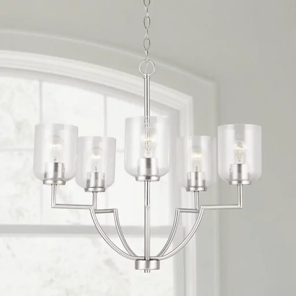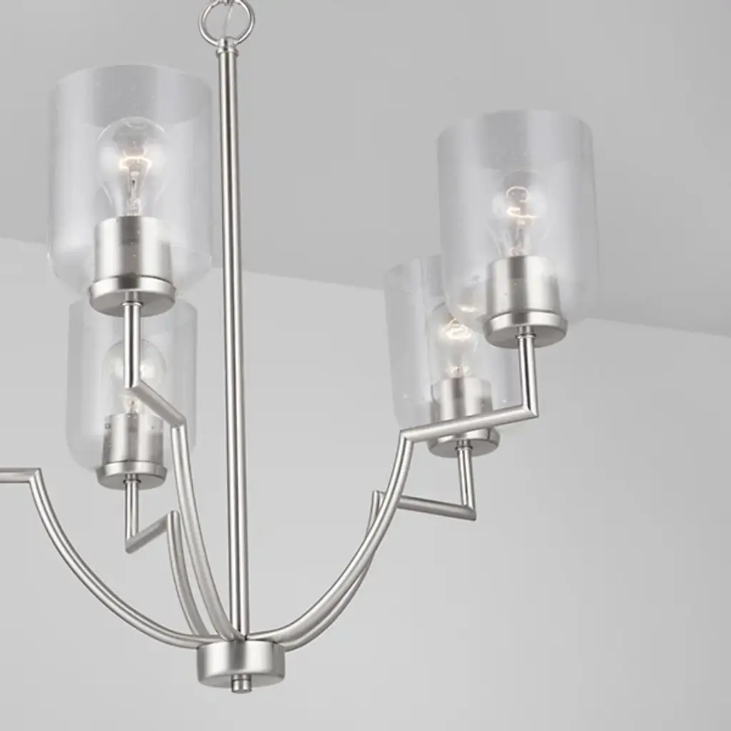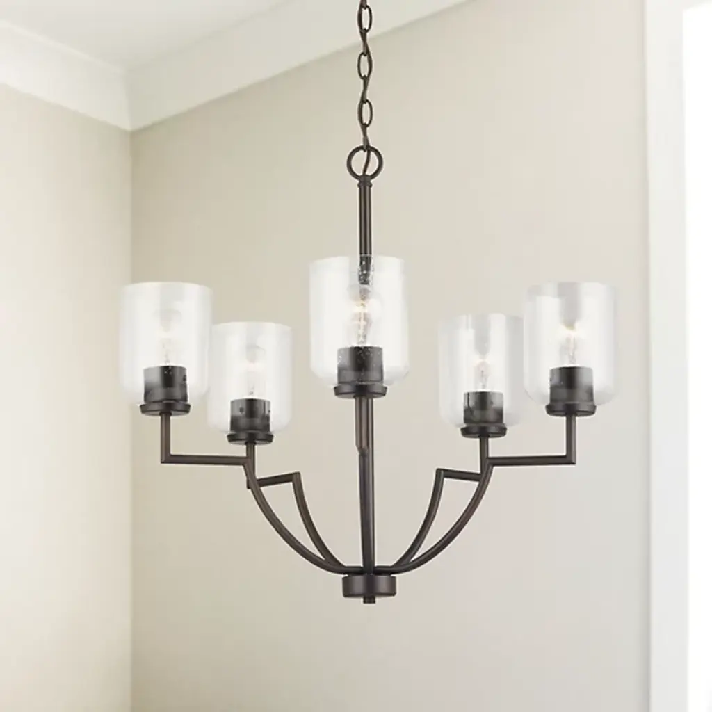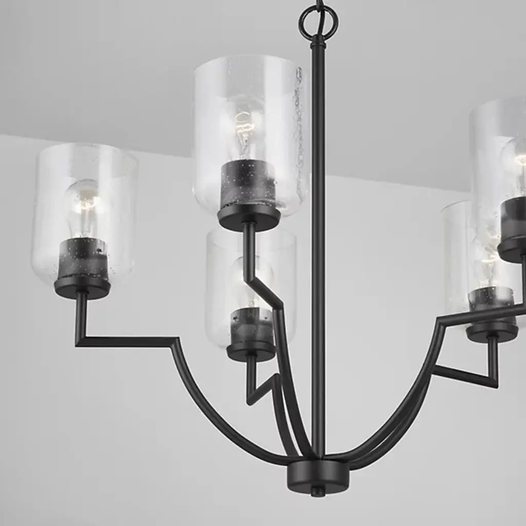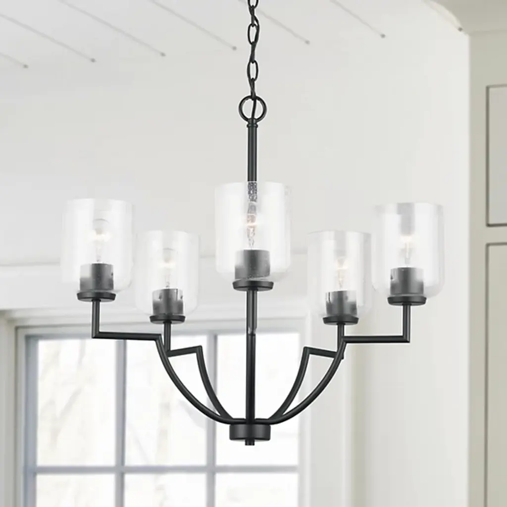 The Carter Chandelier from Capital Lighting accentuates the clean angles of your modern home with a neat, sculptural design. It’s a piece inspired by modern design’s iconic patterns. The piece feels familiar as it produces a series of arms underlined by their generous curve and sharp angles. Together, the arms create an upsurging, graphic silhouette that catches the eye day and night. Clear glass shades topping the arm add a bit of vintage charm to the piece. The seeded texture of the shade softens the image of the bright bulbs inside for a comfortable light. The group of bulbs creates a warm, inspiring source of illumination.