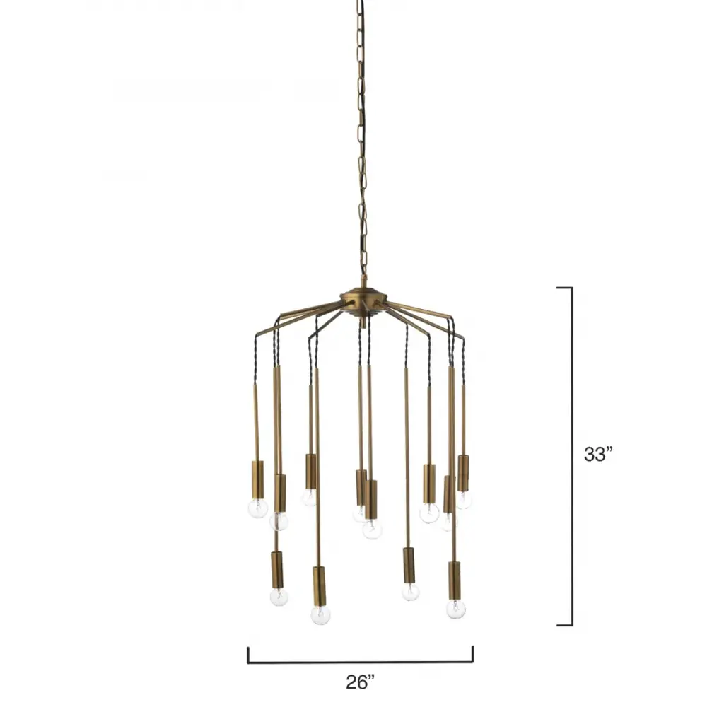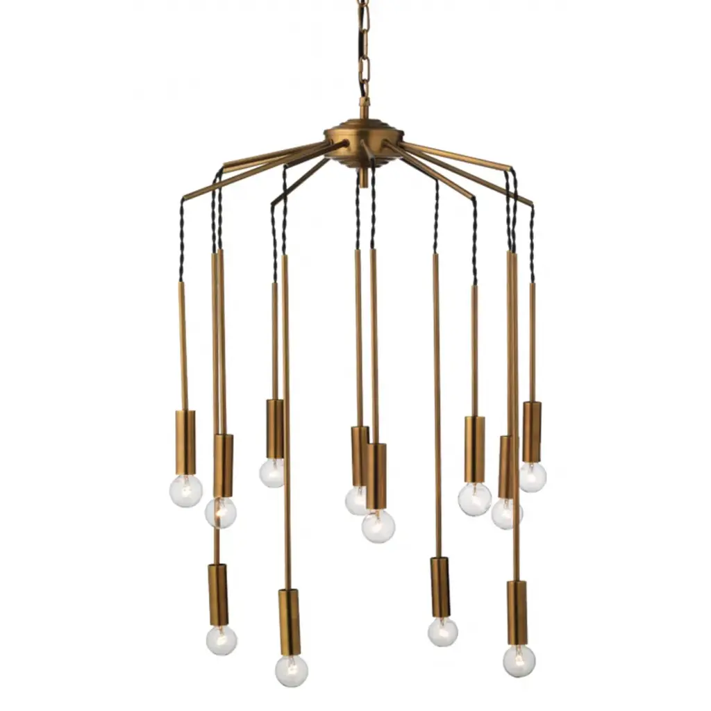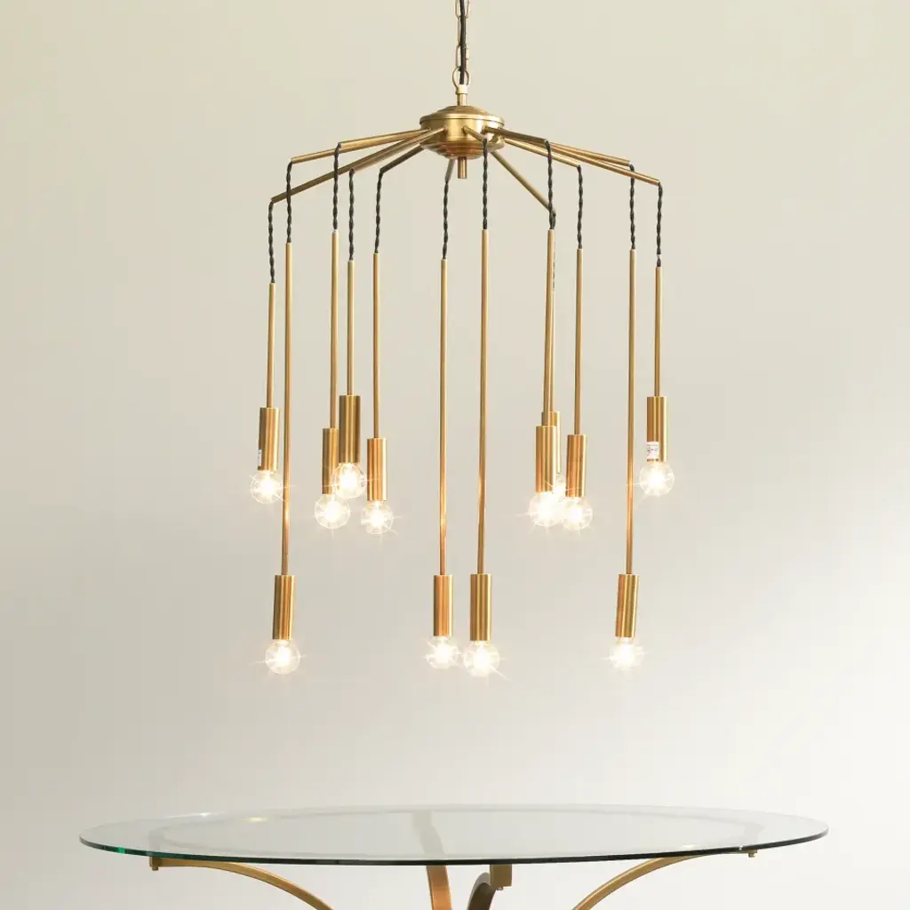With vintage vibes and organic form, this statement lighting fixture adds an artistic touch to any room. The simple silhouette features antique brass finished metal arms with cascading down rods in varying heights and exposed bulbs. Placed over a round dining table or conversation area, this fixture is sure to be a conversation starter!