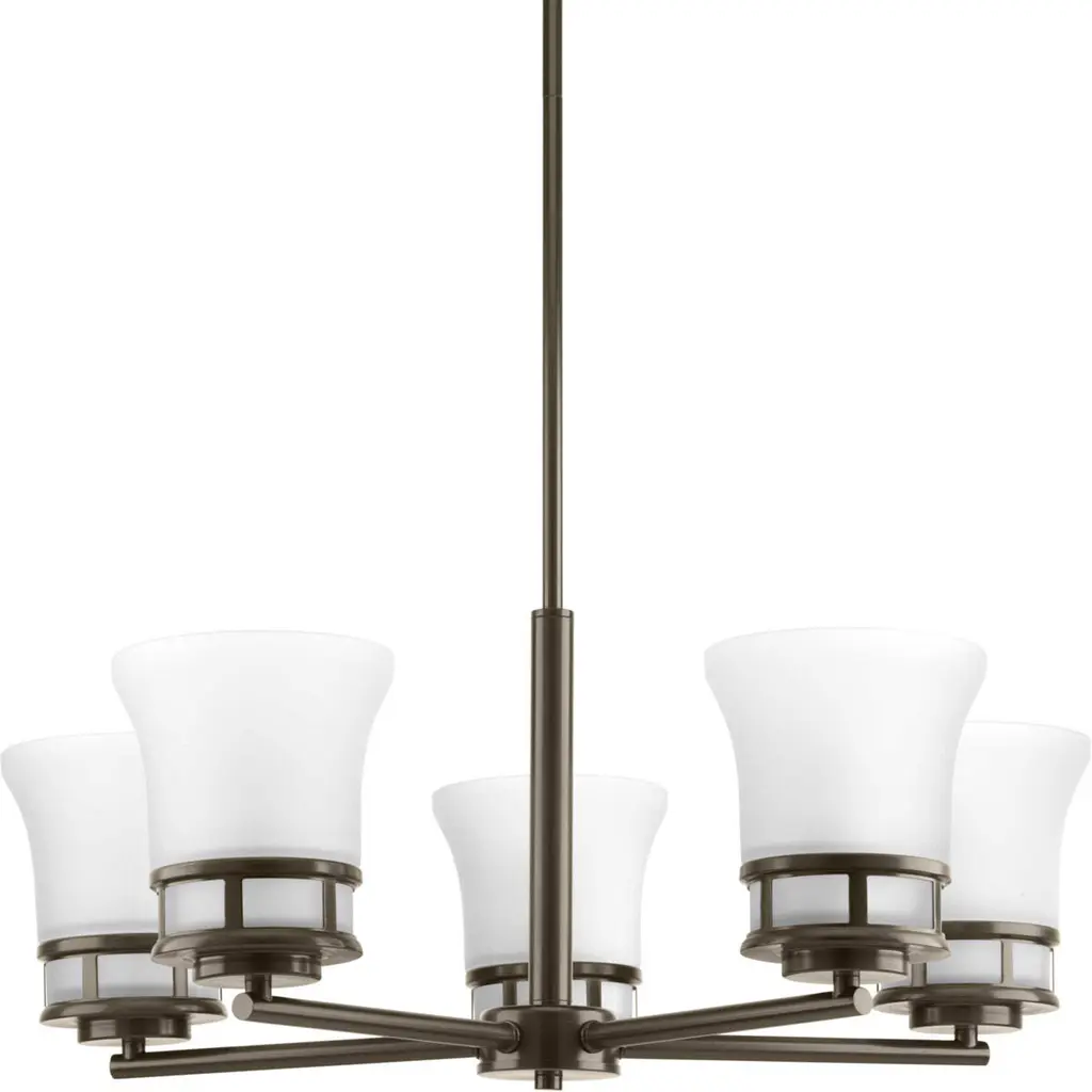 Five-light chandelier with smooth forms and windowpane style gallery that produce a beautiful, modern gas light effect. Overscaled tubing and etched glass shades offer substance within the sleek frame. Polished Chrome finish.