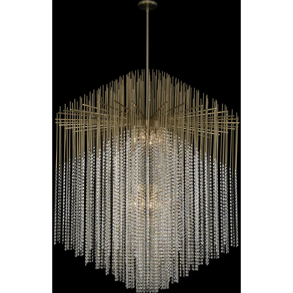 A cascading crystal waterfall chandelier with twelve lights in an antique silver finish. Maximum Hang Height: 82"H. Expandable: Includes one 6" and two 12" extension rods. Candelabra Base, 60 Watt Max, 12 Type B Bulbs, Canopy: 6"