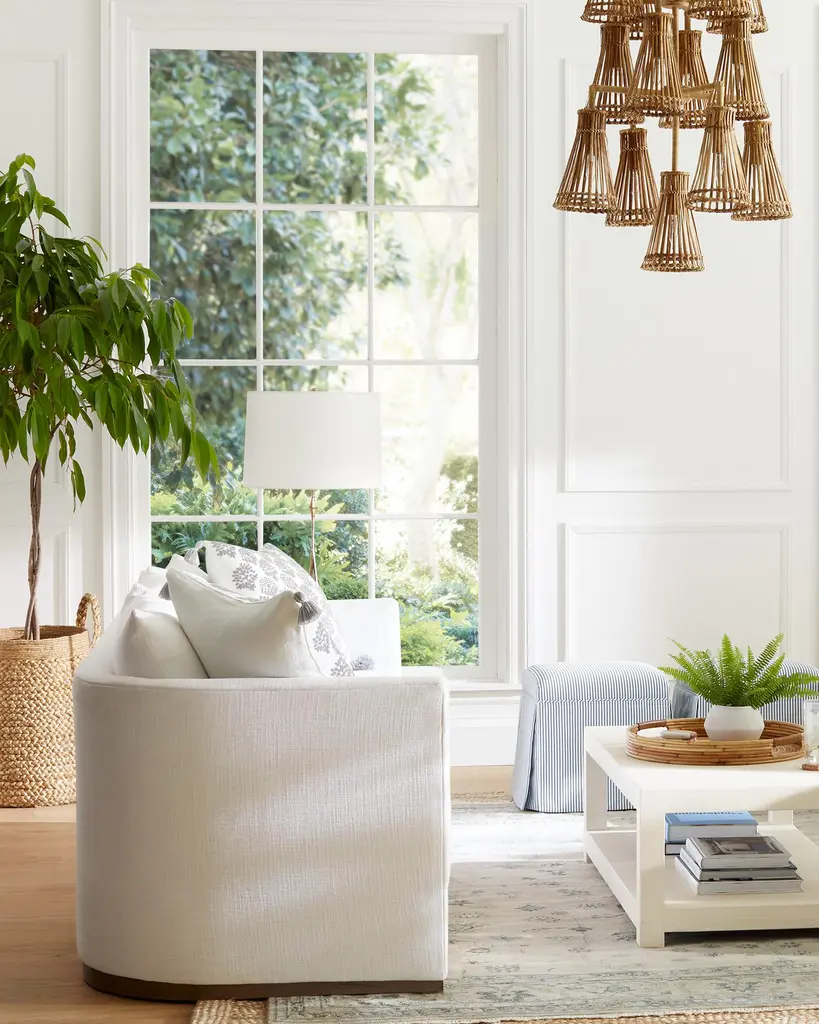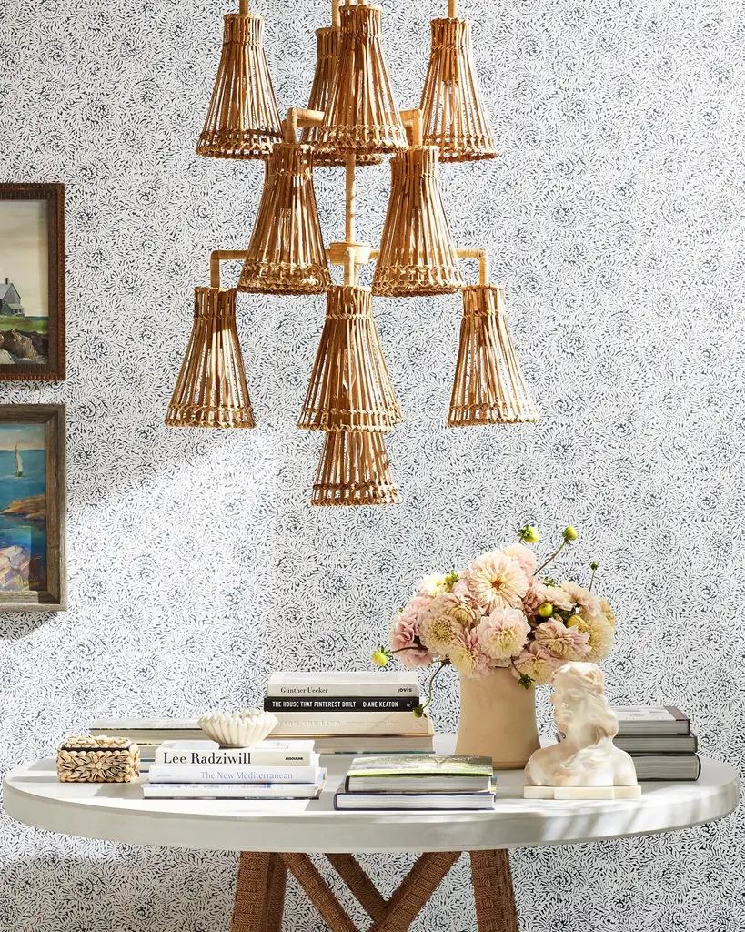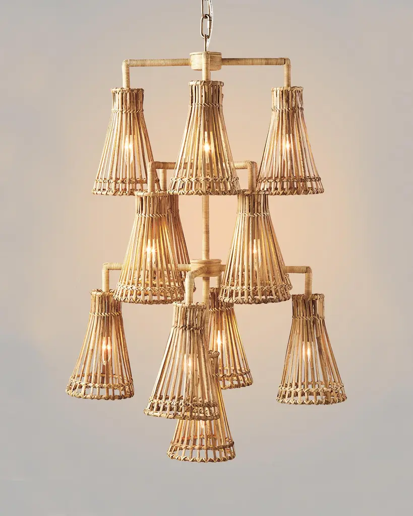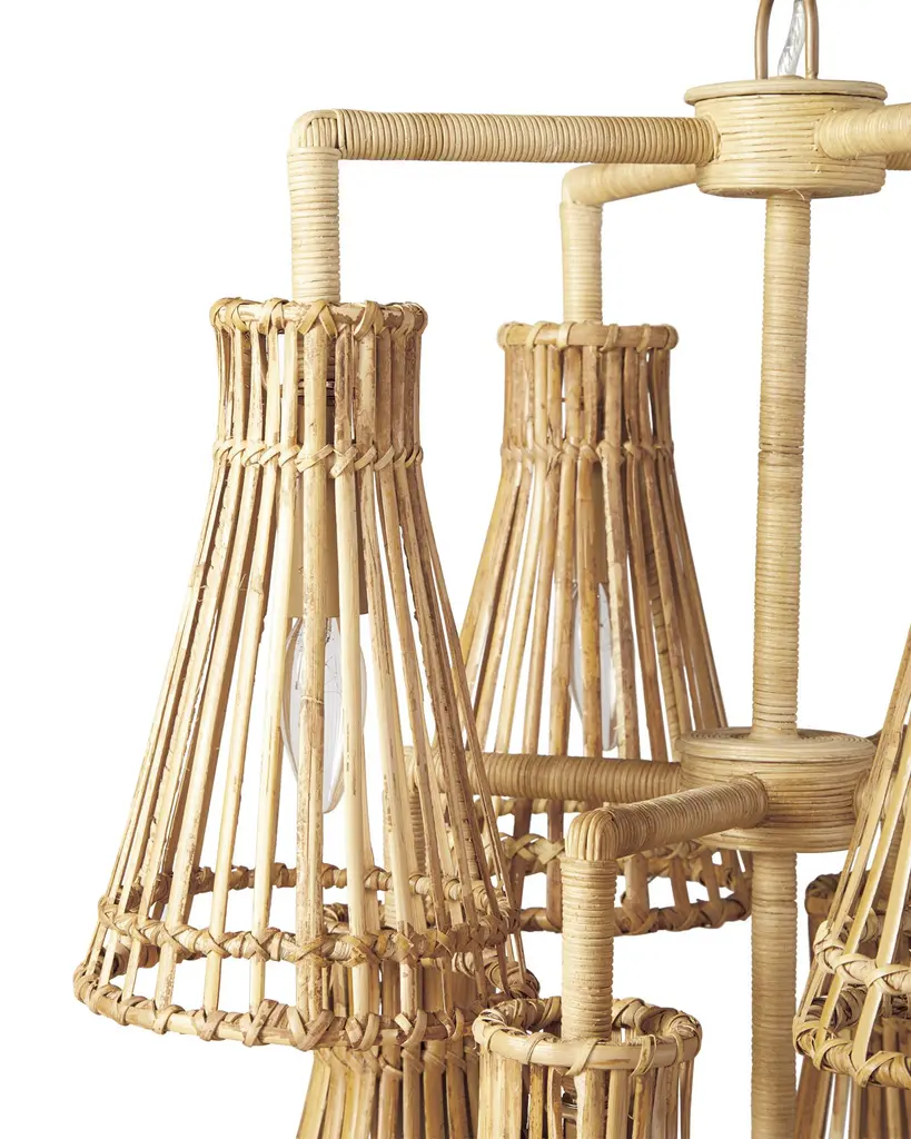 A majestic moment. Petite pendants clad in golden rattan form a romantic, cascadng shape. Brass accents illuminate.