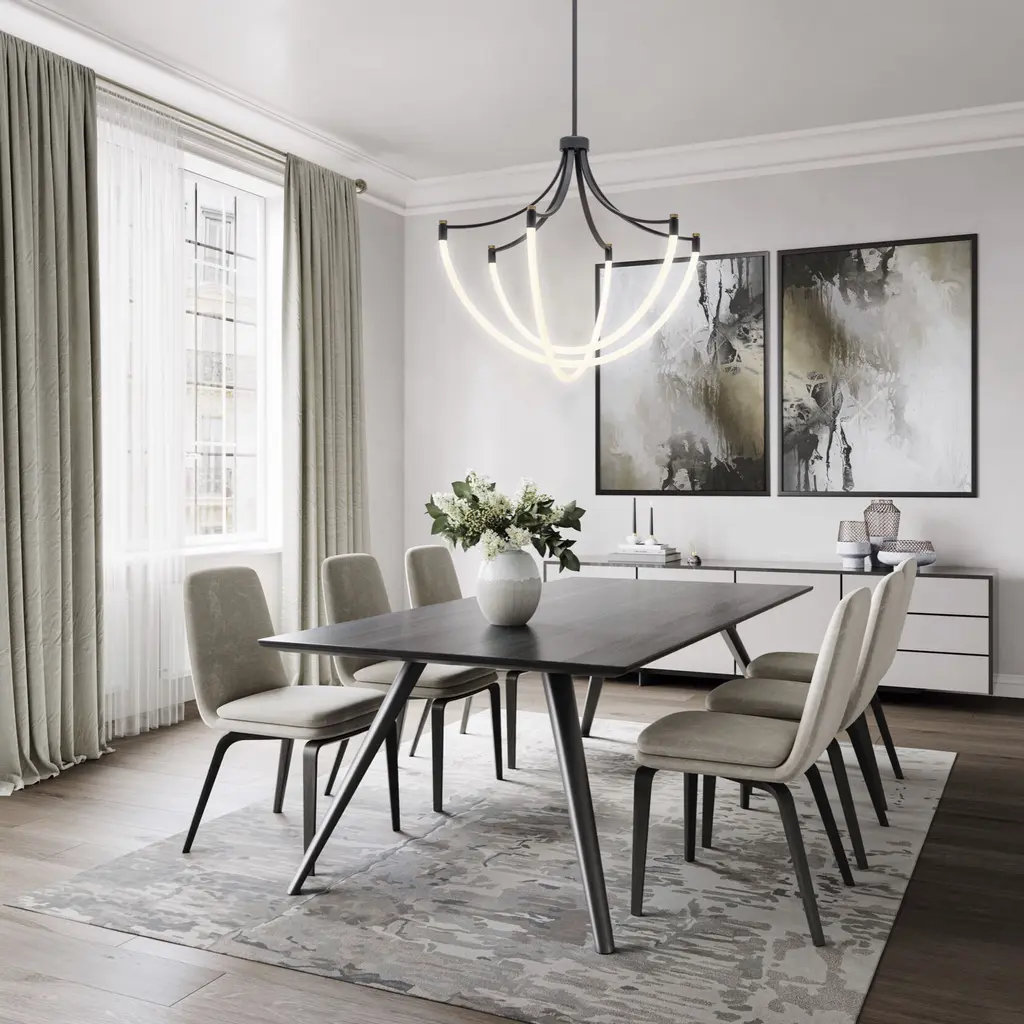 The Cascata Collection, designed by Kevin Kraemer, features a sleek and minimalist design, combining precision craftsmanship with modern aesthetics. The frame is black with brass accents. The bright LED illuminated silicone drapes throughout giving this collection an illusion of weightlessness. This eye-catching collection is a perfect complement to any surrounding. The model shown is a height adjustable circular chandelier.