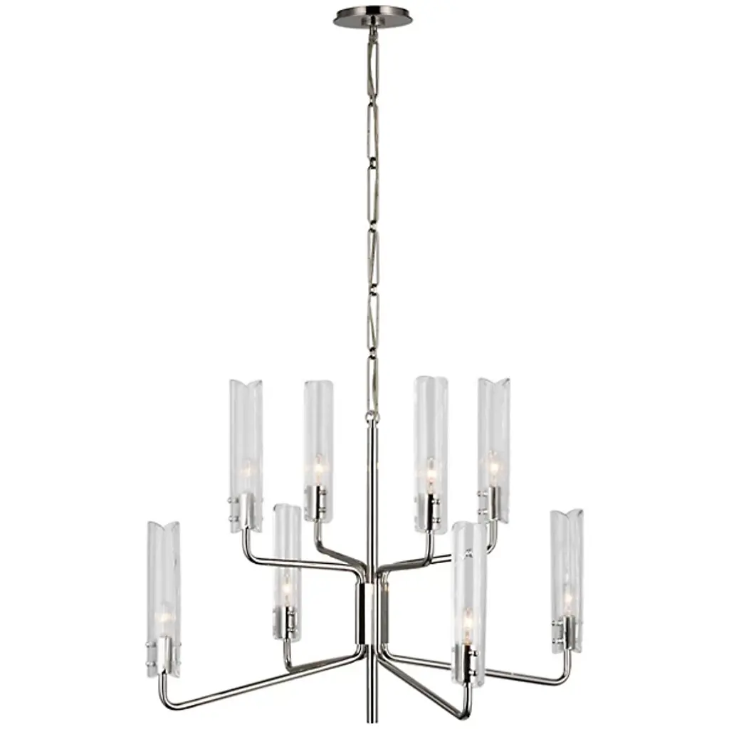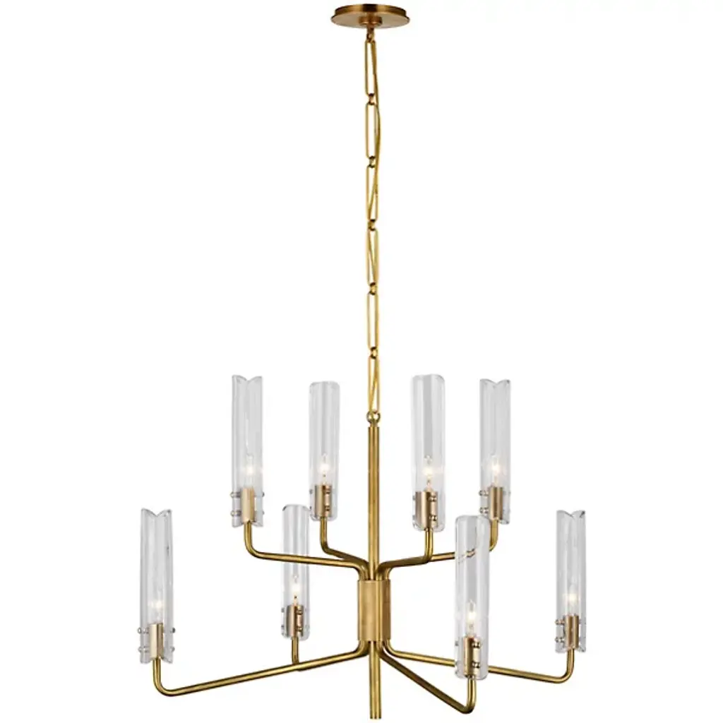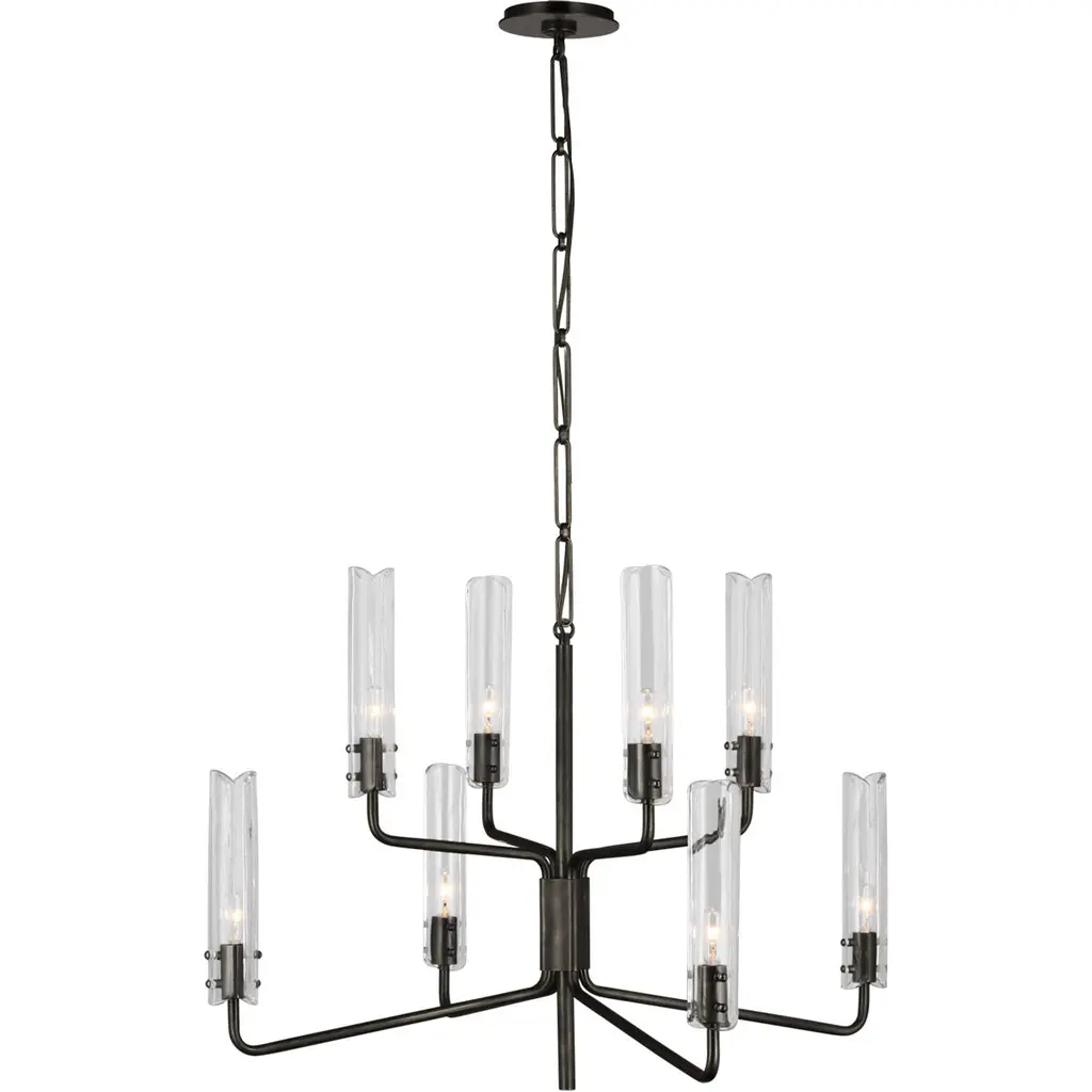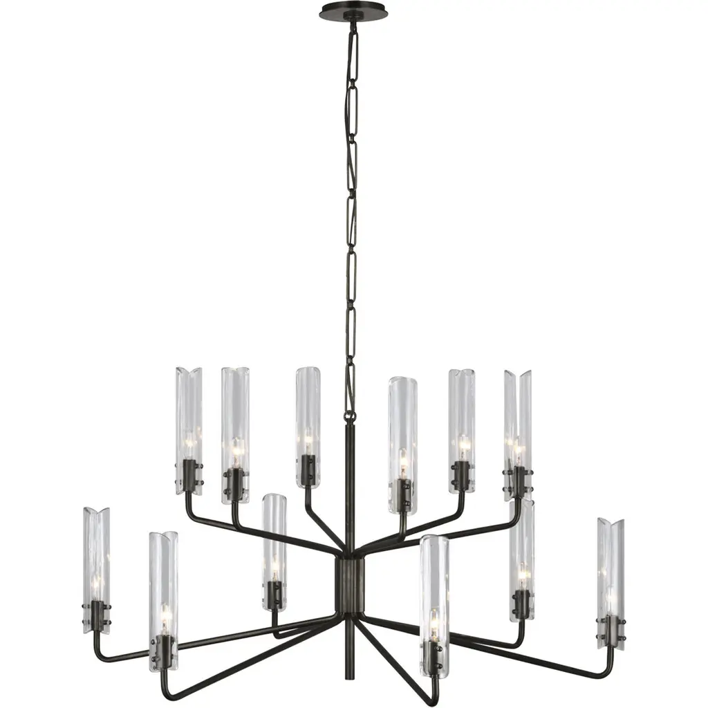 An impressive, radiating display of mid-century modern design. The Casoria 2-Tier Chandelier from Visual Comfort Signature, formerly known as Visual Comfort, sets the ambient and aesthetic tone for the home. It’s a prominent feature over a grand room, presenting two stages of lighting. Slender arms shoot out from an elegant suspension in a starburst display. The arms produce gentle curves that relax the overall silhouette. The chandelier inspires like a crescendo, with elongated glass shades pointing towards the ceiling. A pair of curve-cut accents top the shades to underline their attention to detail. Bulbs nestled inside accentuate the reflective glass with crisp highlights. The brilliant bulbs together create a warm, encompassing aura.