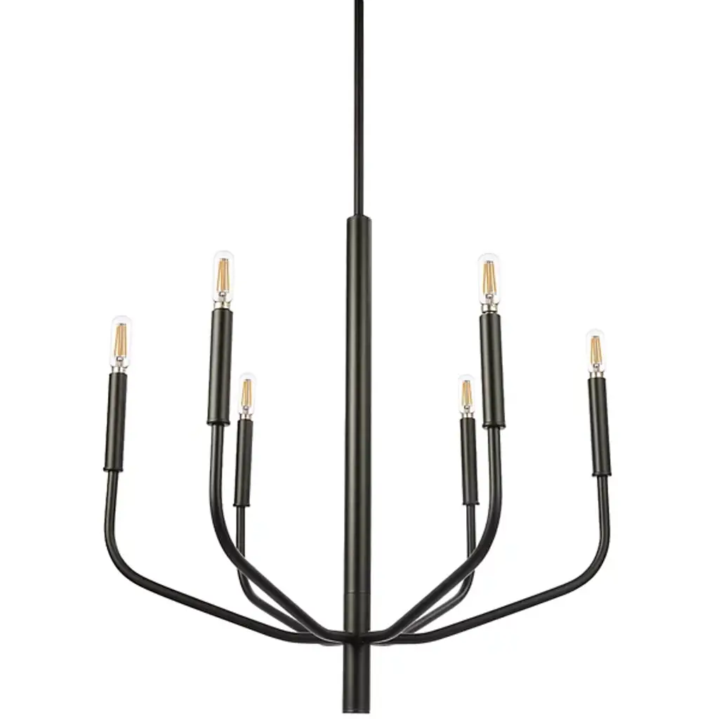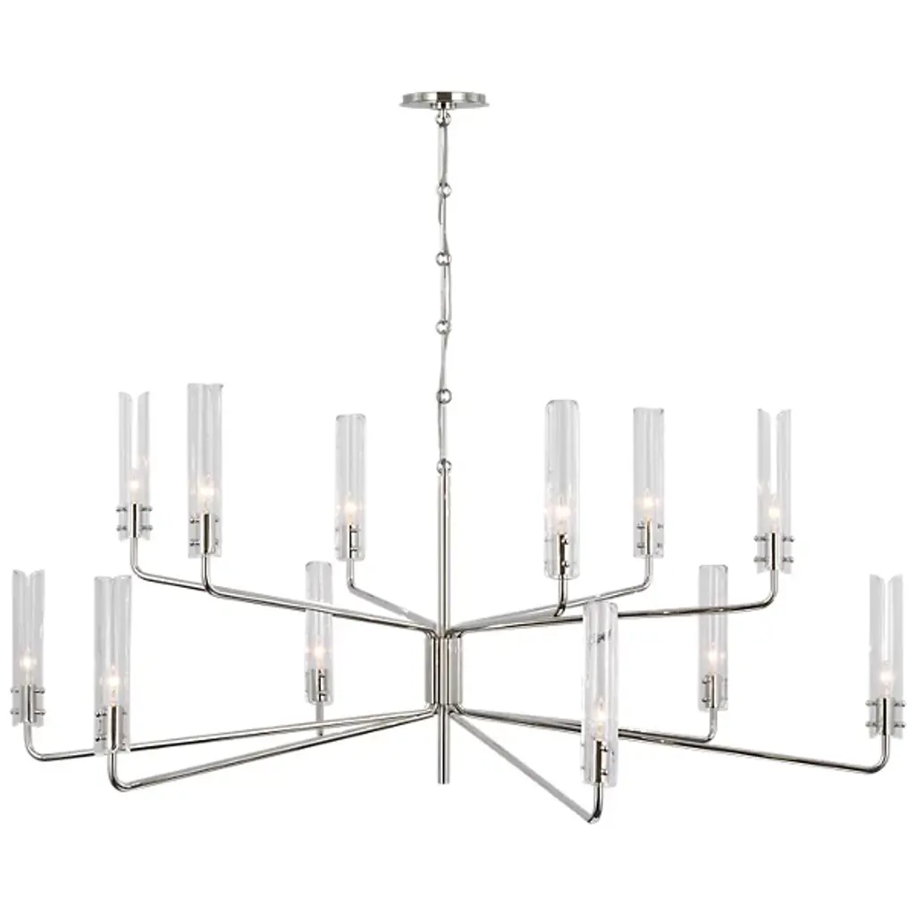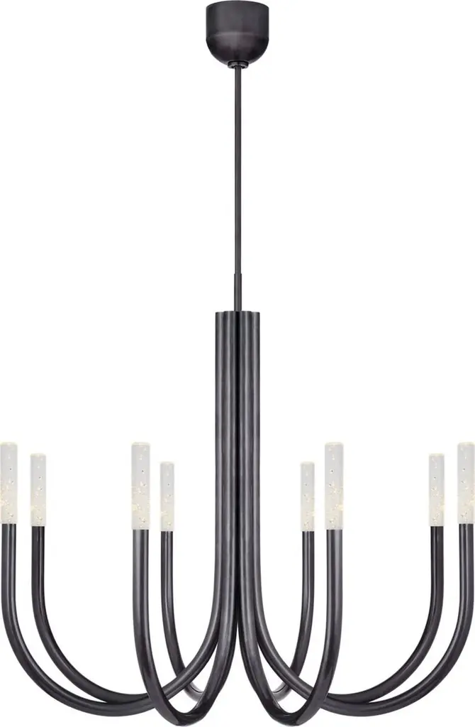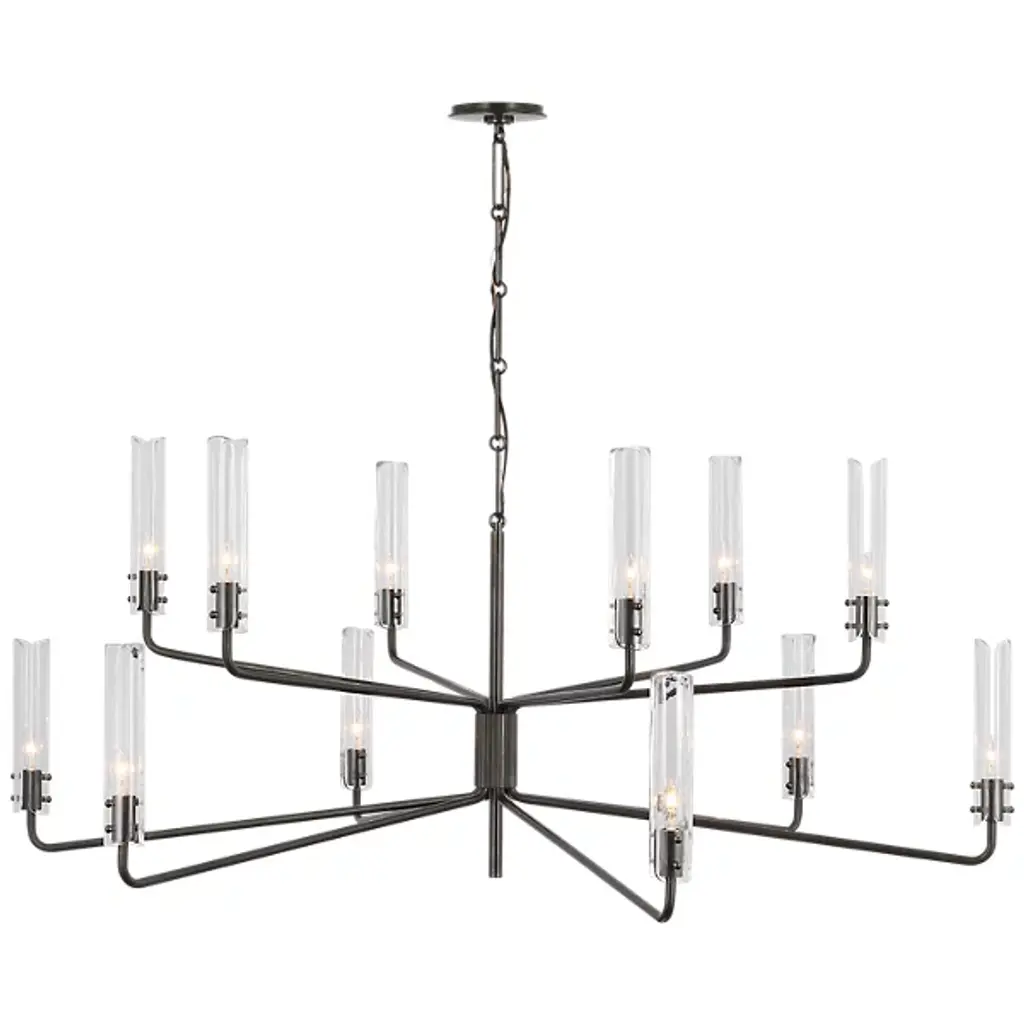 An impressive, radiating display of mid-century modern design. The Casoria 2-Tier Chandelier from Visual Comfort Signature, formerly known as Visual Comfort, sets the ambient and aesthetic tone for the home. It’s a prominent feature over a grand room, presenting two stages of lighting. Slender arms shoot out from an elegant suspension in a starburst display. The arms produce gentle curves that relax the overall silhouette. The chandelier inspires like a crescendo, with elongated glass shades pointing towards the ceiling. A pair of curve-cut accents top the shades to underline their attention to detail. Bulbs nestled inside accentuate the reflective glass with crisp highlights. The brilliant bulbs together create a warm, encompassing aura.