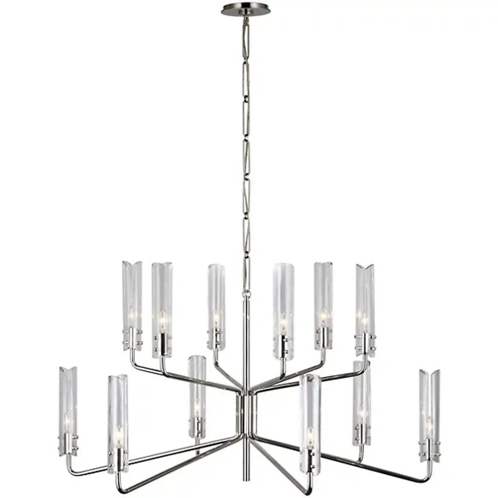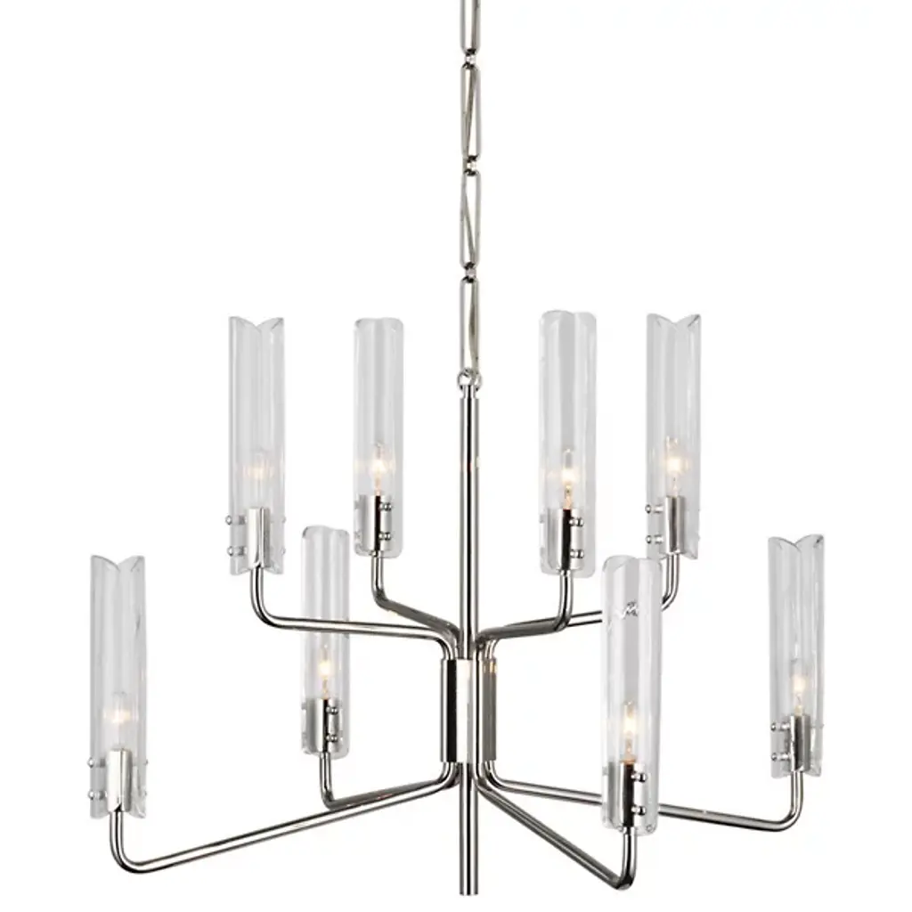 An impressive, radiating display of mid-century modern design. The Casoria 2-Tier Chandelier from Visual Comfort Signature, formerly known as Visual Comfort, sets the ambient and aesthetic tone for the home. It’s a prominent feature over a grand room, presenting two stages of lighting. Slender arms shoot out from an elegant suspension in a starburst display. The arms produce gentle curves that relax the overall silhouette. The chandelier inspires like a crescendo, with elongated glass shades pointing towards the ceiling. A pair of curve-cut accents top the shades to underline their attention to detail. Bulbs nestled inside accentuate the reflective glass with crisp highlights. The brilliant bulbs together create a warm, encompassing aura.