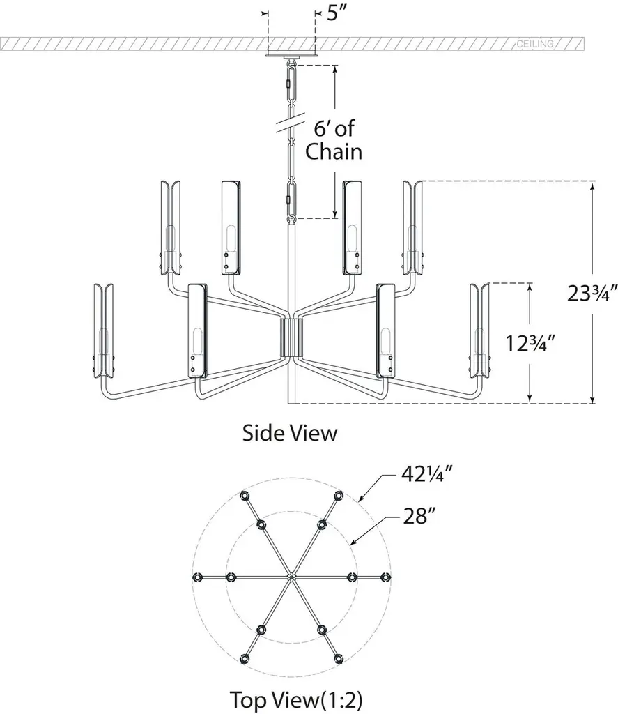 A contemporary take on space-age flair, this two-tier, 12-arm chandelier pairs luminous brass with slender glass shades.