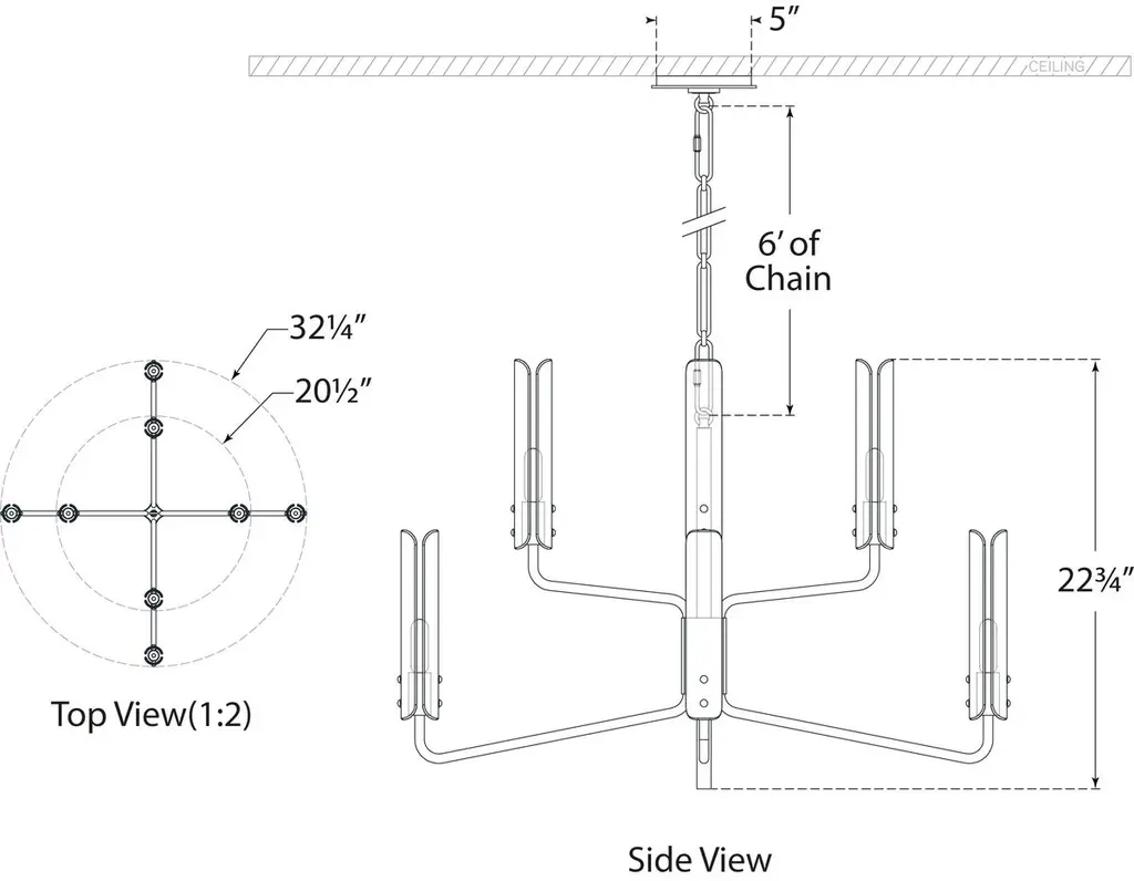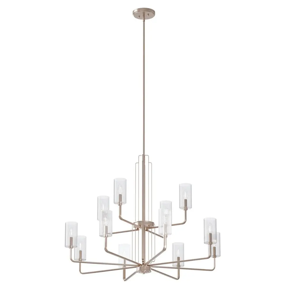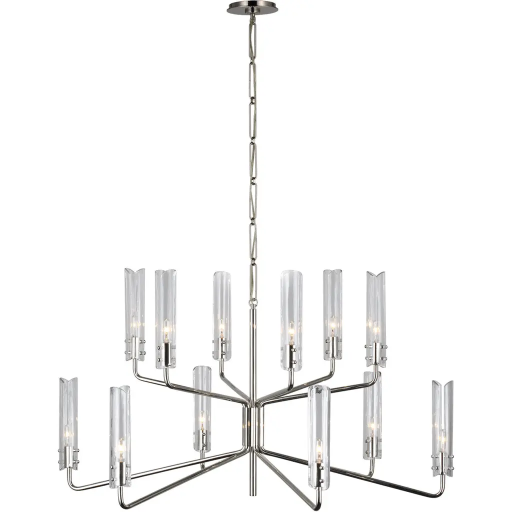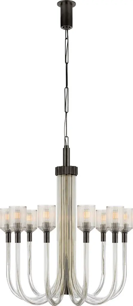 A contemporary take on space-age flair, this two-tier, eight-arm chandelier pairs brass given a hand-rubbed antique finish with slender glass shades.