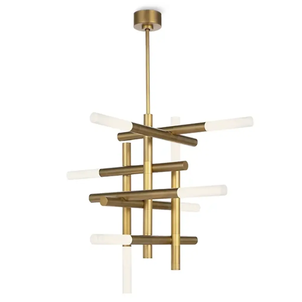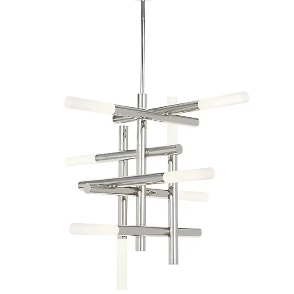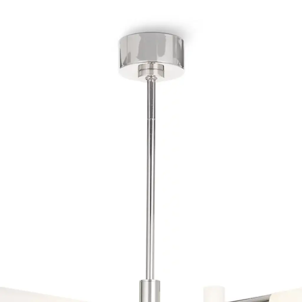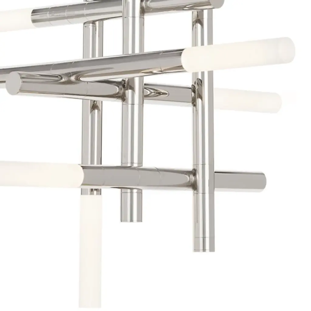 The Cass Chandelier from Regina Andrew is a stunning fusion of architectural design and mid-century modern elegance. Crafted with precision from durable steel, this chandelier has a robust construction that offers durability. The framework of this piece features intersecting lines that create a minimalistic profile. Each tier is adorned with frosted acrylic shades, diffusing the light beautifully to create a soft, ambient glow that illuminates your surroundings with warmth and charm. With 4 tiers, this sloped-ceiling adaptable fixture becomes a focal point.