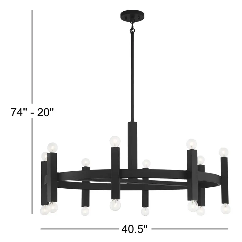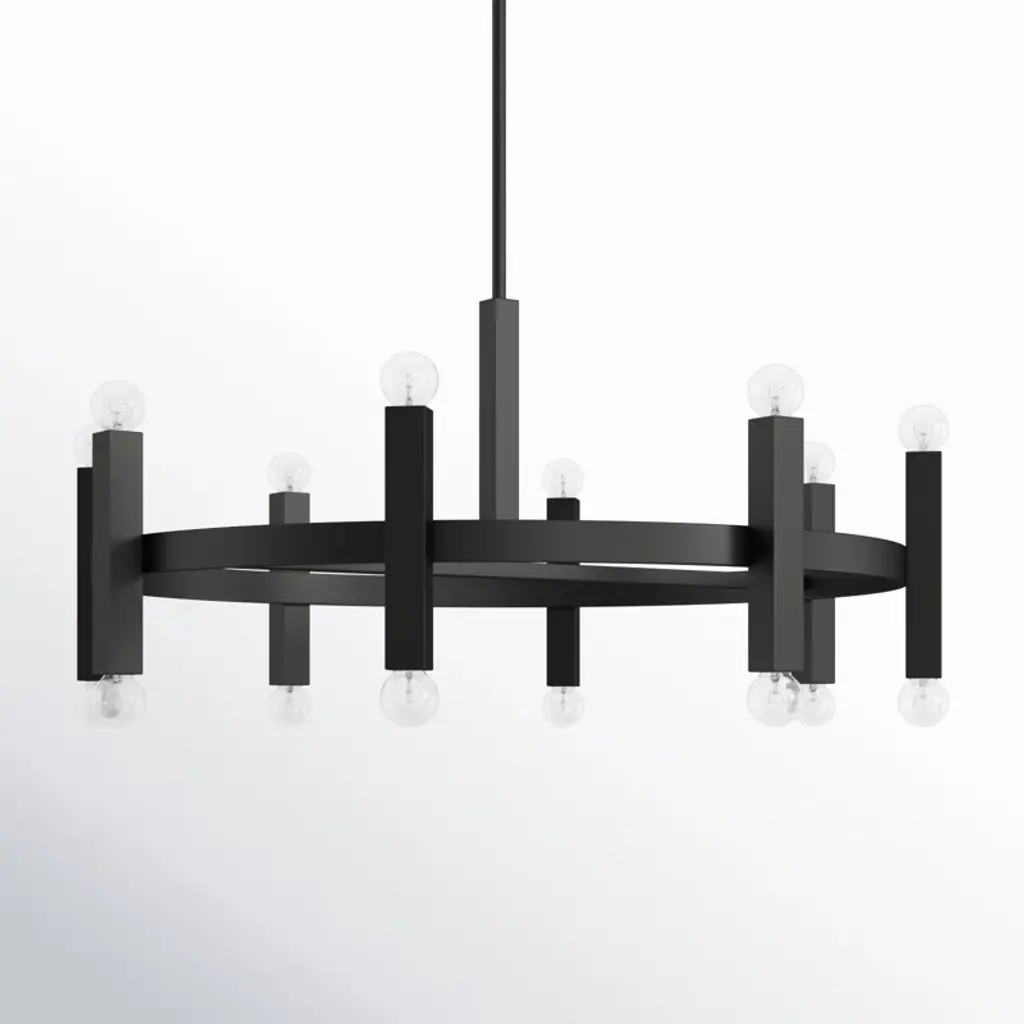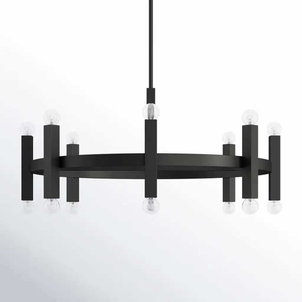 This 16-light chandelier offers a sleek, modern take on a classic wagon wheel fixture. It's made from metal with a neutral finish, tying together nearly any entryway or dining room. This chandelier features a small circular canopy, streamlined cylindrical downrod, and a horizontal circle lined by 8 vertical rods. On both ends of each rod is an exposed, 60W bulb (sold separately), illuminating your space with multi-directional light. This chandelier is height adjustable, dimmer-switch compatible, and sloped-ceiling adaptable.