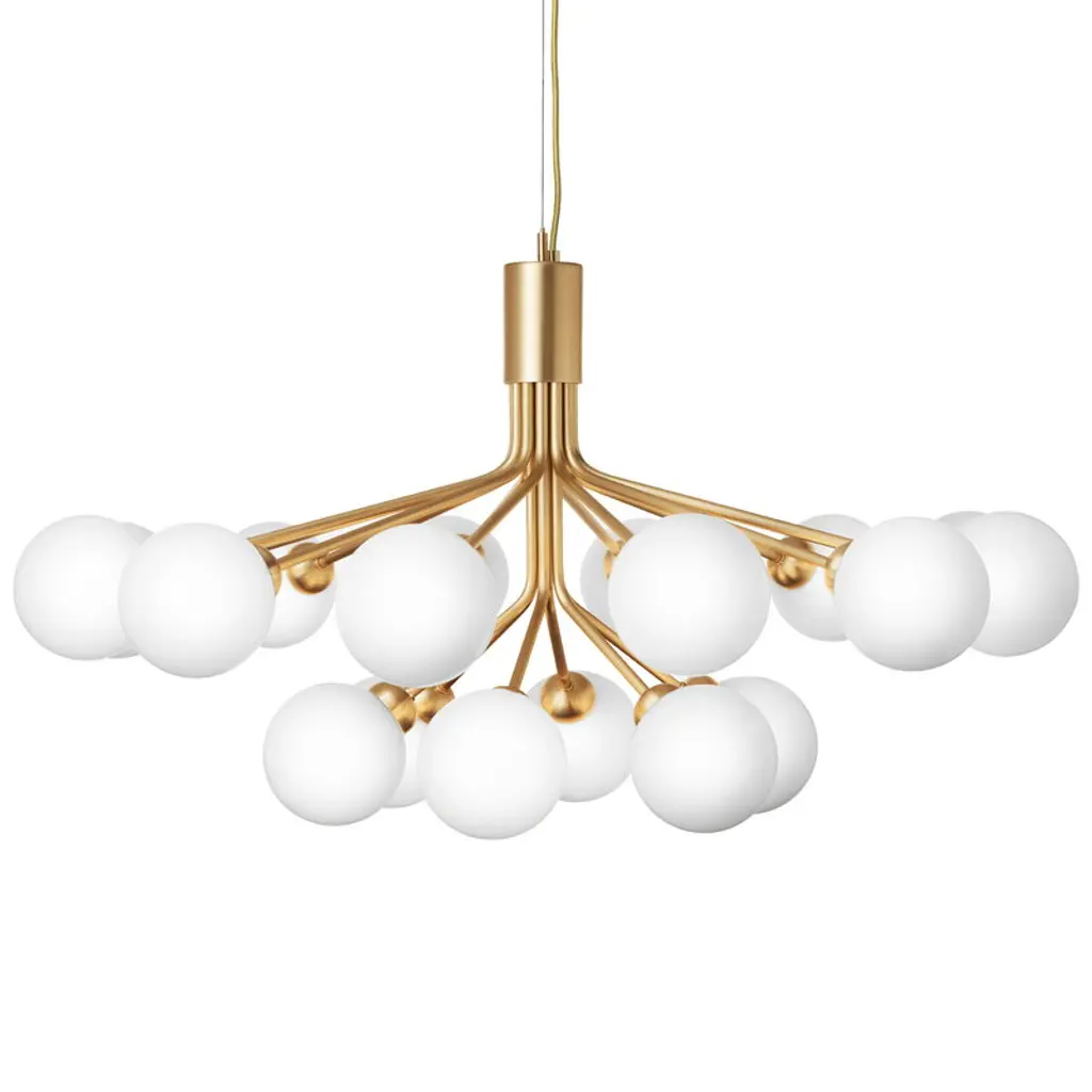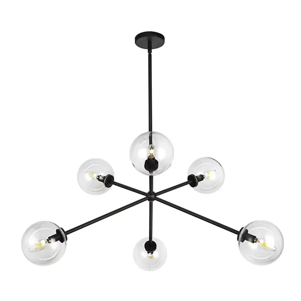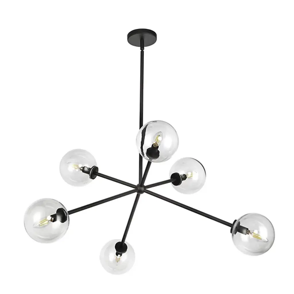 An open, elegant salute to mid-century modern design. The Cassia Chandelier from Alora Mood revives Sputnik-style design in a pleasing update, extending slim, angular arms out to all sides, securing candelabra lamping beneath a globe-shaped shade of opal glass. An excellent choice over a kitchen or dining room table, the translucent diffuser texture of the diffusers cuts any direct glare in exchange for a soft, mellow glow.
