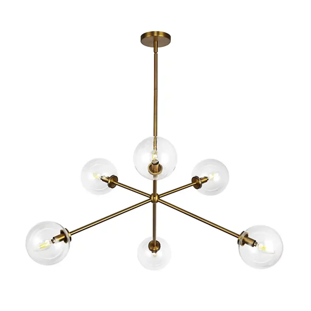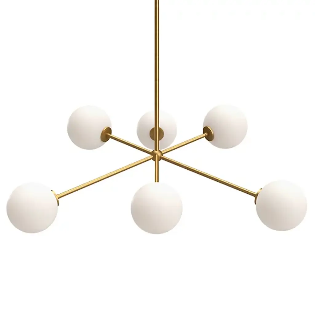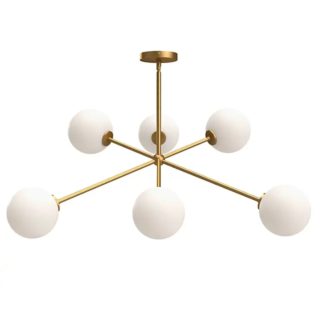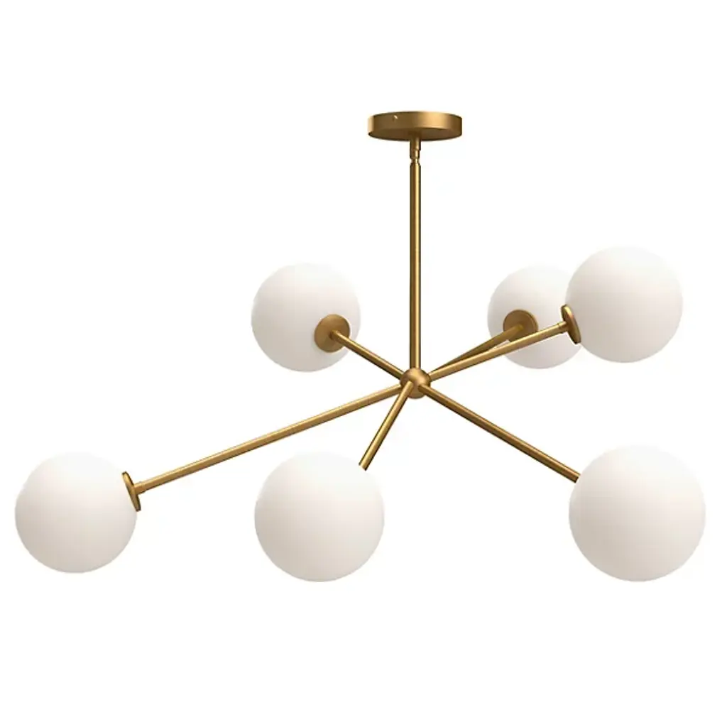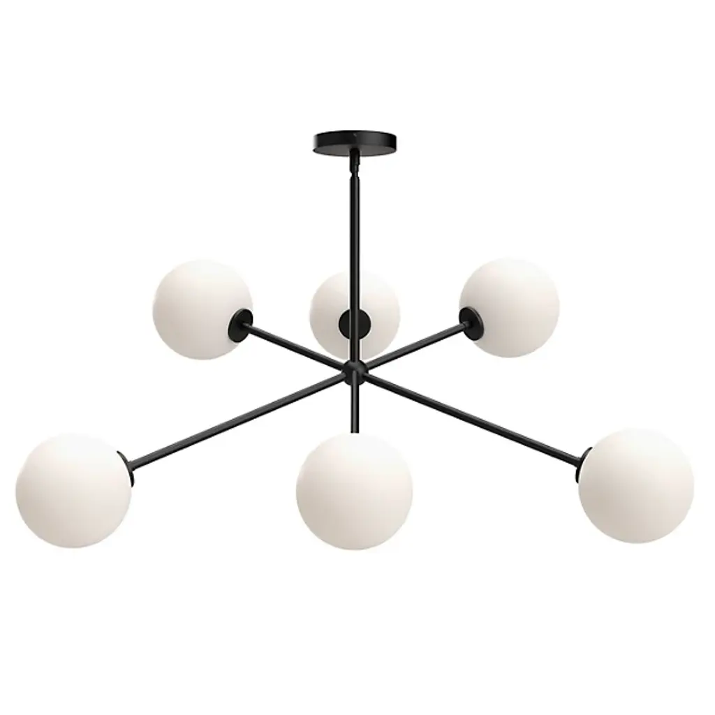 An open, elegant salute to mid-century modern design. The Cassia Chandelier from Alora Mood revives Sputnik-style design in a pleasing update, extending slim, angular arms out to all sides, securing candelabra lamping beneath a globe-shaped shade of opal glass. An excellent choice over a kitchen or dining room table, the translucent diffuser texture of the diffusers cuts any direct glare in exchange for a soft, mellow glow.