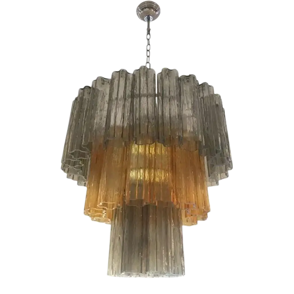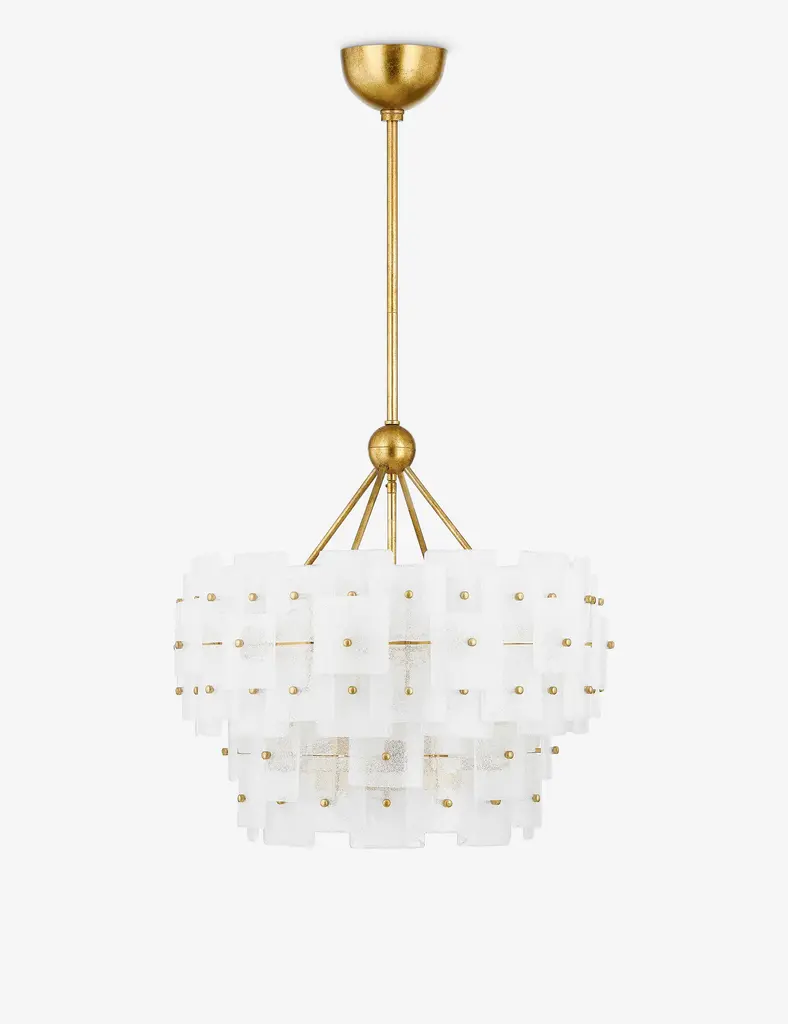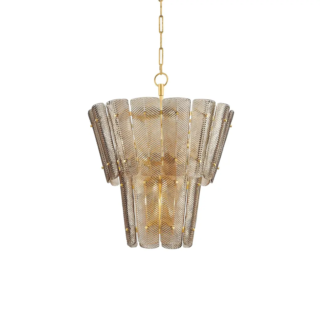 Inspired by Parisian design aesthetics, this graceful tiered glass chandelier is a showstopper. Slender plates of fluted piastre glass are secured to a delicate framework with fine, jewelry-like pins. The glass features an optic chevron pattern that mimics the pattern on leaves, adding textural depth. Features