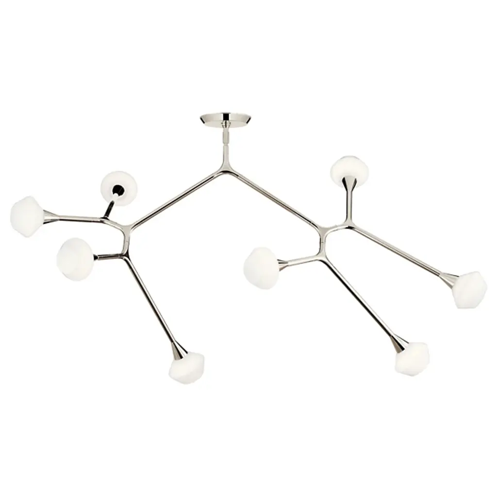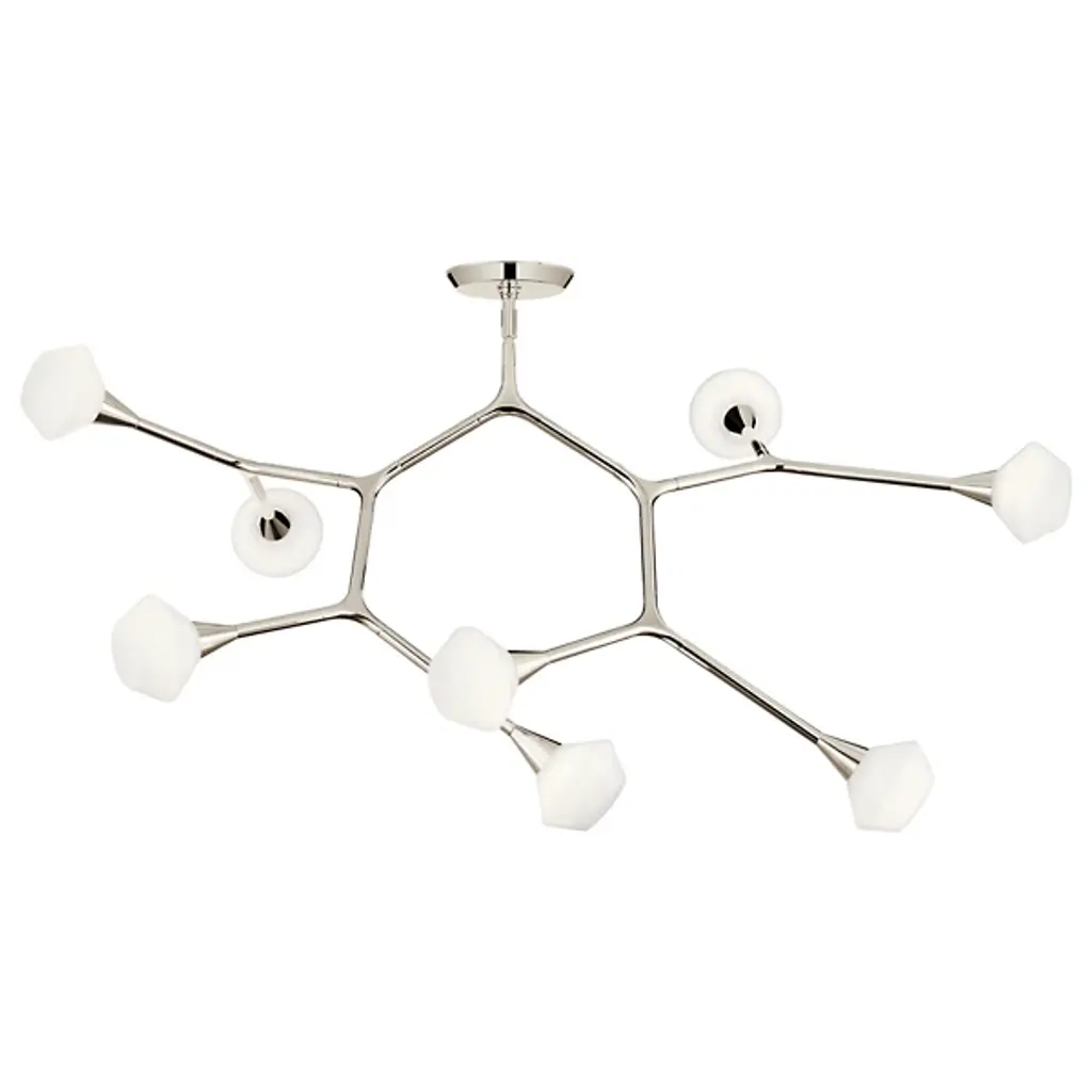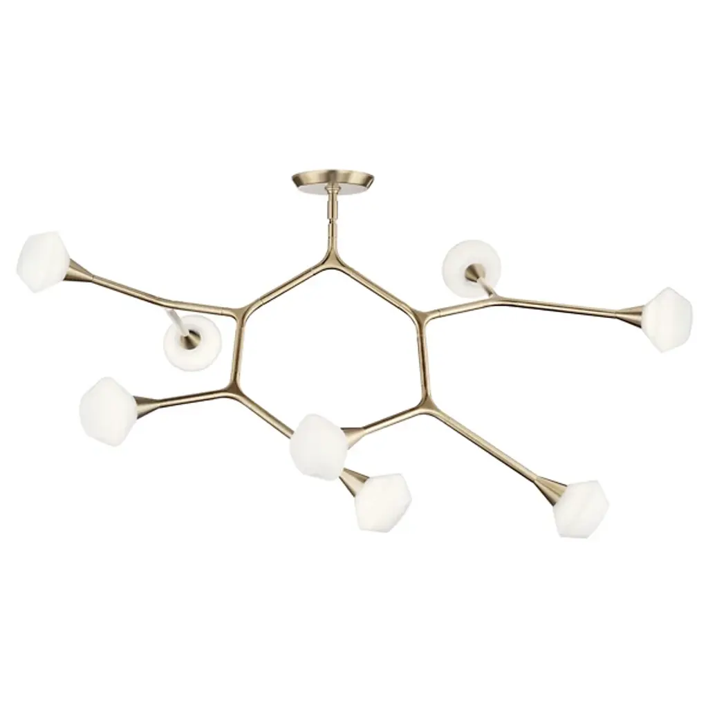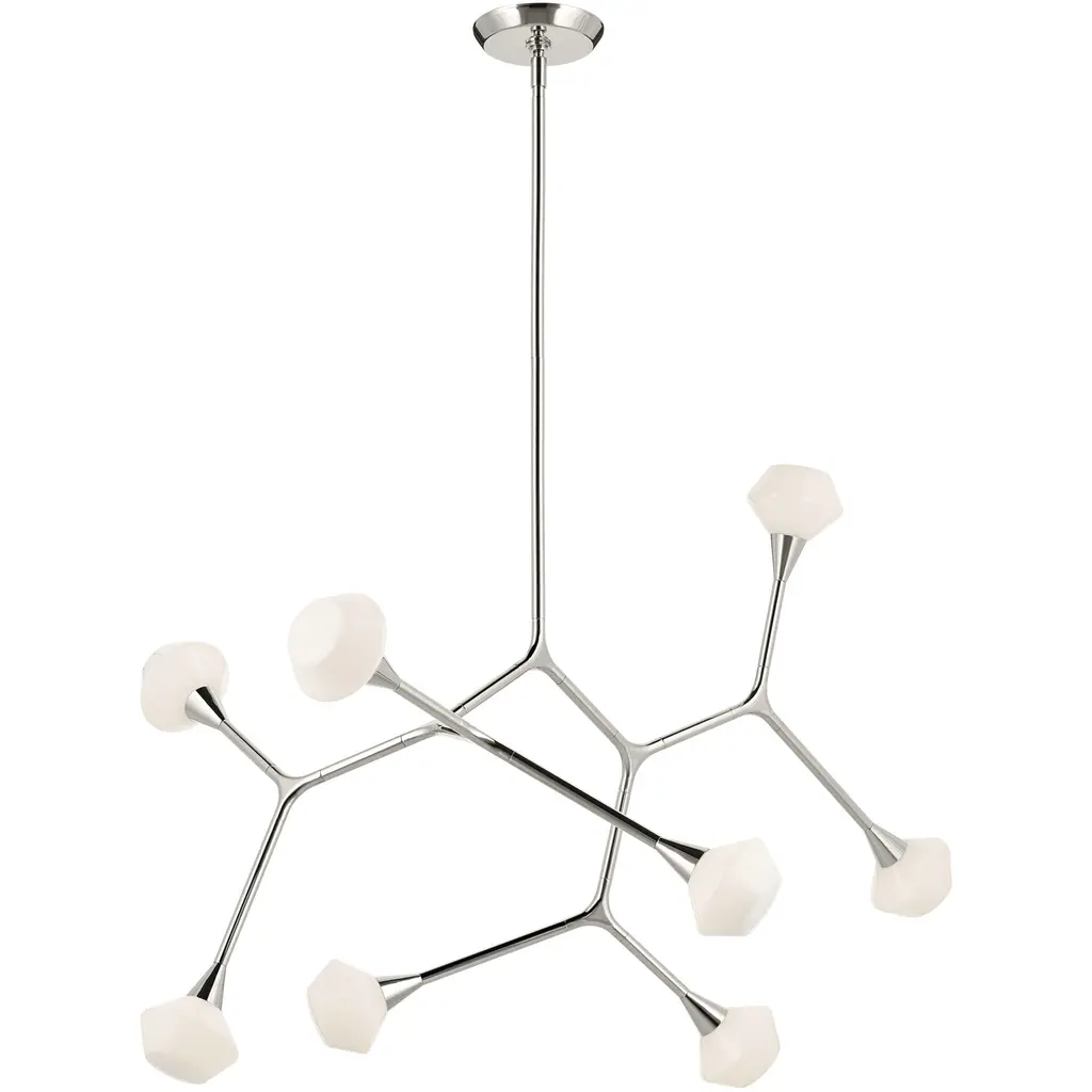 The Cassius Convertible 8 Light Chandelier from Kichler brings a modern character to interior ceilings with a celestial touch. Supported by a slender steel structure descending from a beveled ceiling canopy, this versatile fixture features adjustable arms that radiate outward, each ending in a glowing opal glass diffuser. The gemlike shades cast a soft, even light, each one highlighting the metal framework and allowing for customizable arrangements. Whether expanded outward or arranged for more compact spaces, it adds a dynamic, sculptural character that enhances spaces with graceful geometry and ambient warmth.