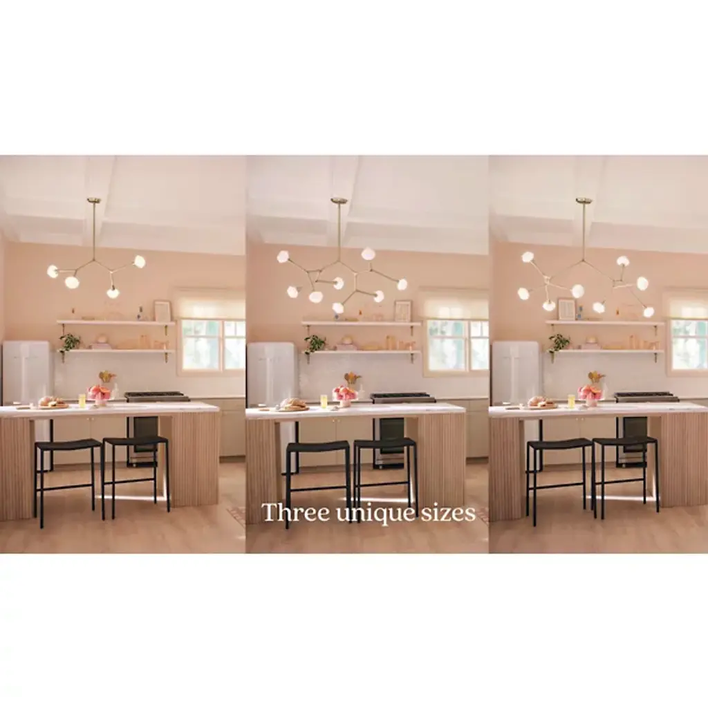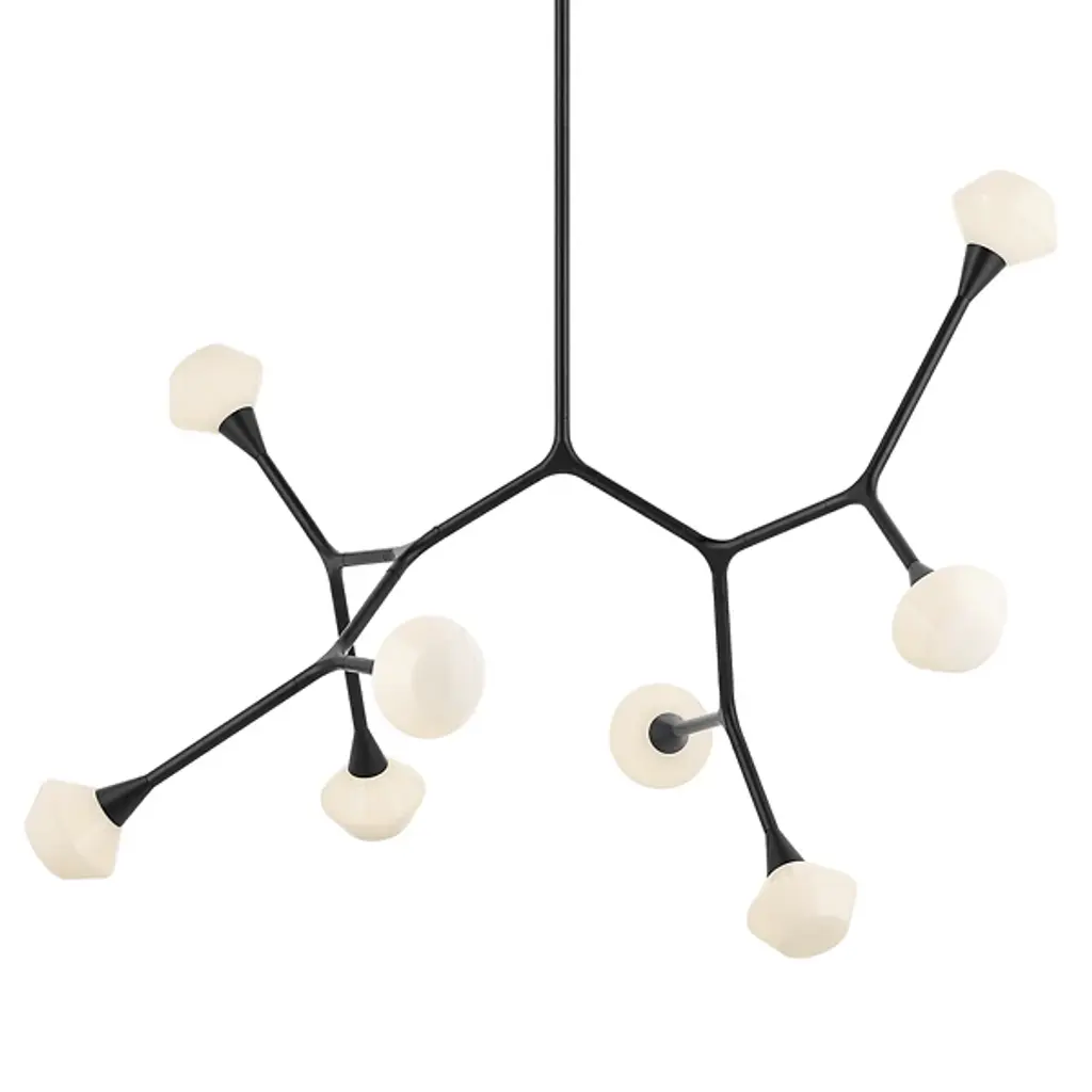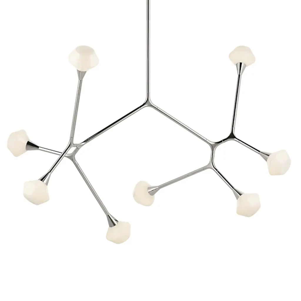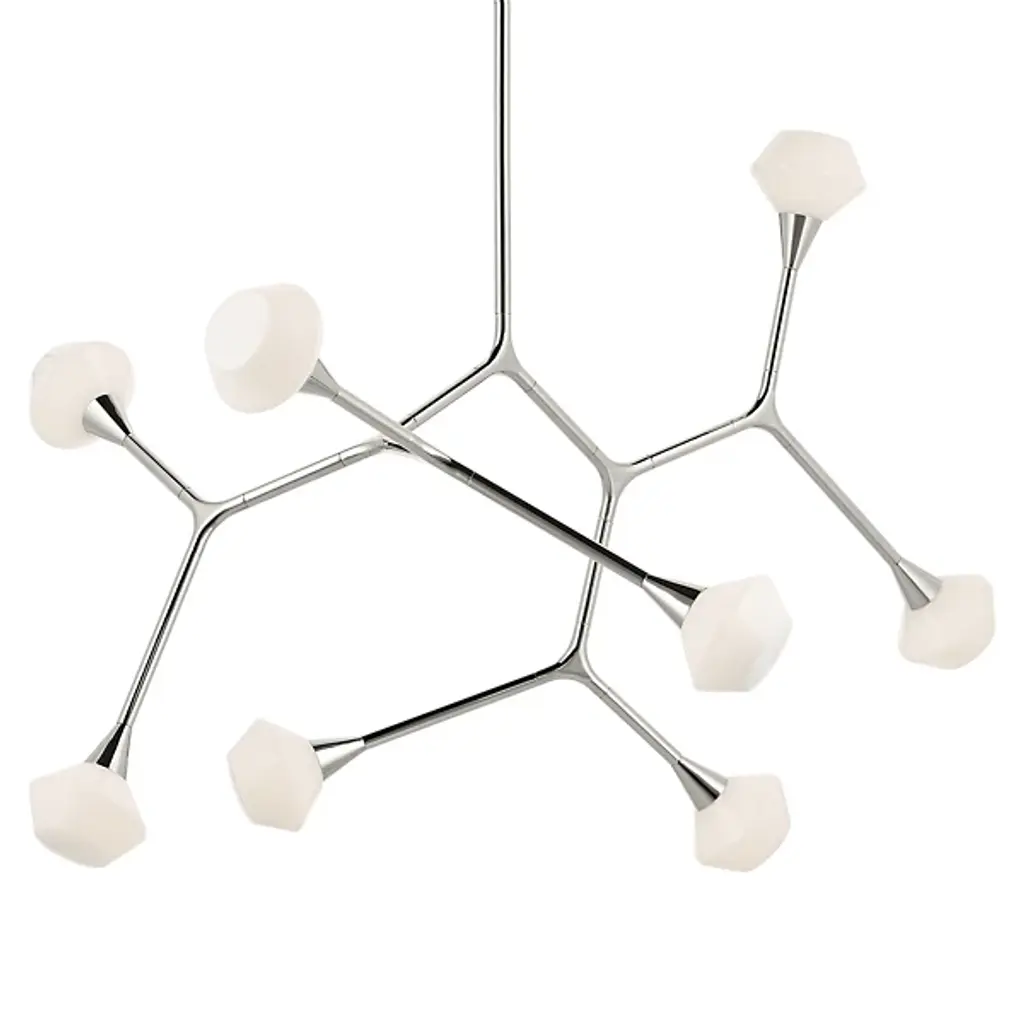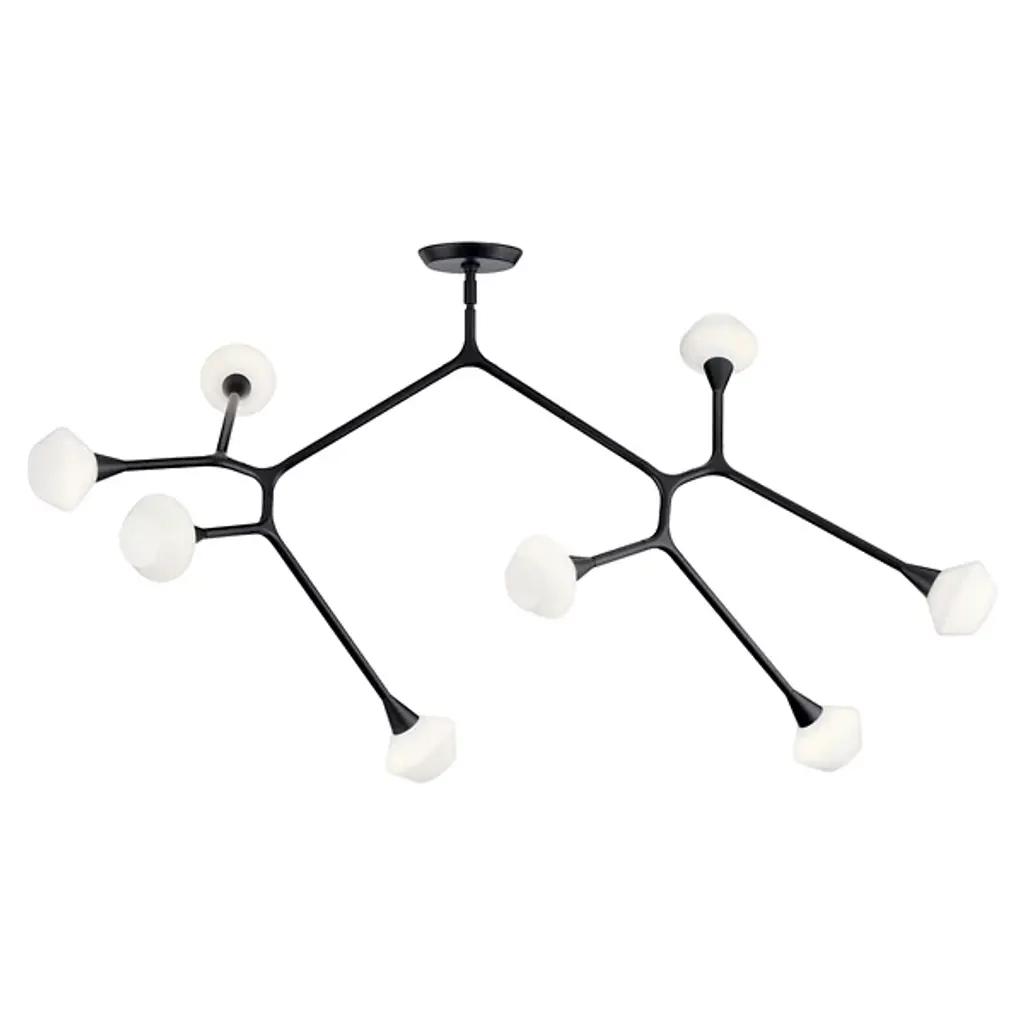 The Cassius Convertible 8 Light Chandelier from Kichler brings a modern character to interior ceilings with a celestial touch. Supported by a slender steel structure descending from a beveled ceiling canopy, this versatile fixture features adjustable arms that radiate outward, each ending in a glowing opal glass diffuser. The gemlike shades cast a soft, even light, each one highlighting the metal framework and allowing for customizable arrangements. Whether expanded outward or arranged for more compact spaces, it adds a dynamic, sculptural character that enhances spaces with graceful geometry and ambient warmth.
