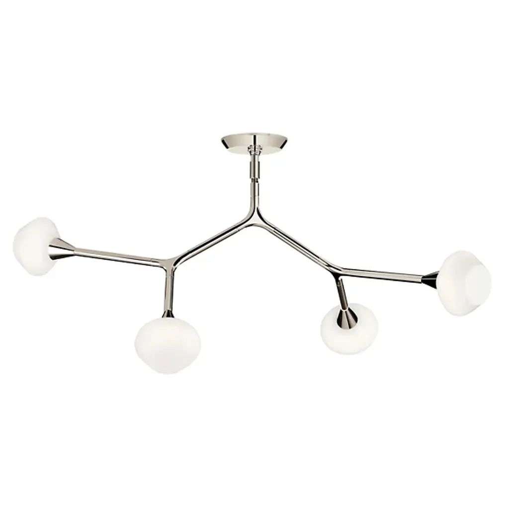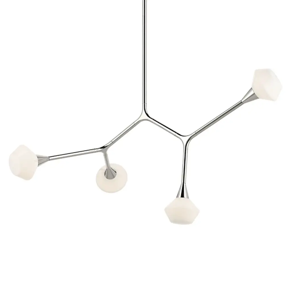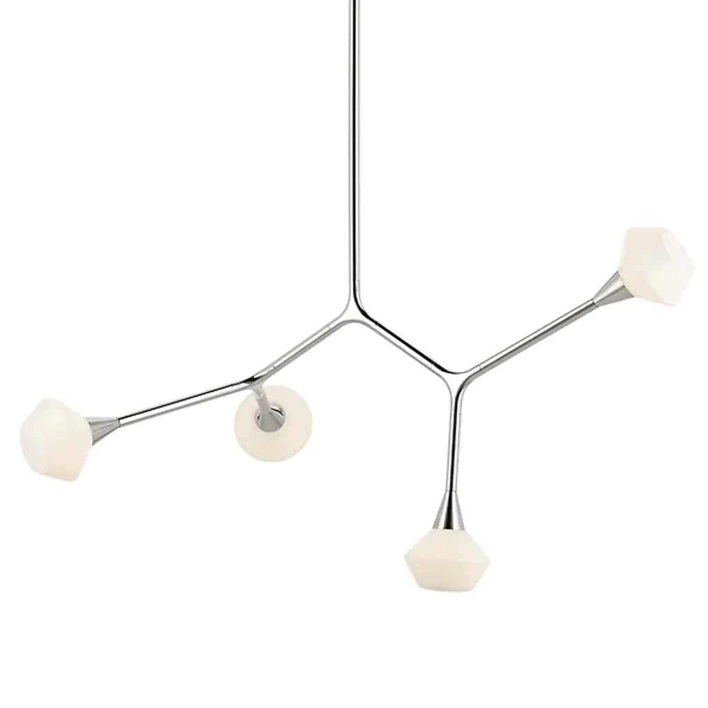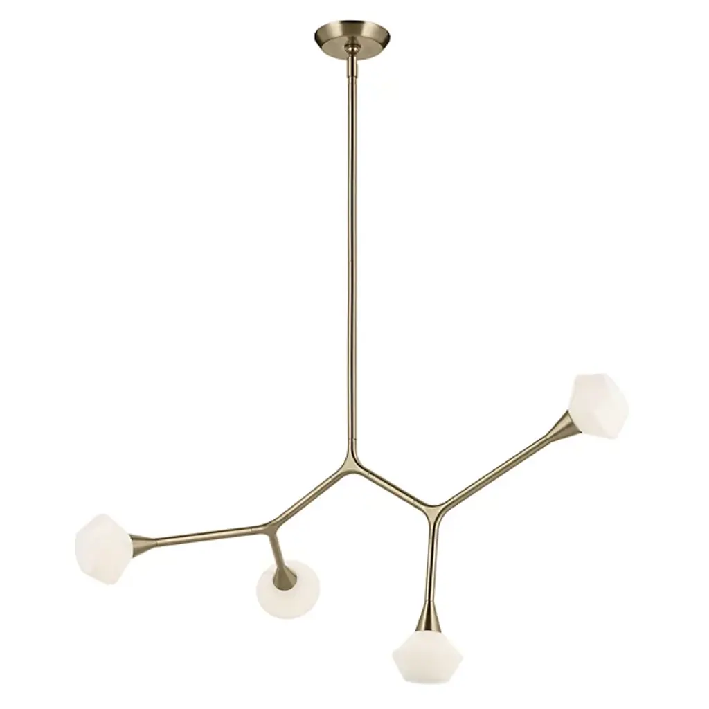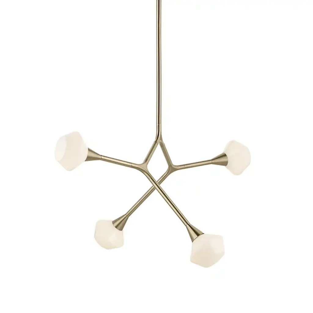 The Cassius Convertible Chandelier from Kichler adds a stellar-styled contemporary accompaniment to inside ceilings. A bevel-edged disc keeps the fixture in one place, transmitting a slender steel stem down to branching arms with gemlike opal glass diffusers blooming from each end. The arms are adjustable, and can arrange each diffuser to shed a soft, even ambiance in a multitude of configurations, burnishing the metal while being able to bring a dynamic presence to its surroundings.