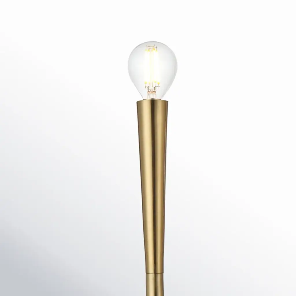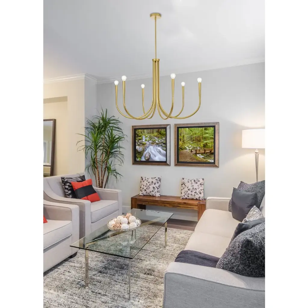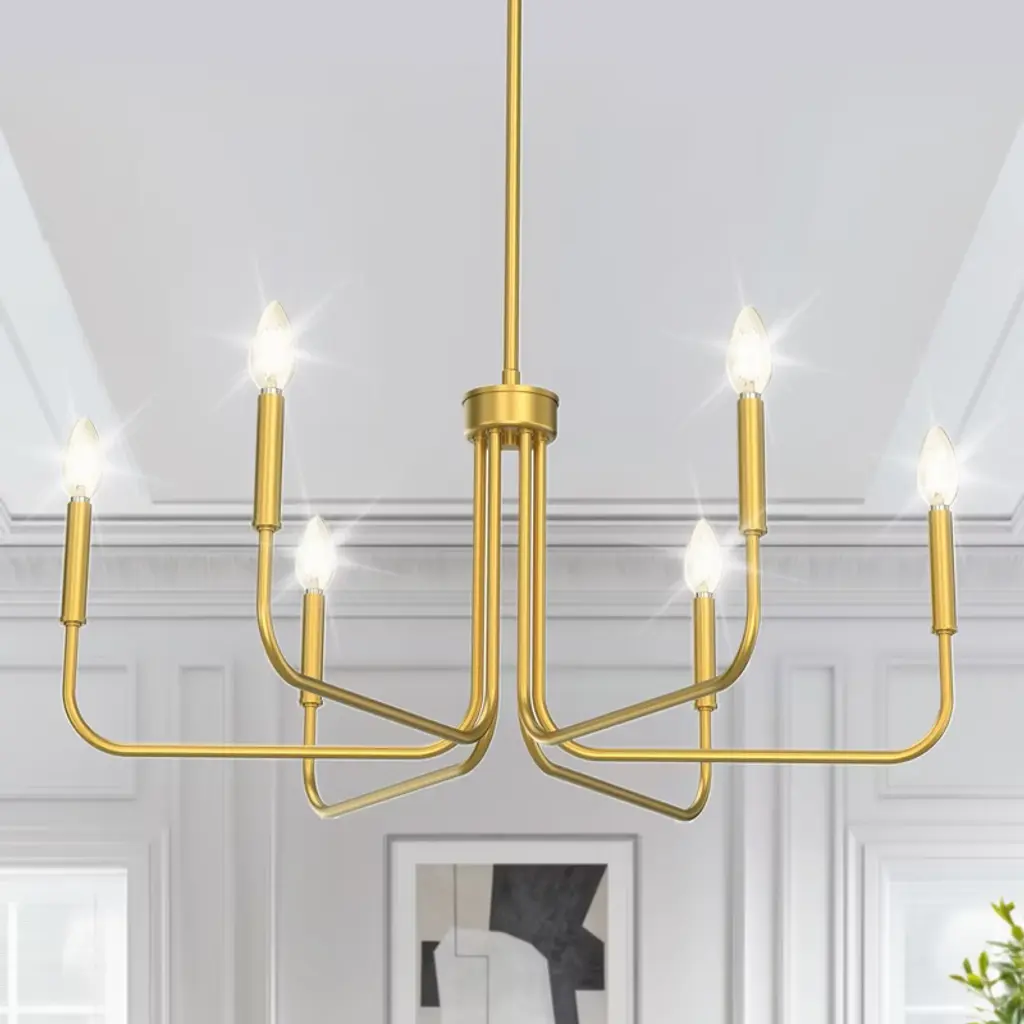 Light up your space with this classic chandelier. Six iron arms dramatically curve outward to create an eye-catching silhouette. At the end of each one is a single exposed bulb, sold separately and compatible with a dimmer switch. Downrods with an adjustable height offer customizable hanging, even in rooms with sloped ceilings.