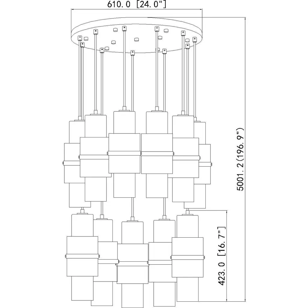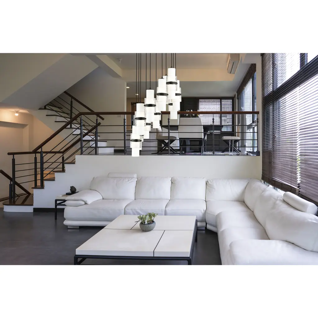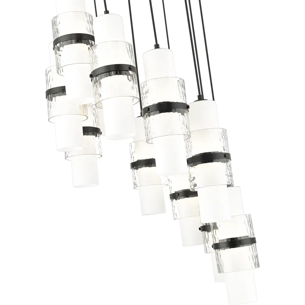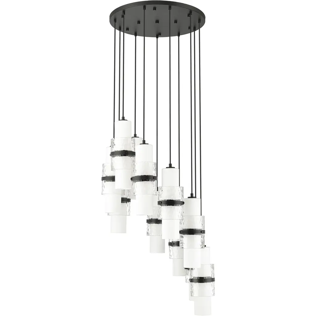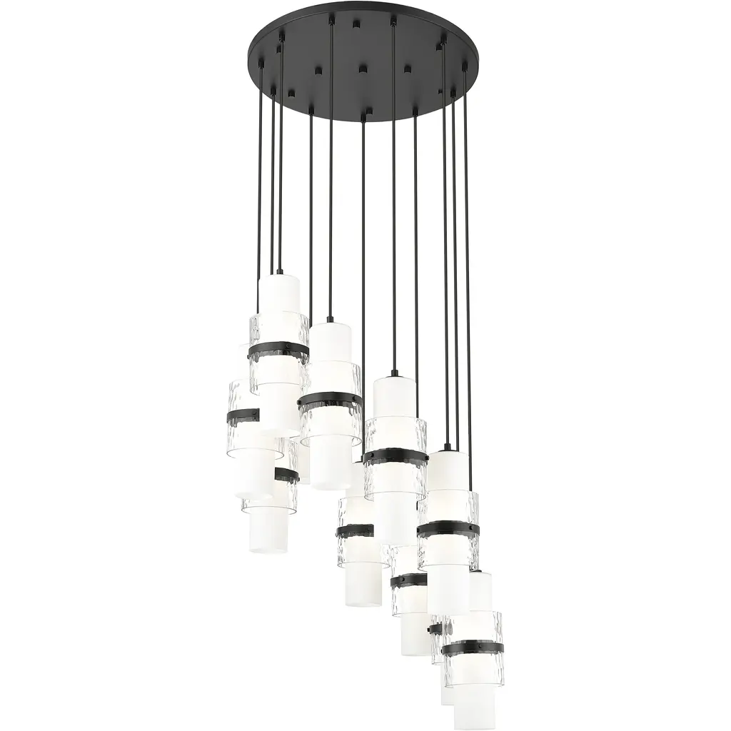 Stunning layers create rich dimension and depth for a modern 11-light chandelier. Surrounding each light, an etched opal glass cylinder is overlaid with clear textured glass and finished with a decorative matte black finish cuff, creating a bold look that complements over your dining table or living room.