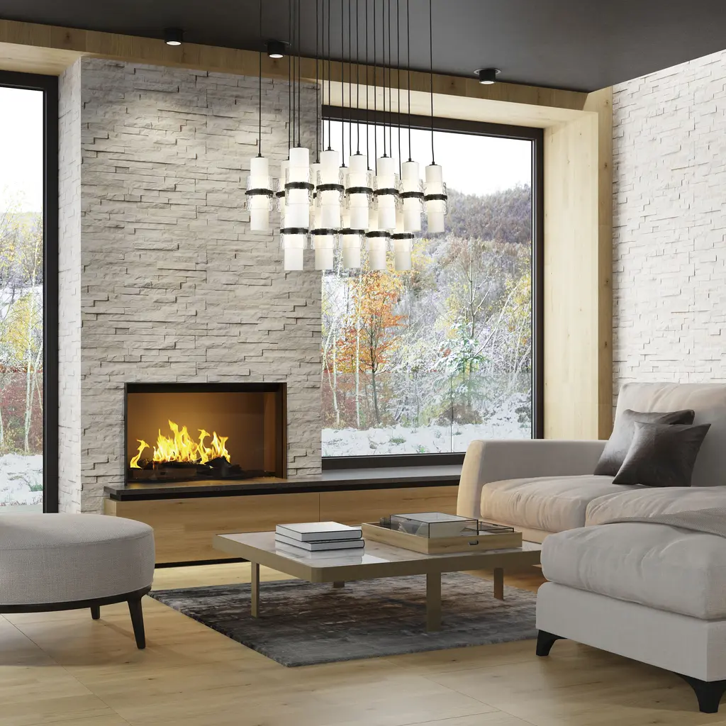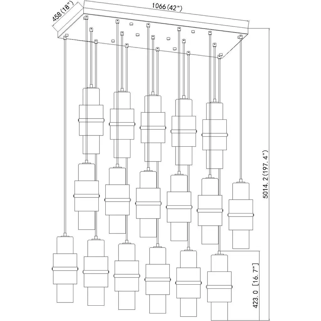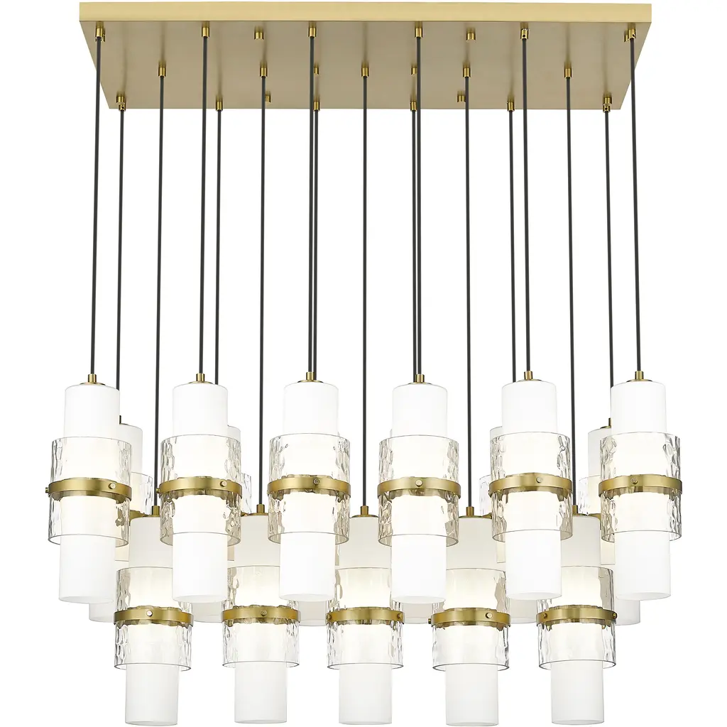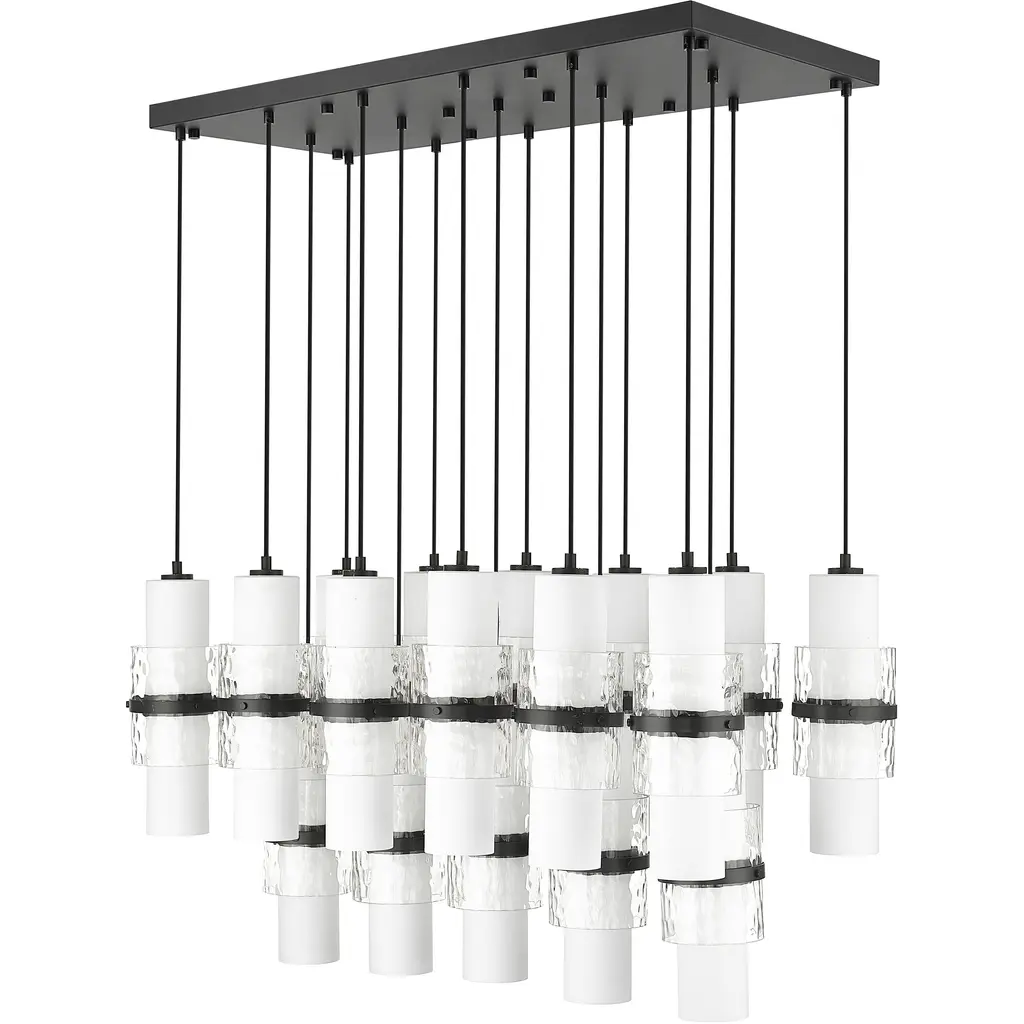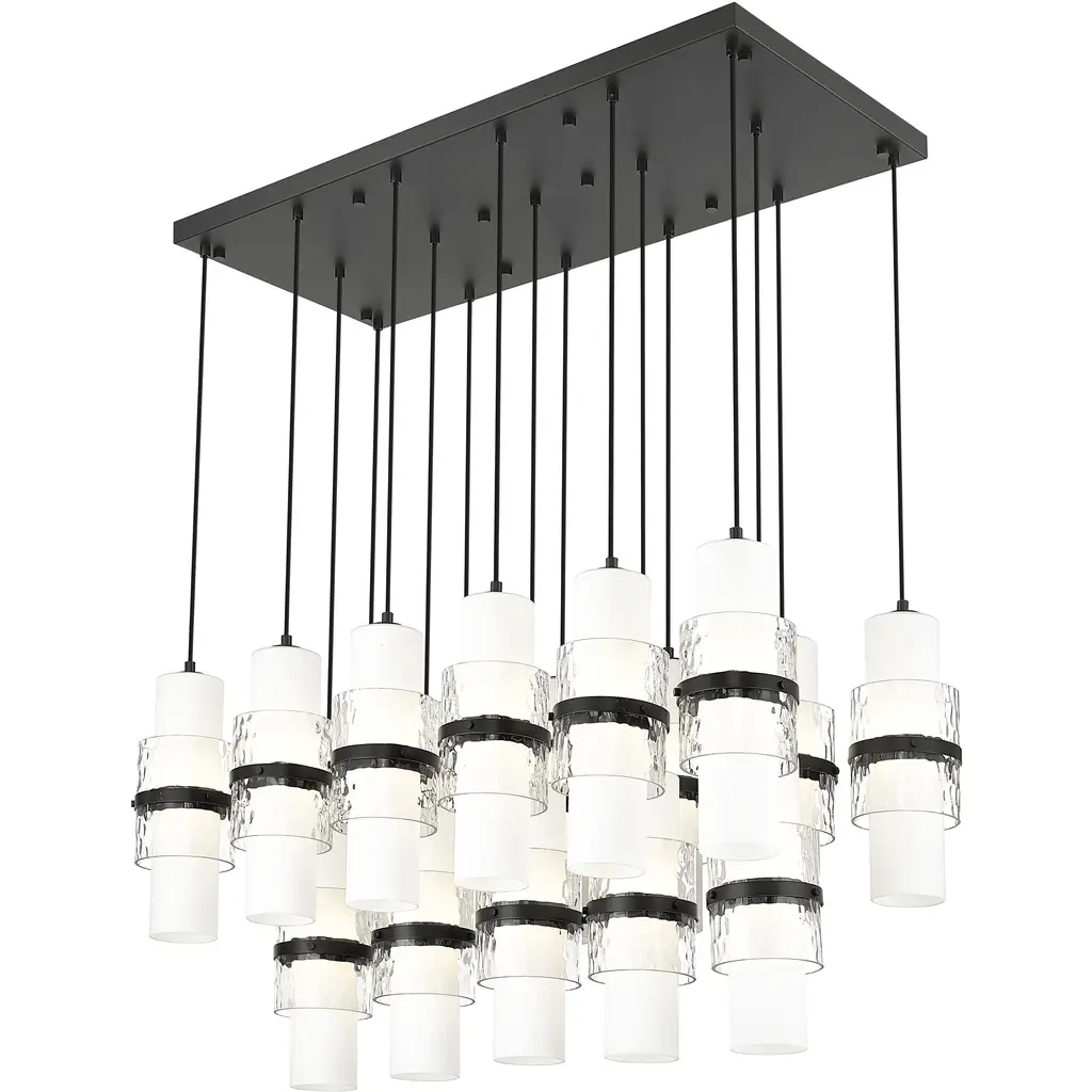 Create rich dimension and depth with the tiered design and linear framework of a modern 17-light chandelier. Three rows of lights create a spectacular display, each with a layered shade that begins with an etched opal glass cylinder, adds clear textured glass and is secured with a decorative cuff in a rich matte black finish to match its canopy. Braided cloth cord covers complete the look with fresh elegance, perfect for an island pendant in your kitchen or over a dining table.