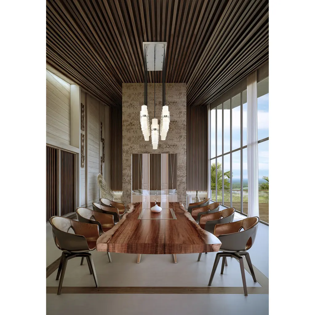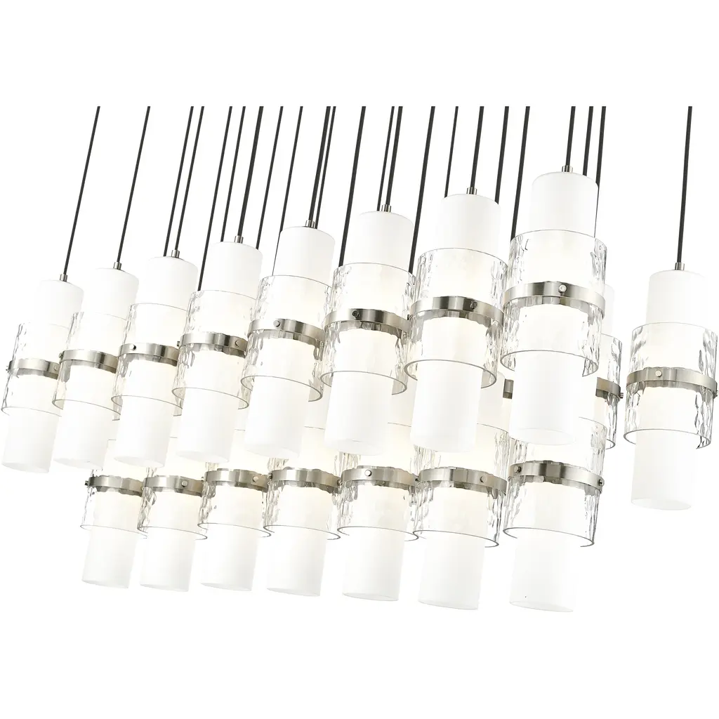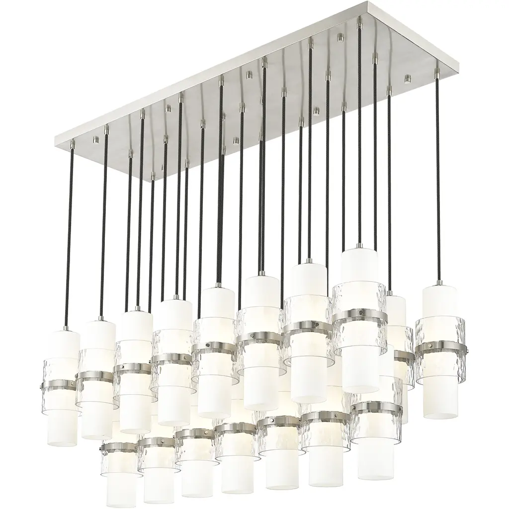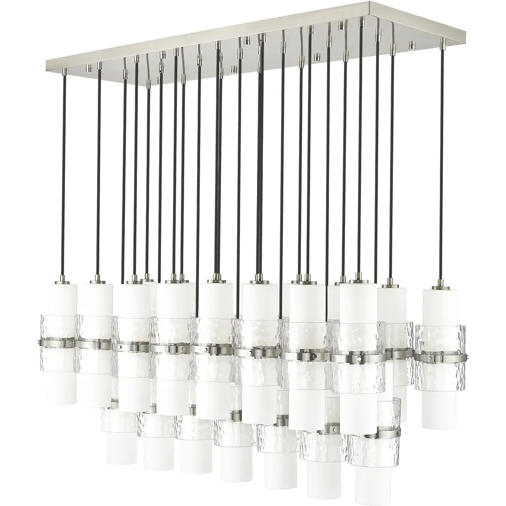 Tiered design and exquisite materials highlight a modern 23-light linear chandelier. Three rows of lights create a spectacular display, each with a layered shade that begins with an etched opal glass cylinder, adds clear textured glass and is secured with a decorative cuff in a rich brushed nickel finish to match its canopy. Braided cloth cord covers complete the look with fresh elegance, perfect for an island pendant in your kitchen or over a dining table.