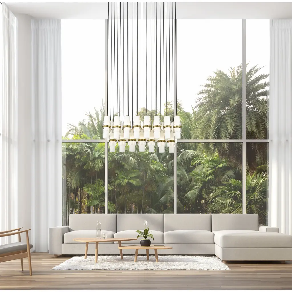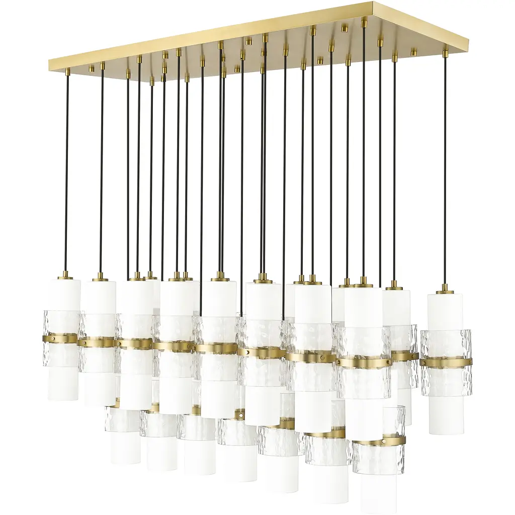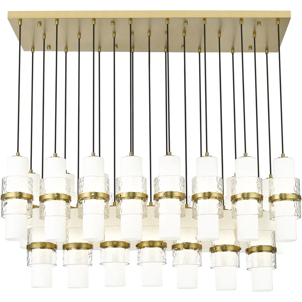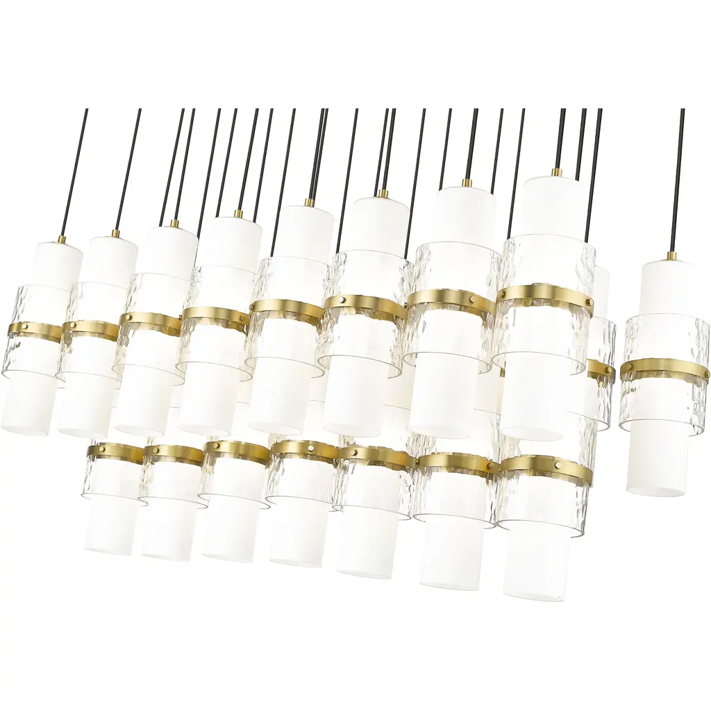 Tiered design and exquisite materials highlight a modern 23-light linear chandelier. Three rows of lights create a spectacular display, each with a layered shade that begins with an etched opal glass cylinder, adds clear textured glass and is secured with a decorative cuff in a rich modern gold finish to match its canopy. Braided cloth cord covers complete the look with fresh elegance, perfect for an island pendant in your kitchen or over a dining table.