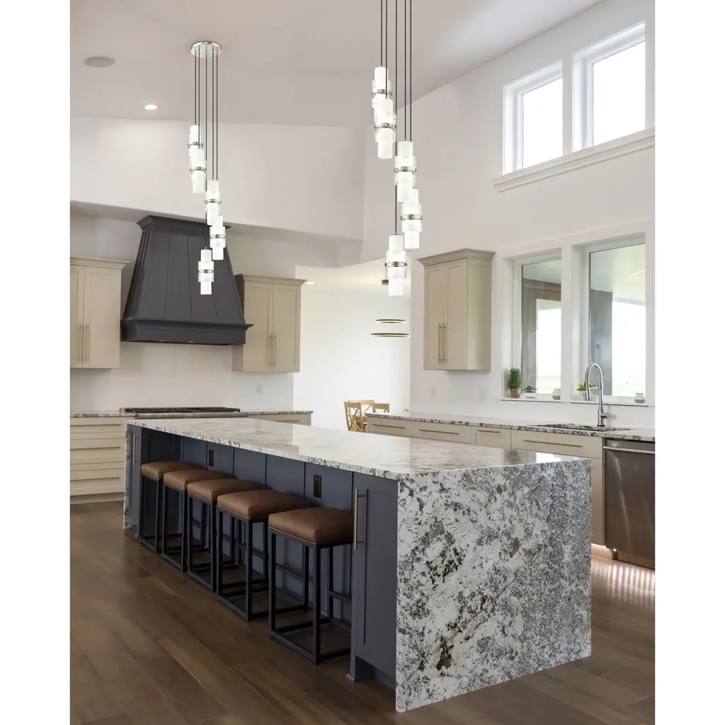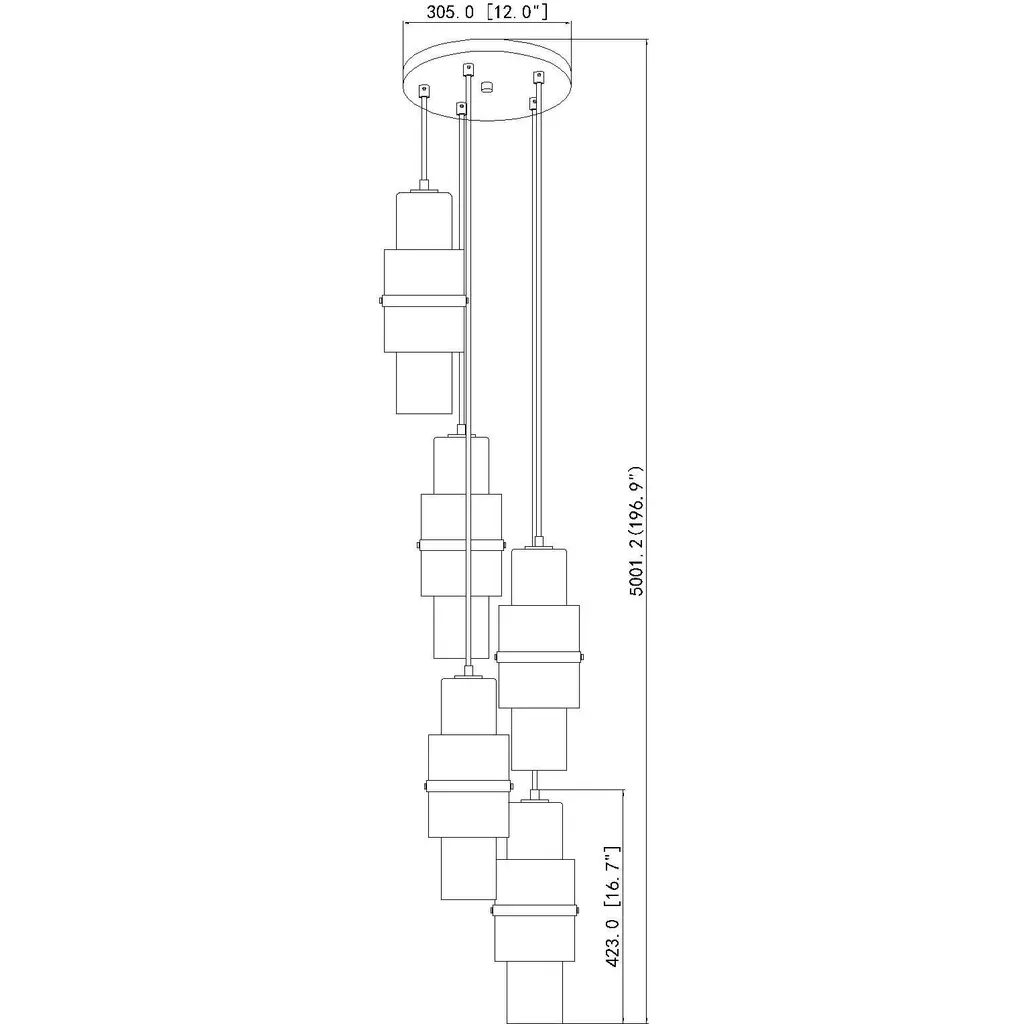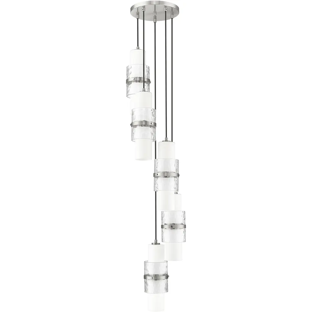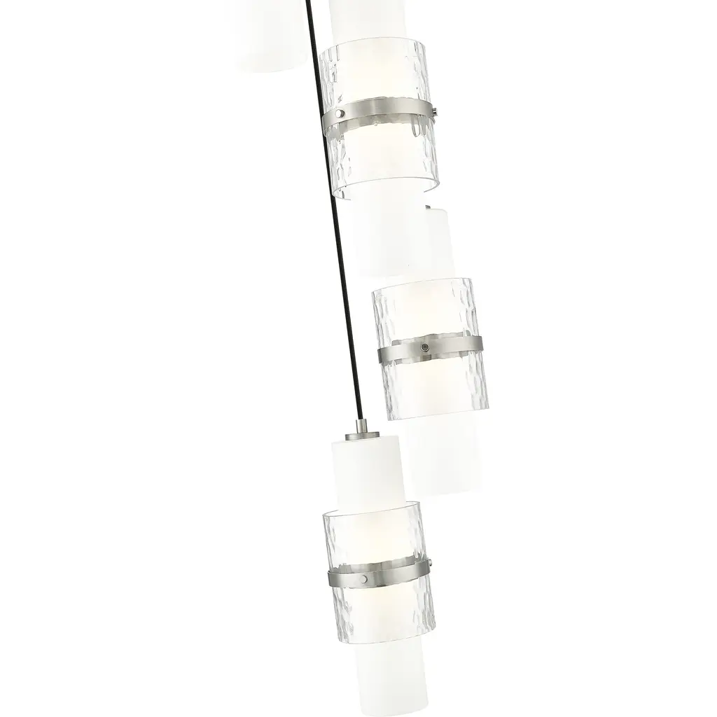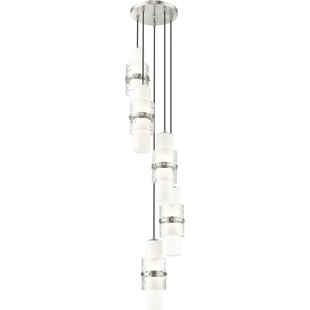 A chic spiral of cylindrical shades creates a compelling silhouette for this modern five-light chandelier. Perfect over a staircase or dining table, the chandelier features a brushed nickel finish canopy and decorative cuffs, which complement etched opal and clear textured glass cylinders that combine to create a stunning display.